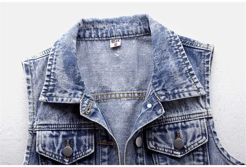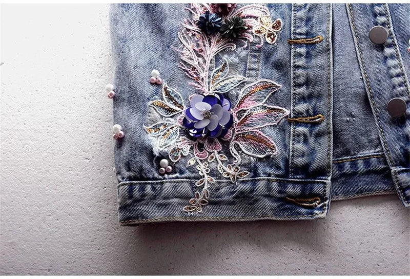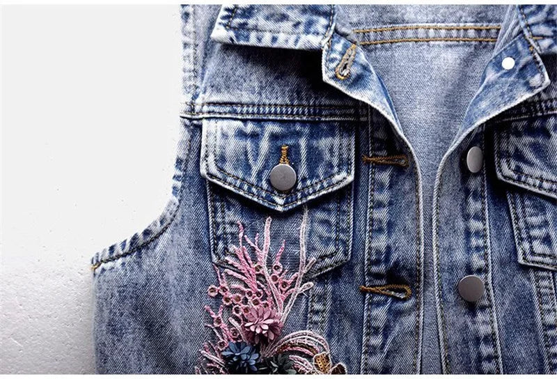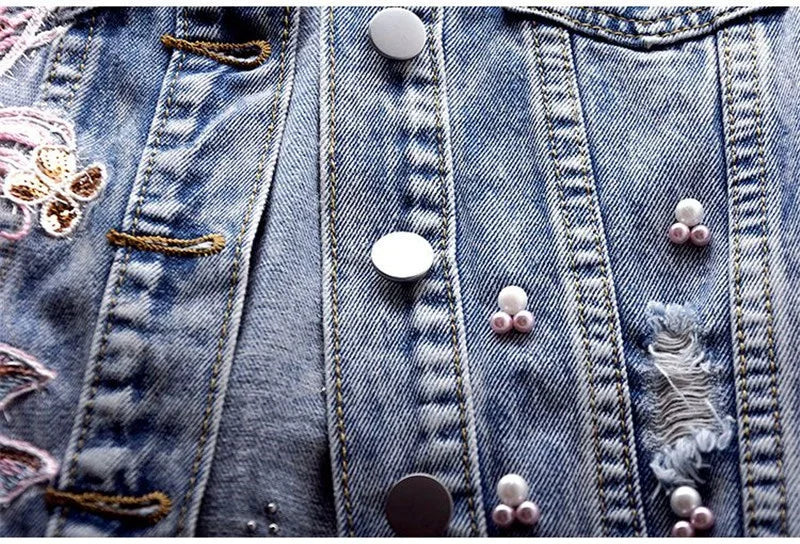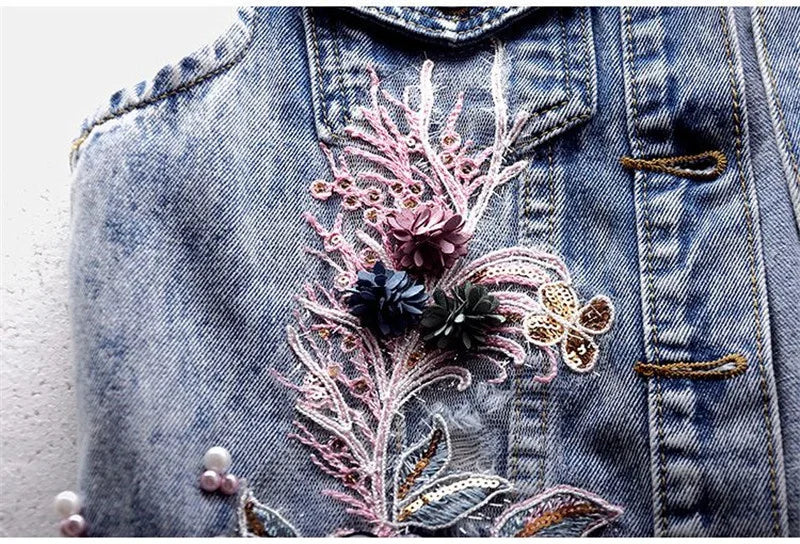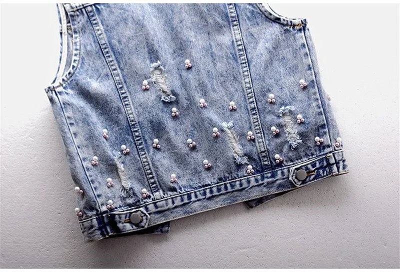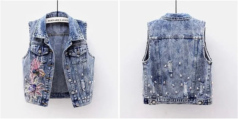 Women Denim Vest Jacket New Autumn Embroidery Beads Sleeveless Vintage Hole Jeans Vest Jacket Overcoat Female Tops Waistcoat