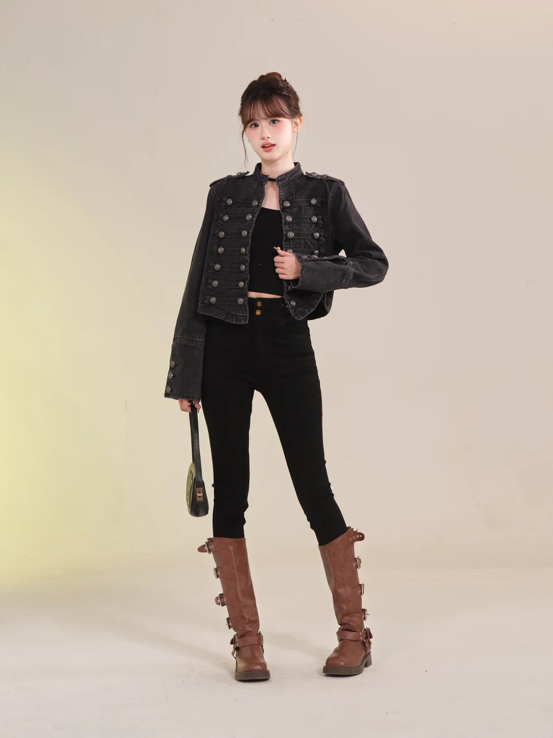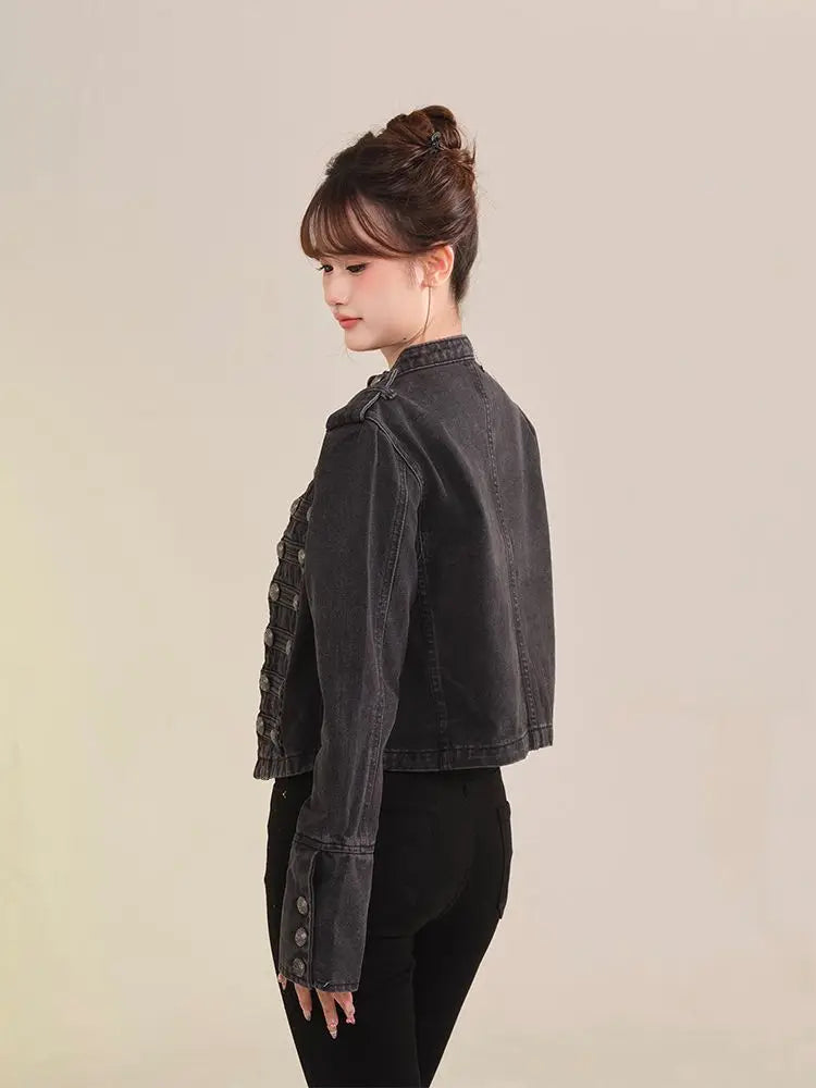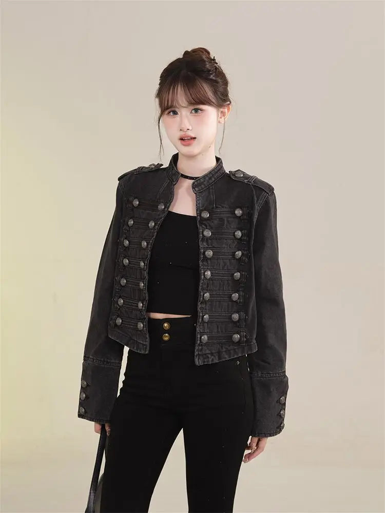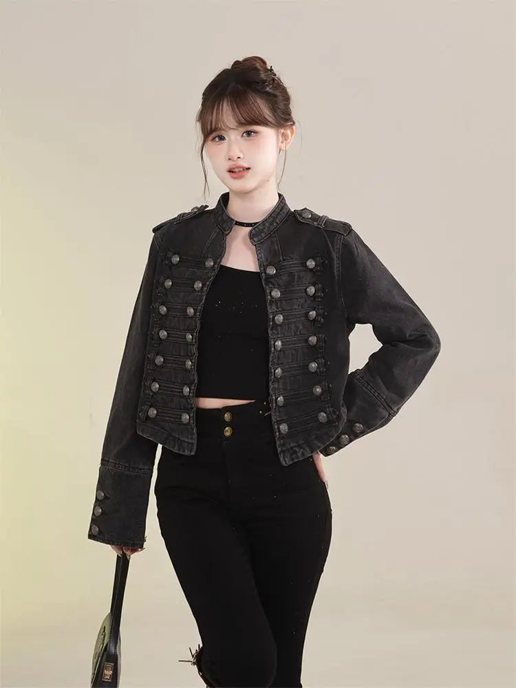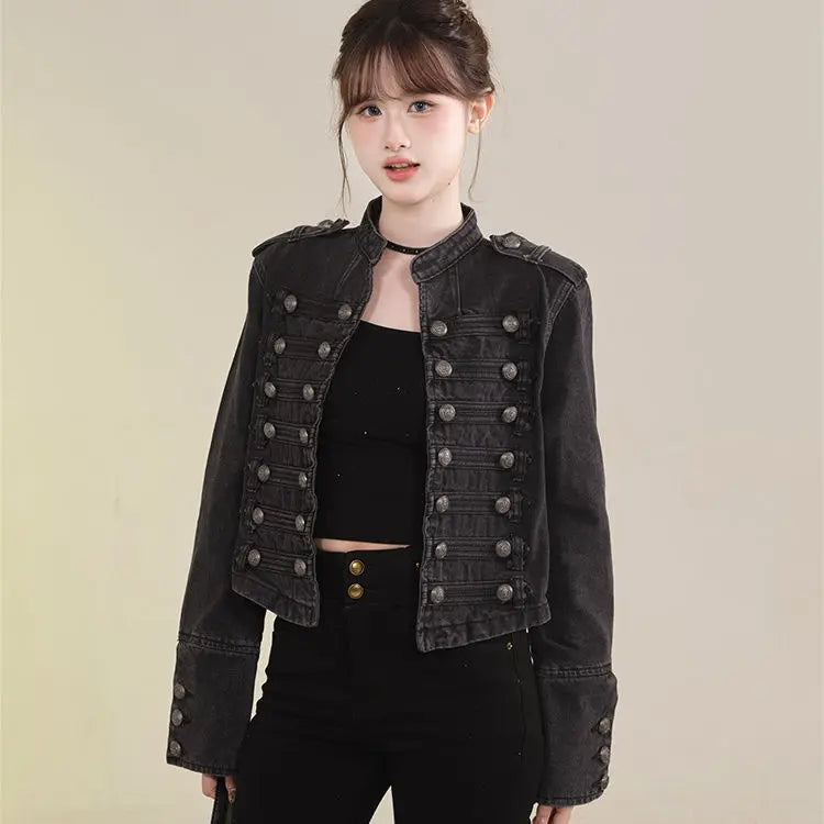 Women's American Retro Denim Military Inspired Cropped Jacket Long Sleeve Stand Collar Casual Motorcycle Coat