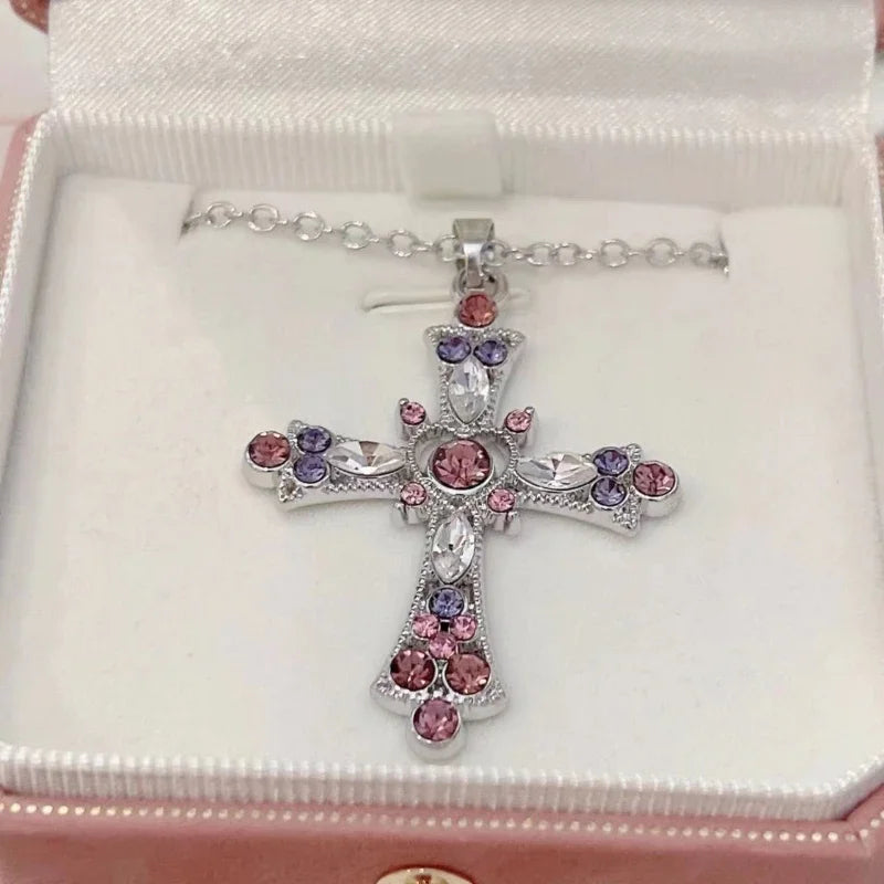 新作 Y2K パンク ピンク パープル ジルコン クロスネックレス レディース ラインストーンペンダント 鎖骨チェーン チャーム パーティージュエリーギフト