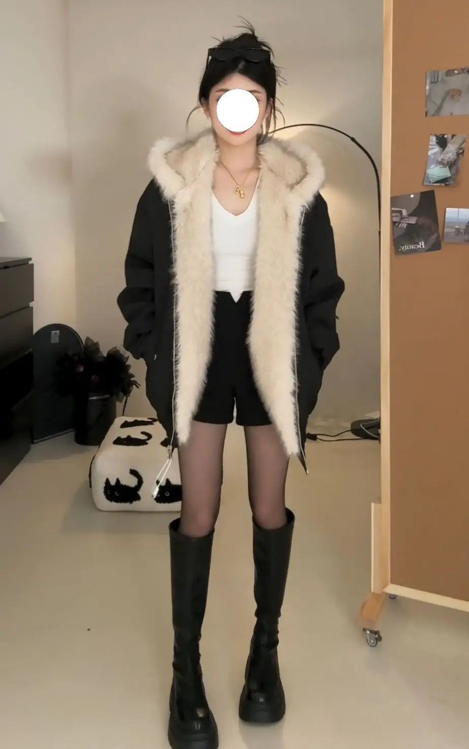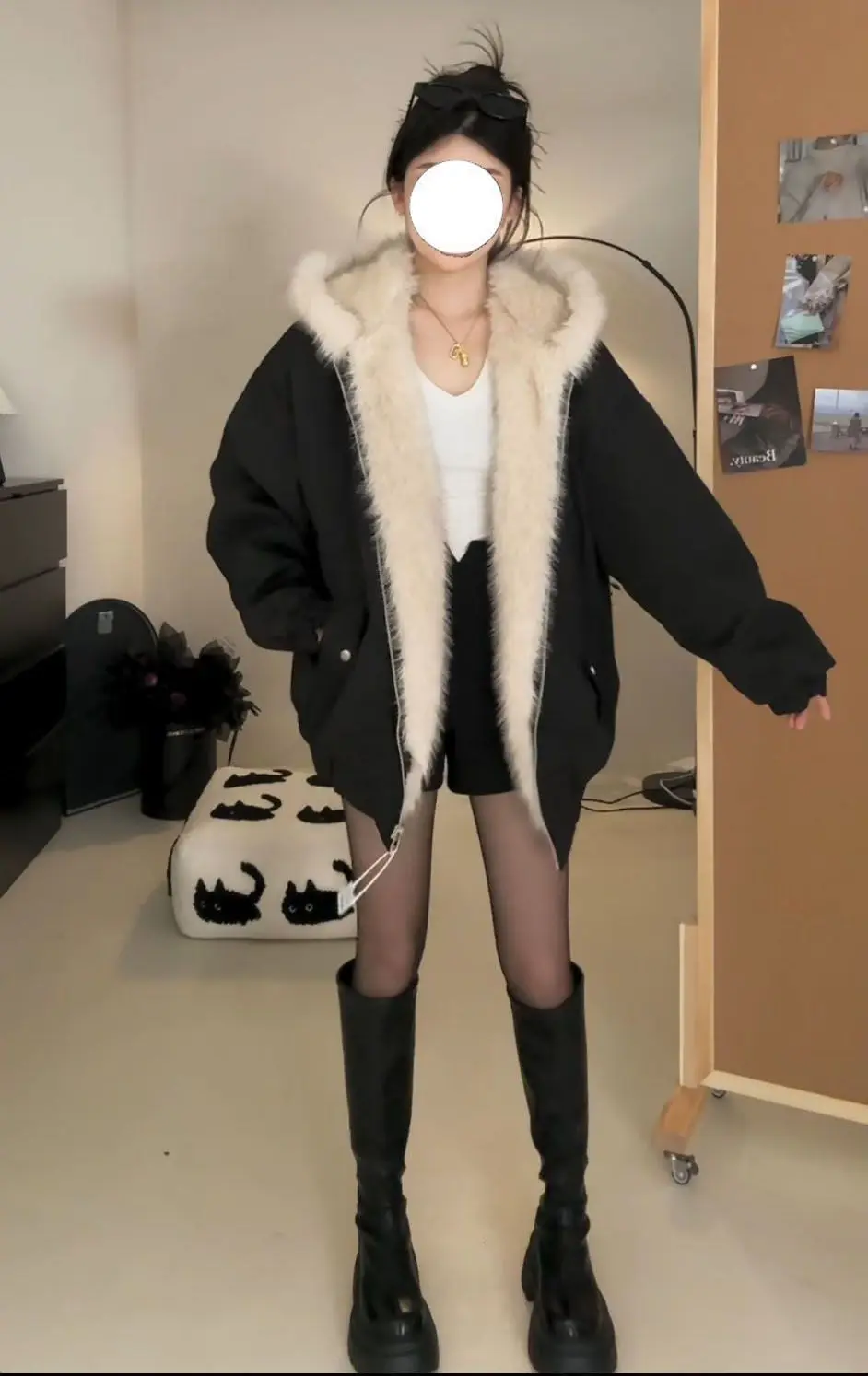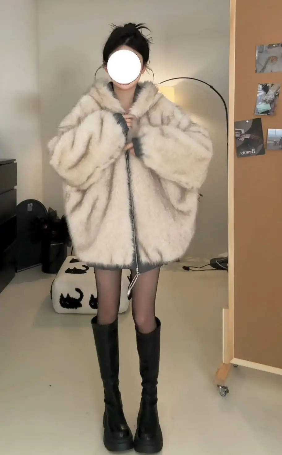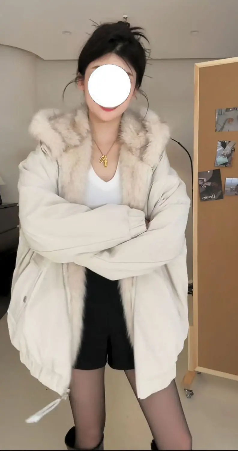 衣服スタイルの詳細:ジッパー、ファーカラー、ステッチ