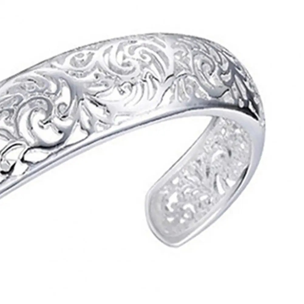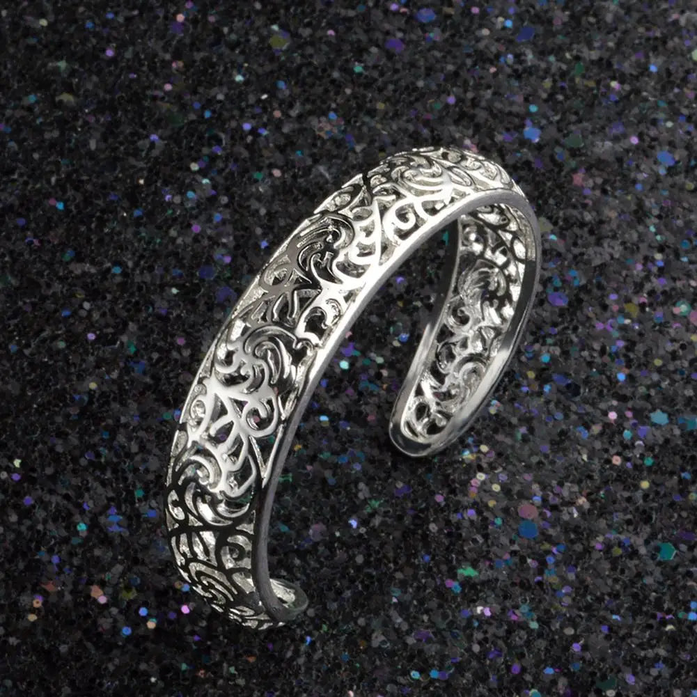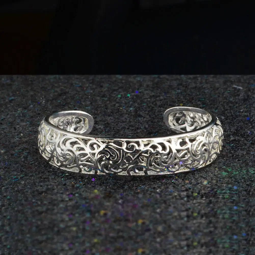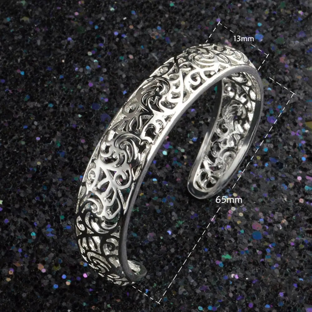 925シルバーカフブレスレットオープニング絶妙な中空レディースブレスレットシルバーカラー彫刻パターンレトロバングルパーティーリストジュエリー