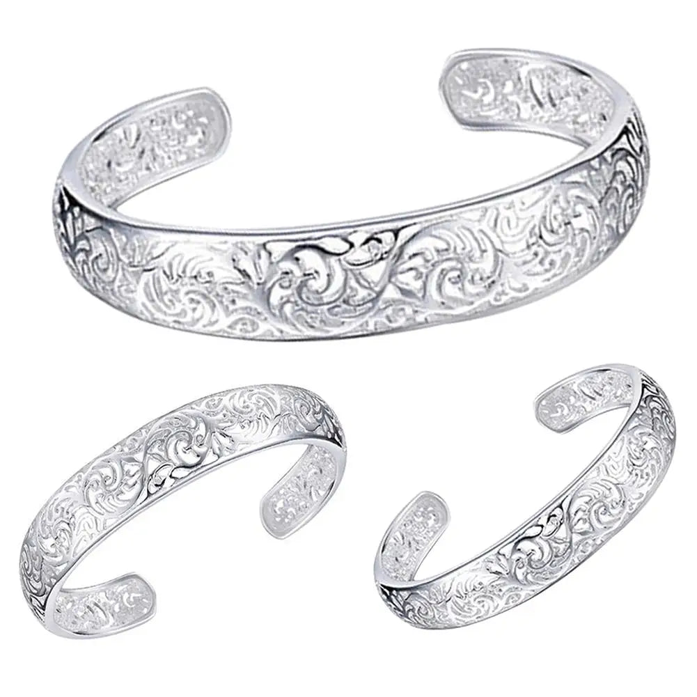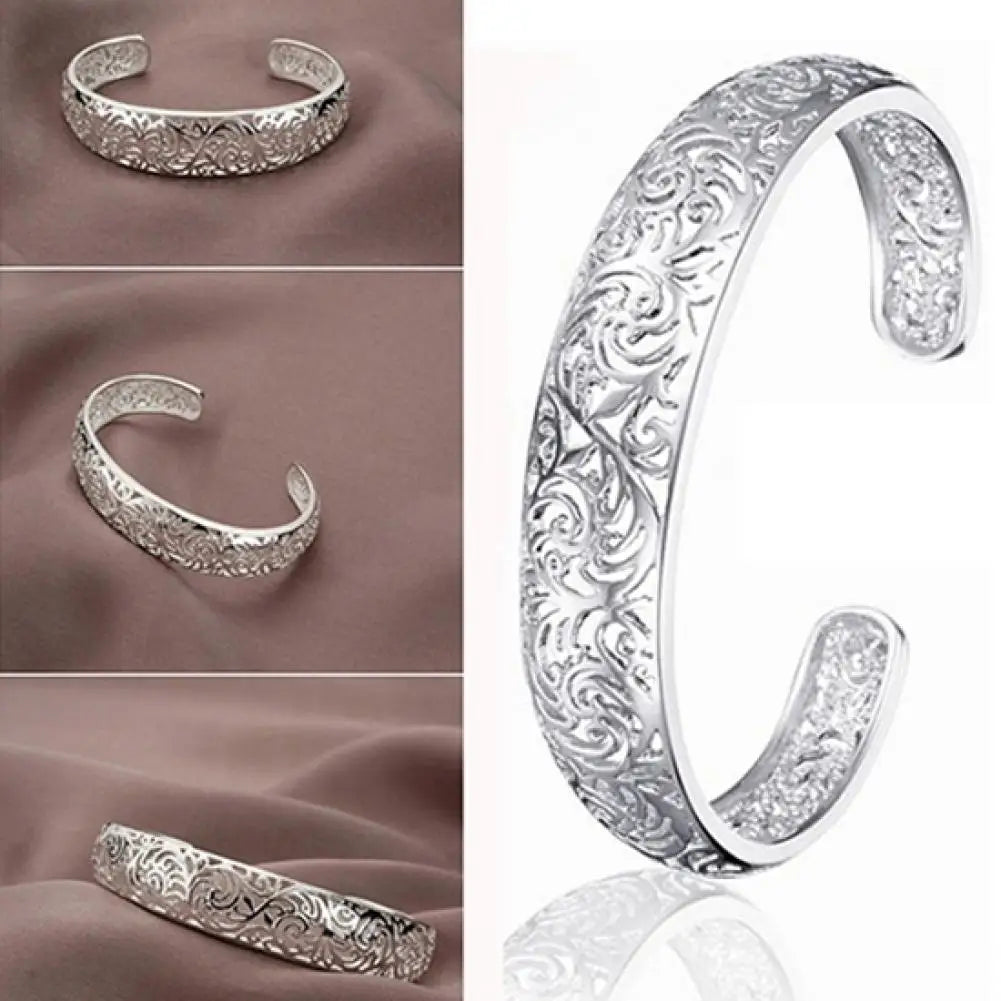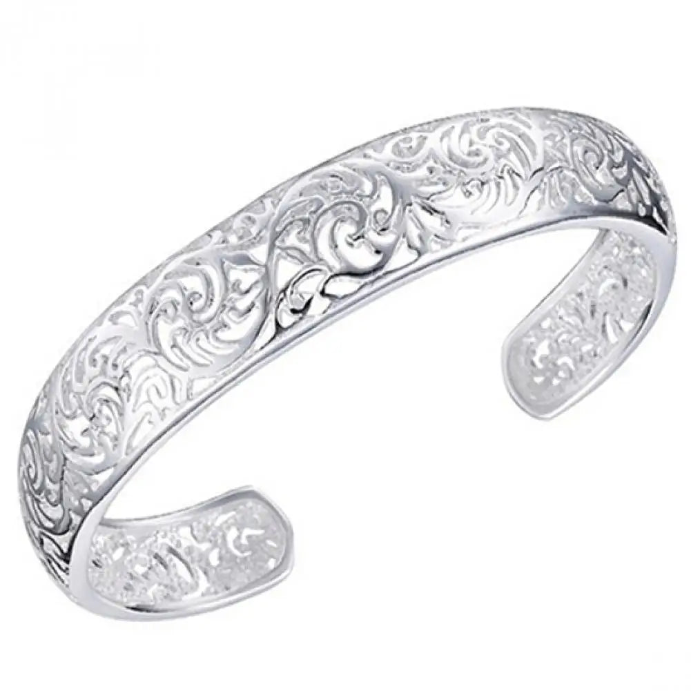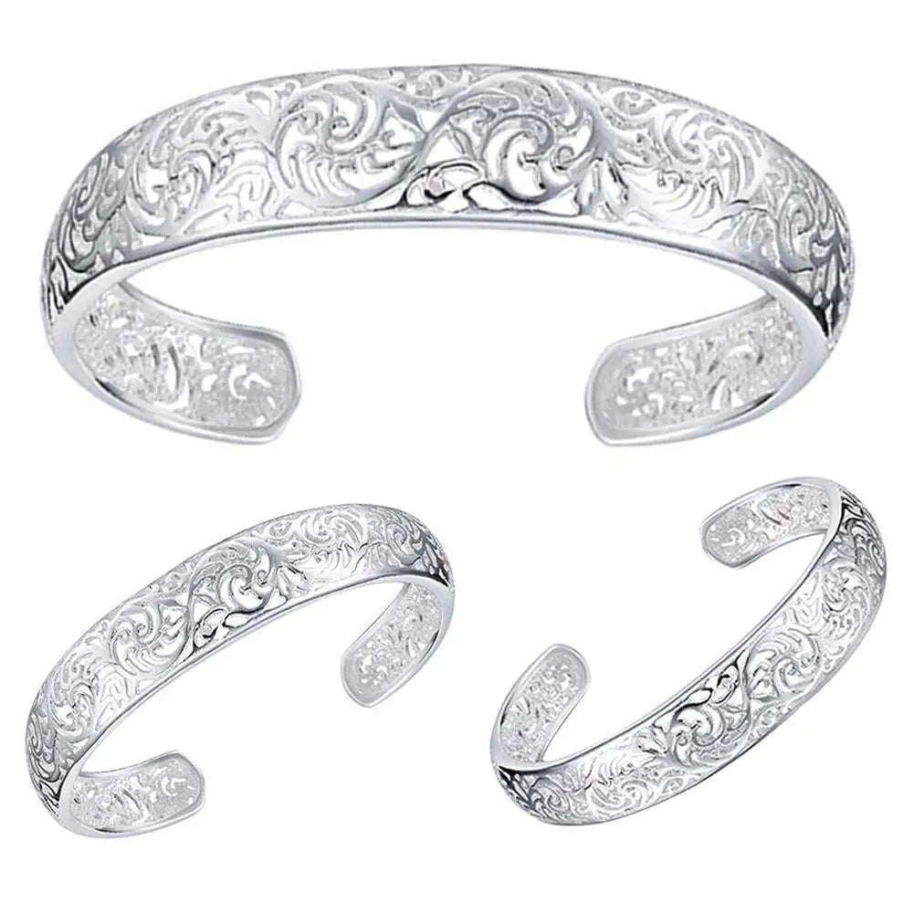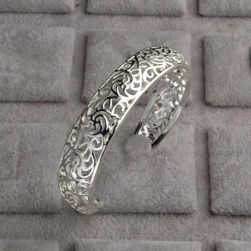925シルバーカフブレスレットオープニング絶妙な中空レディースブレスレットシルバーカラー彫刻パターンレトロバングルパーティーリストジュエリー