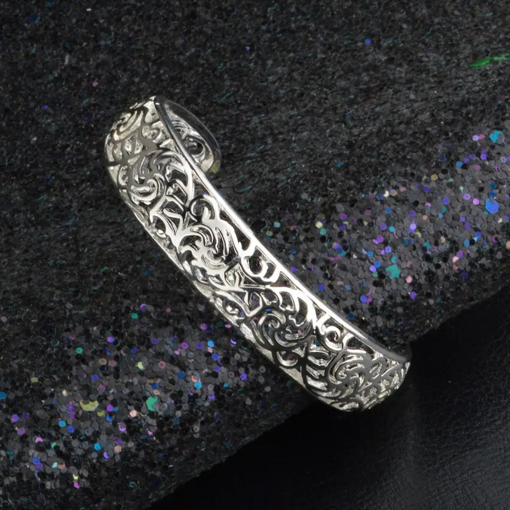 彫刻が施され、くり抜かれ、開いたこのシルバーブレスレットは、とても繊細で目を引くだけでなく、着用も非常に簡単です。