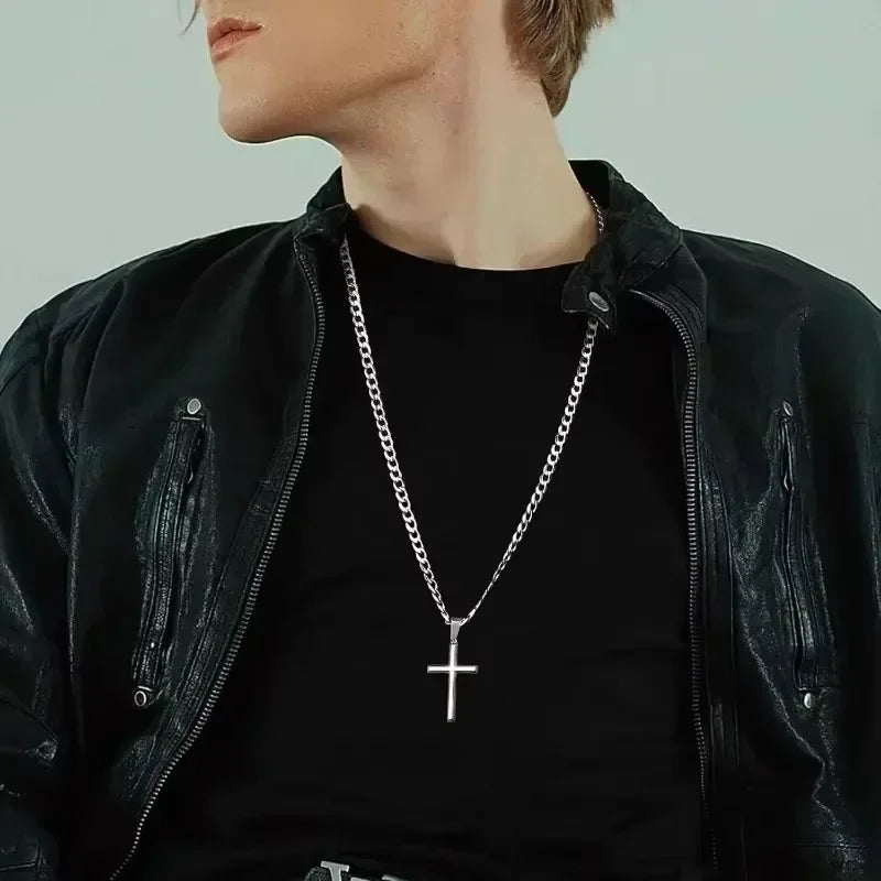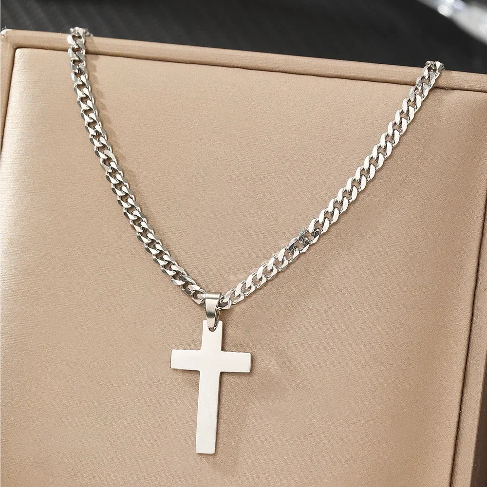 特徴1:925スターリングシルバーのクロスペンダント。耐久性の高いキューバンチェーンリンクにステンレススチールのダイヤモンドがあしらわれています。高品質で人気のジュエリー素材を使用し、頑丈で耐久性に優れています。