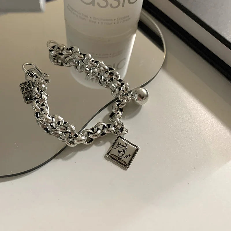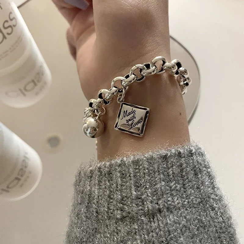 925スターリングシルバー イングリッシュスクエアチャームブレスレット レディース ボールヒップホップ タイシルバーブレスレット