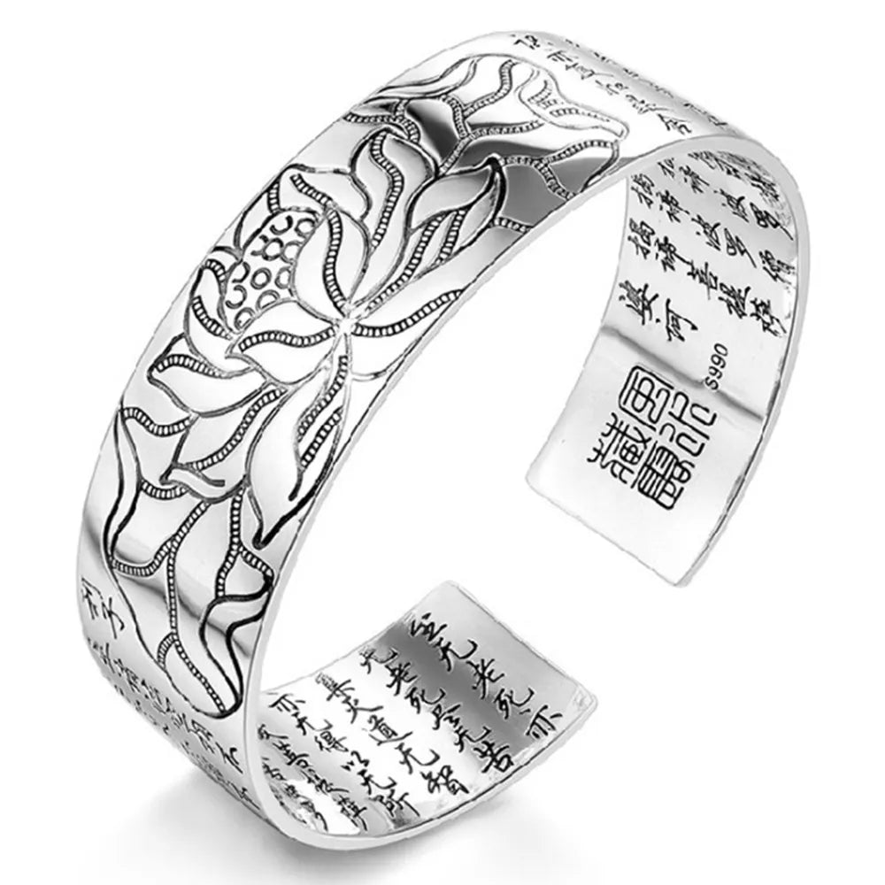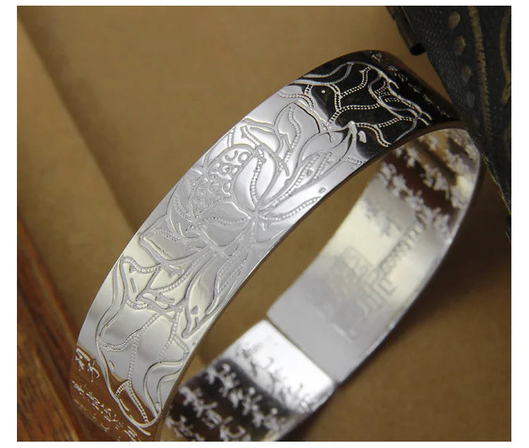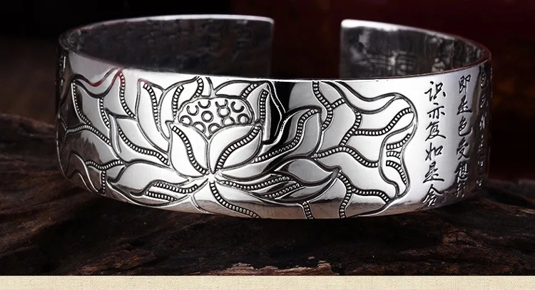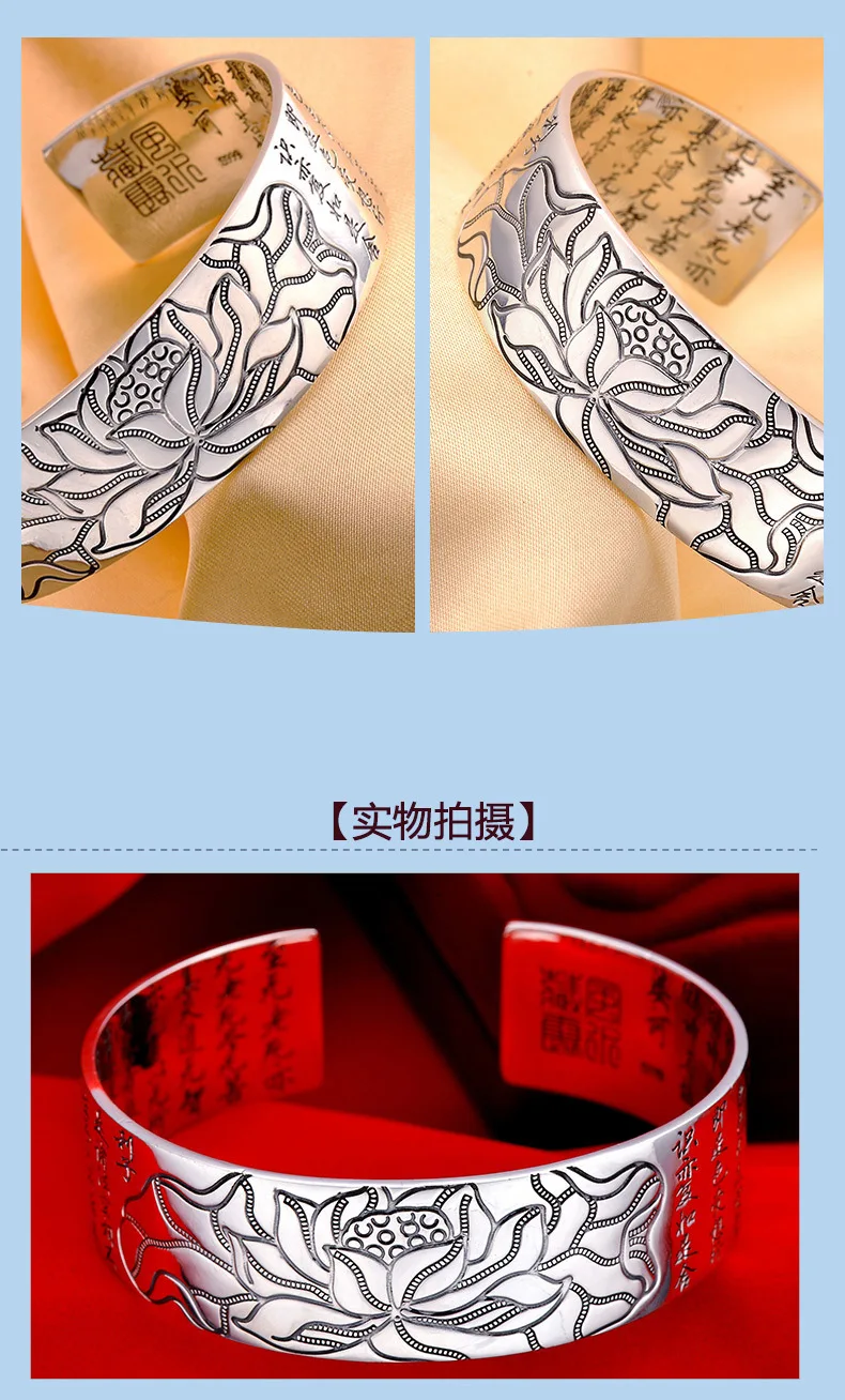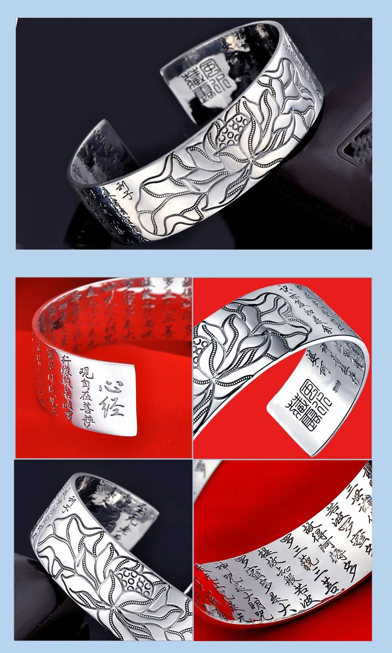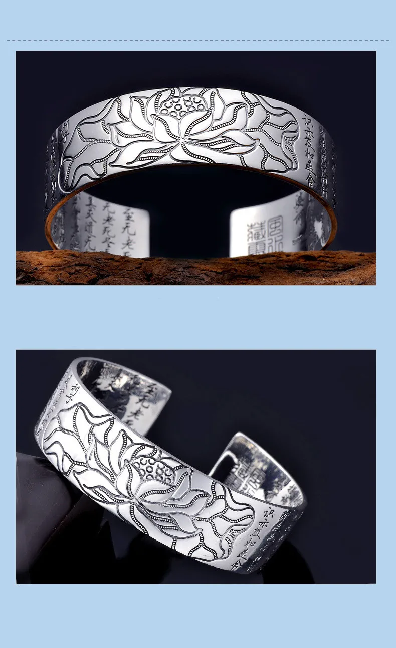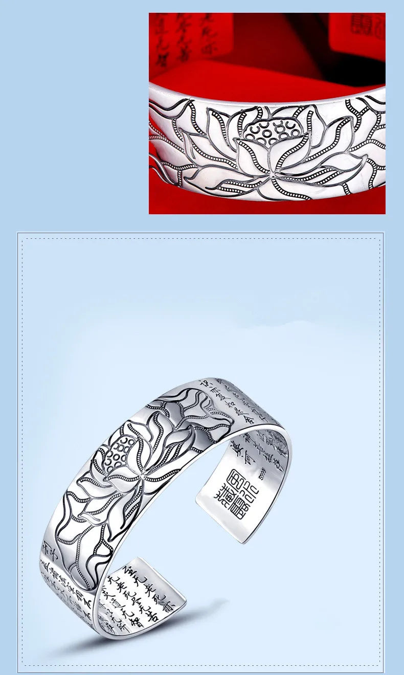 925スターリングシルバー 新作 レディース メンズ ファッションジュエリー レトロ 蓮の彫刻 仏教経典 祝福ブレスレット