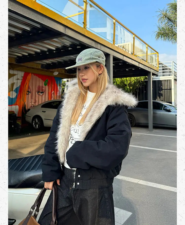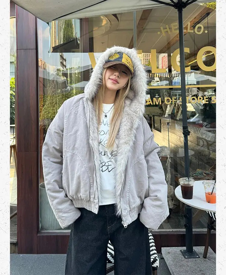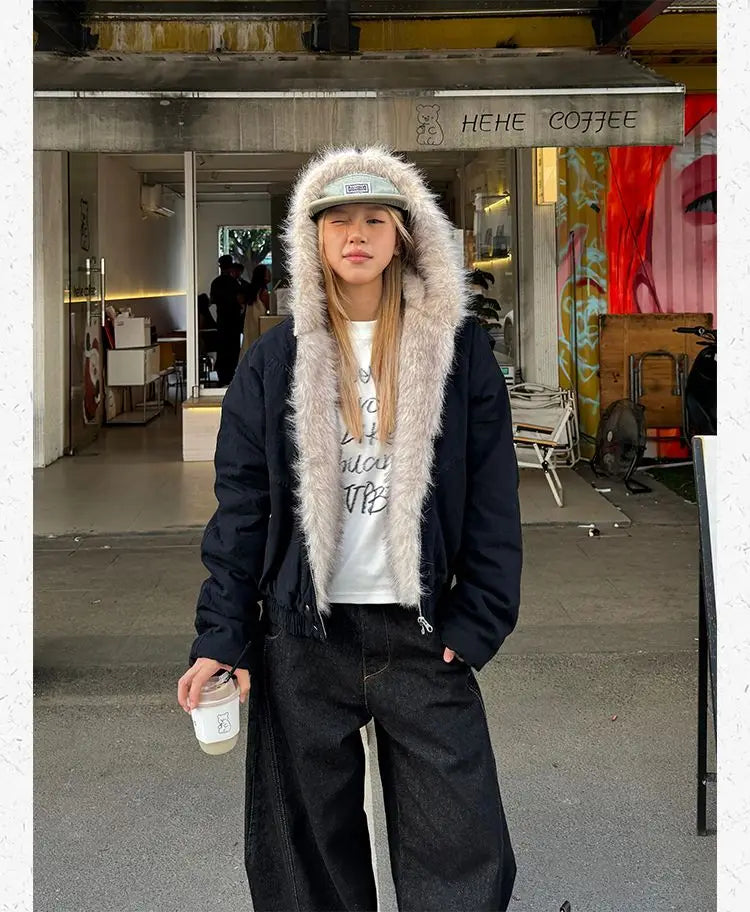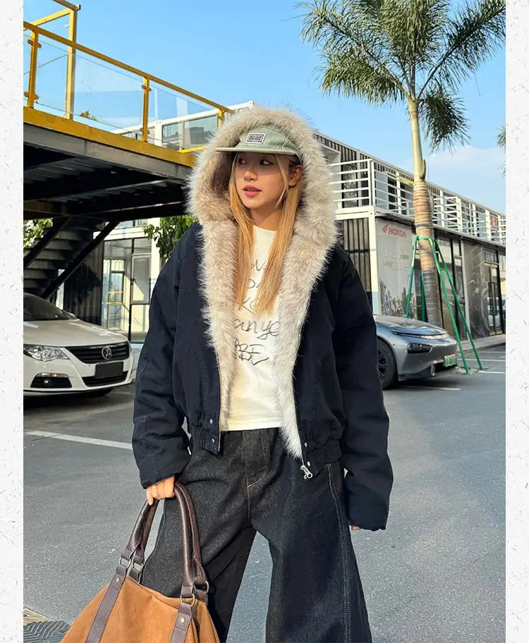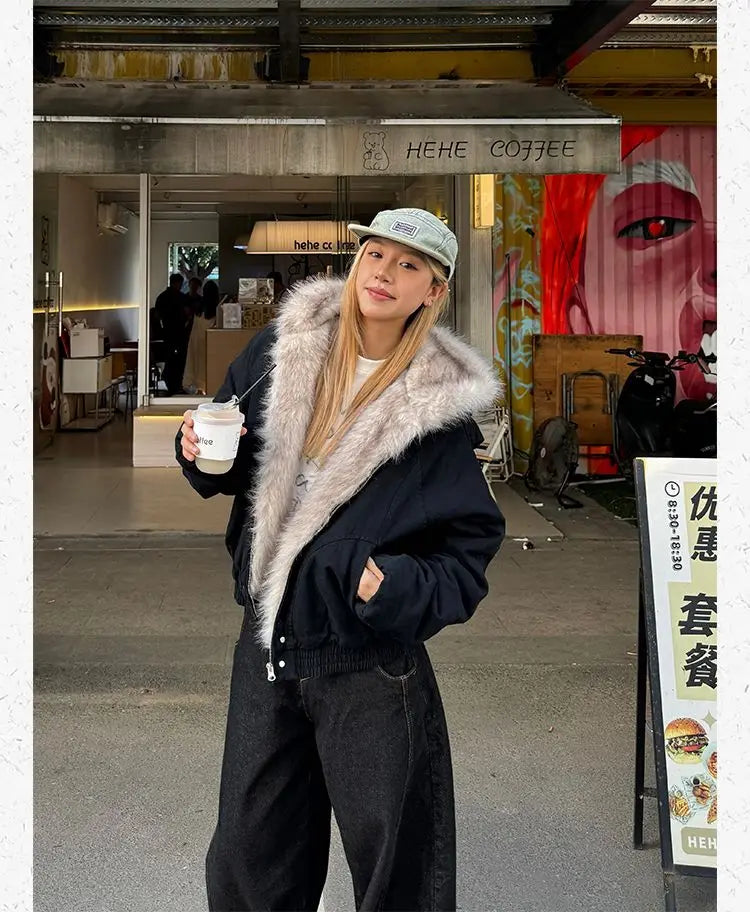 アメリカンレトロファーカラーフード付きジャケット レディース Y2K ストリートウェア 冬物 新作 ベルベット 厚手 暖かい 原宿系 ゆったり カジュアル ジャケット