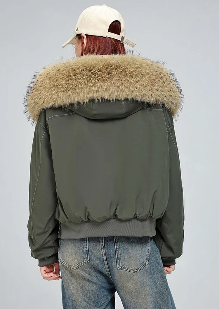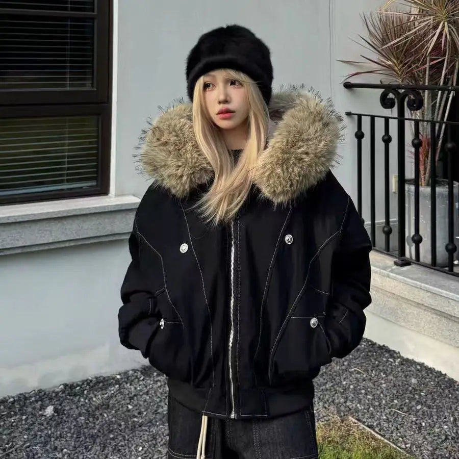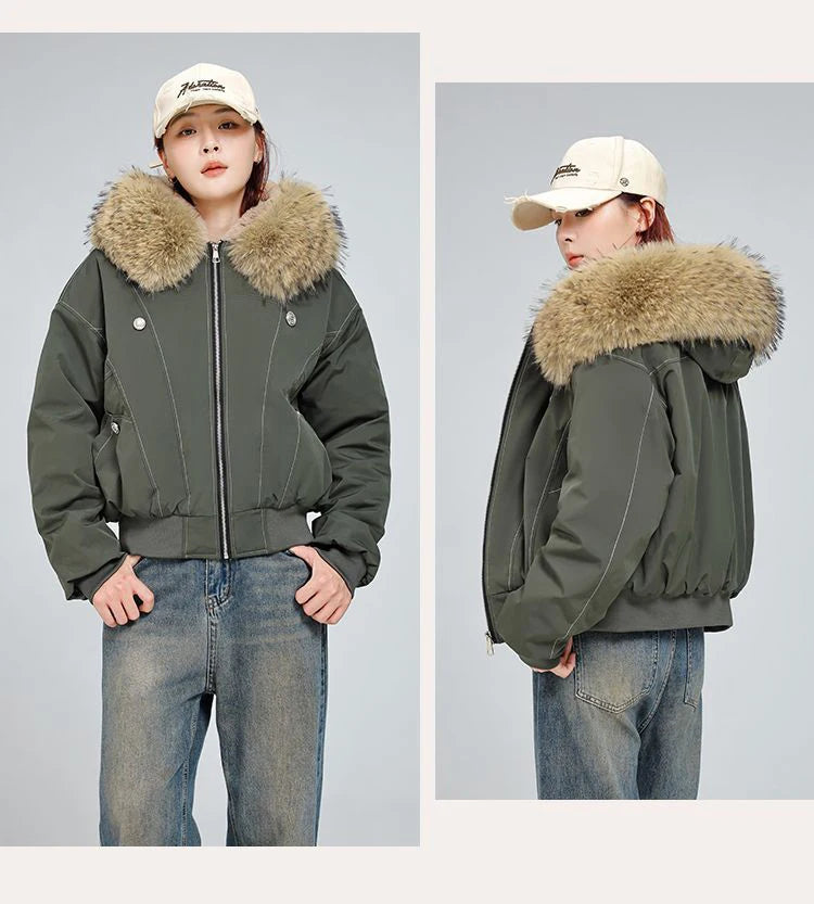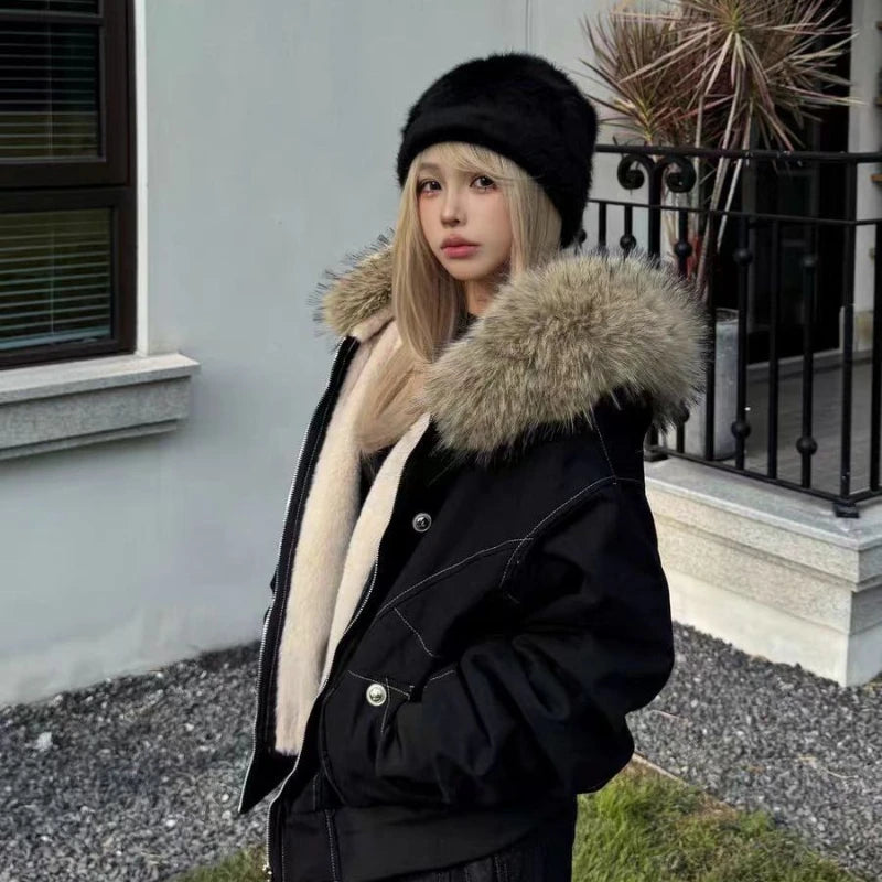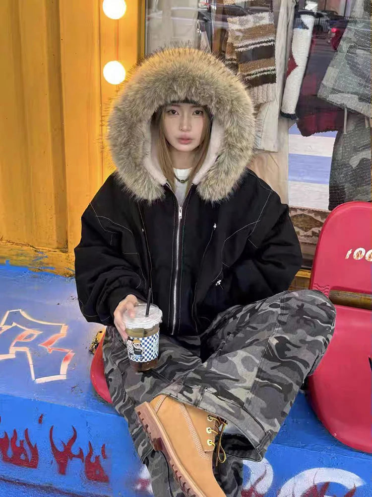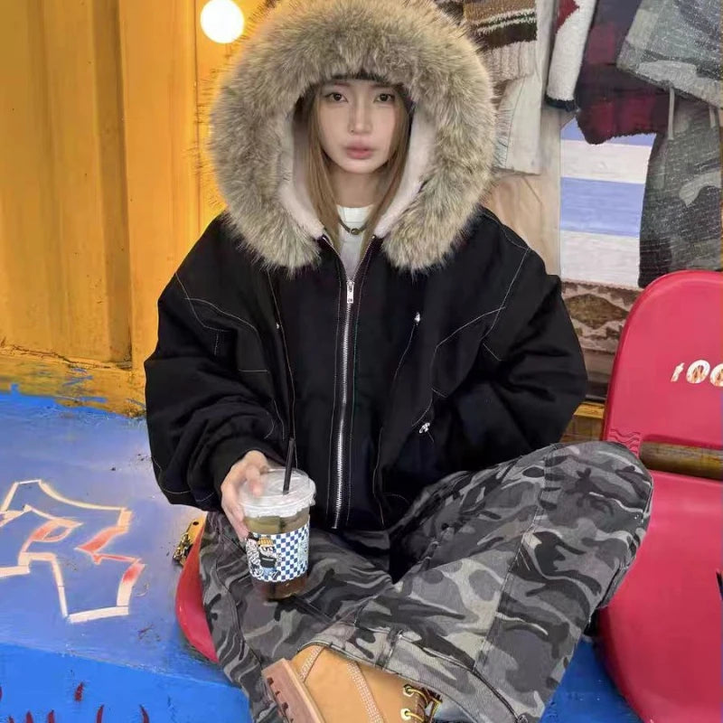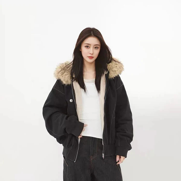 アメリカンスタイル レトロ ファーカラー イミテーションミンクファー フード付き コットンパッド入り ジャケット レディース&メンズ ゴシック ヒップホップ カジュアル ジッパー パーカー