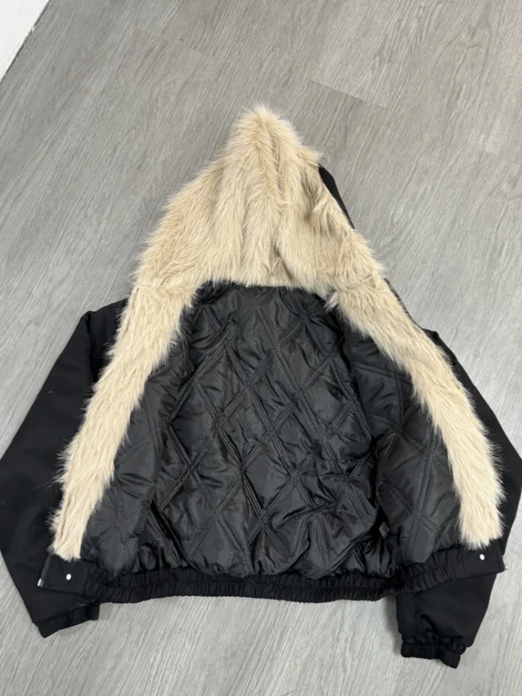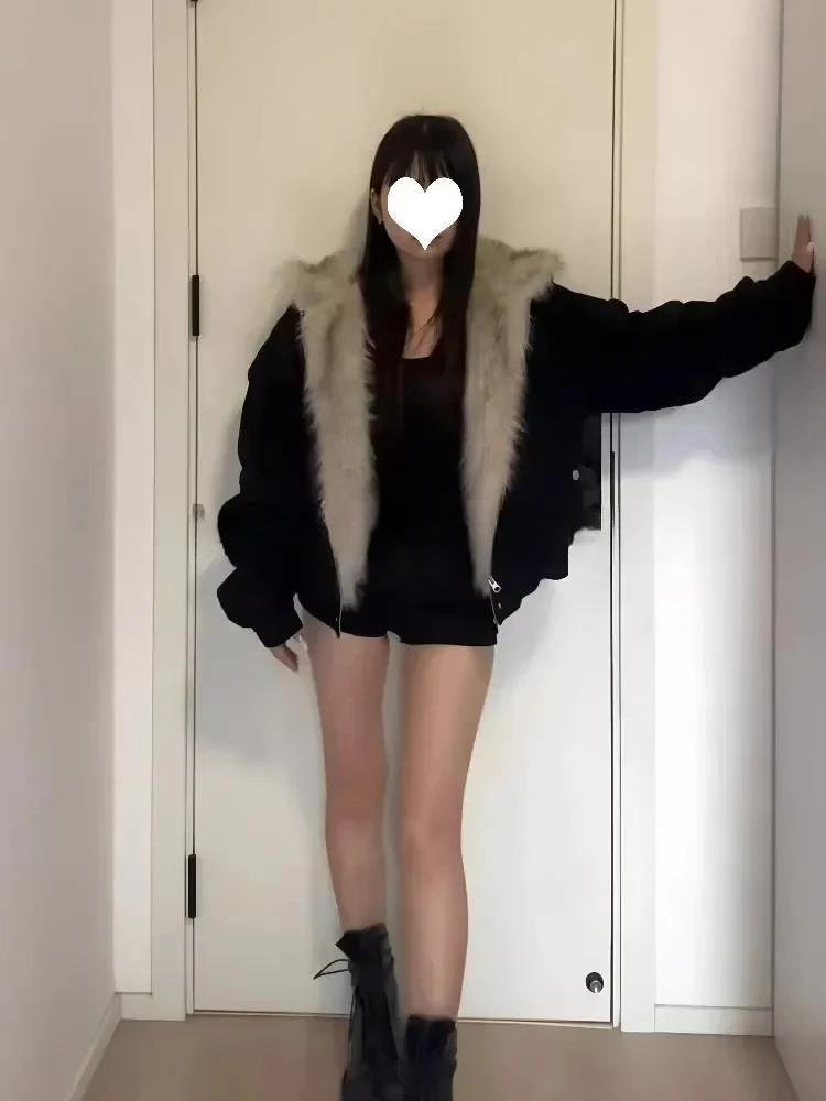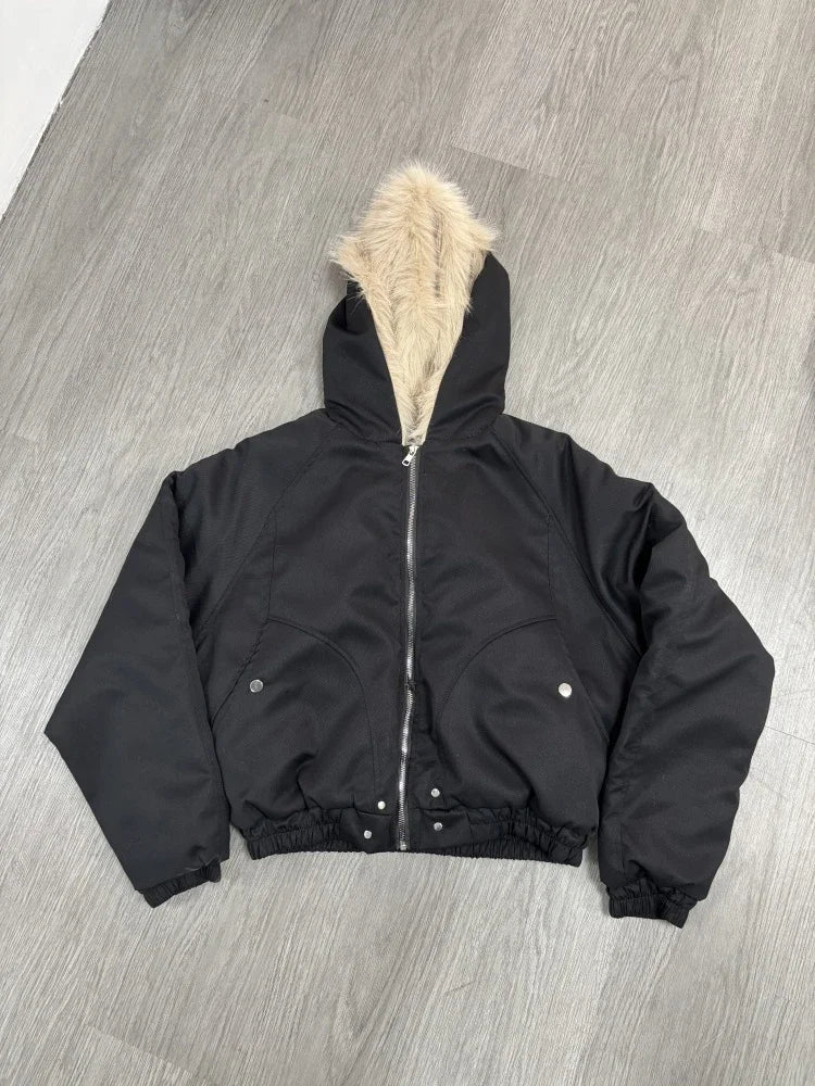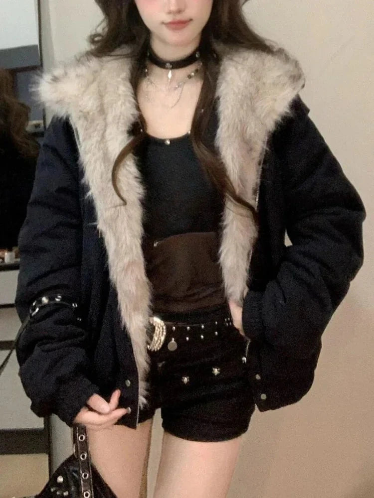アメリカンスタイル レトロ フード付き 冬 ゴシック 原宿 ファッション ブラック コート カジュアル アウター Y2K ファーカラー パーカー レディース シック