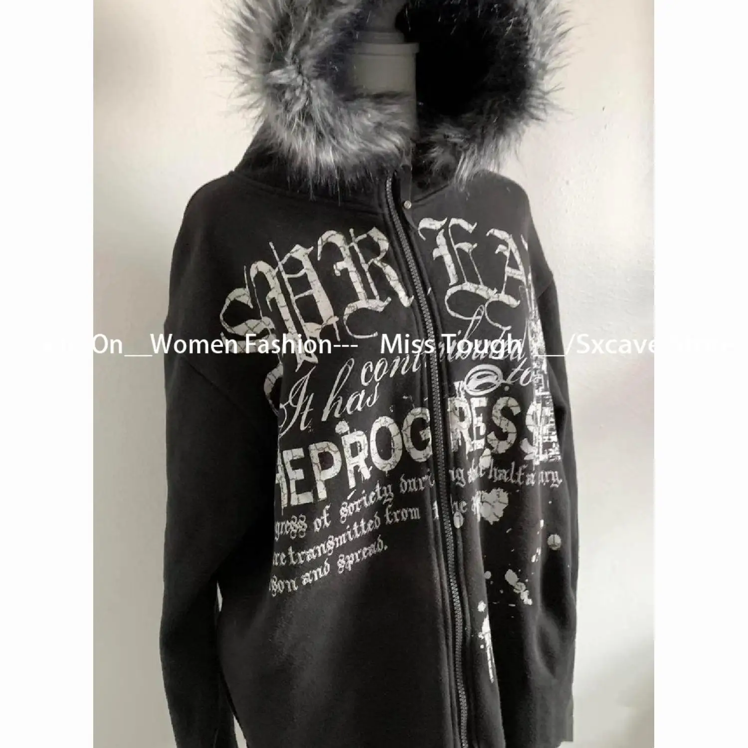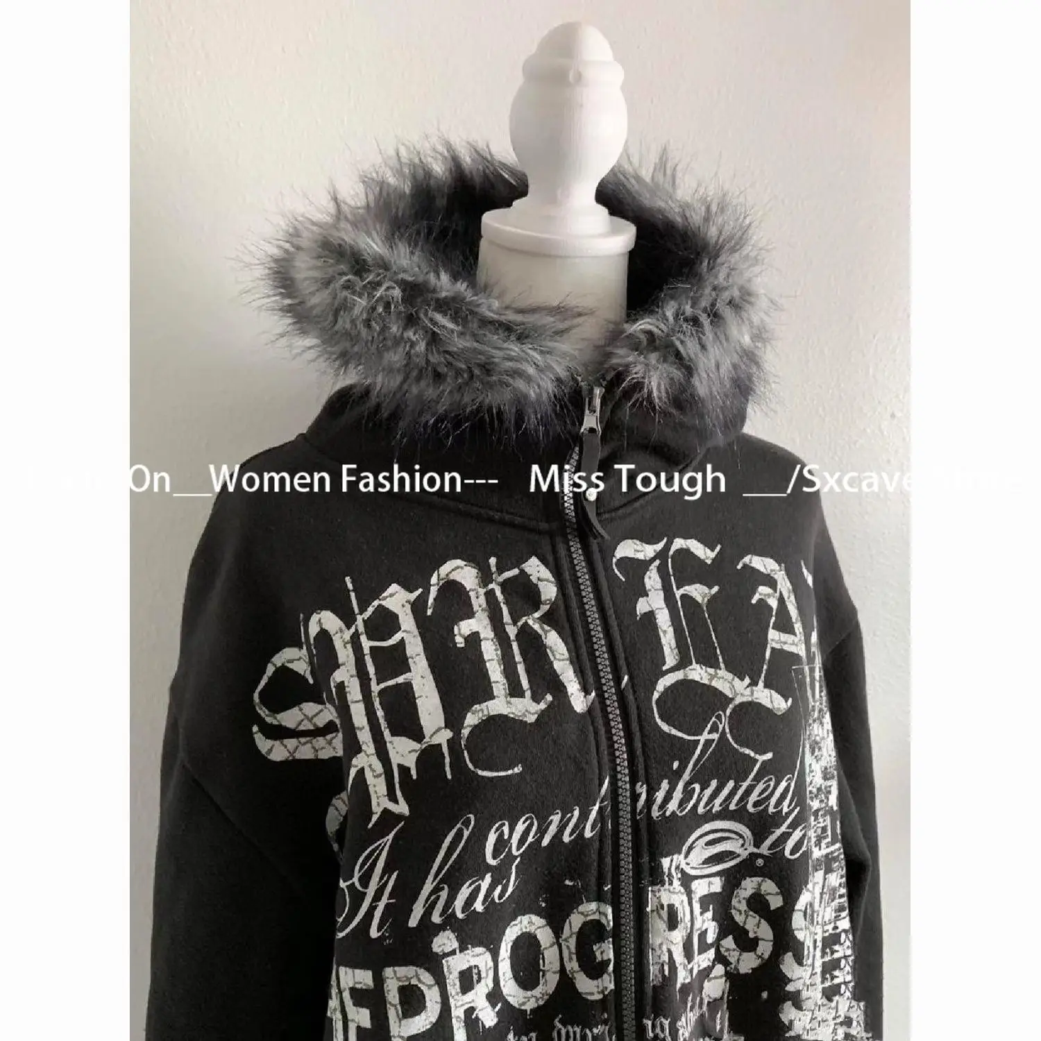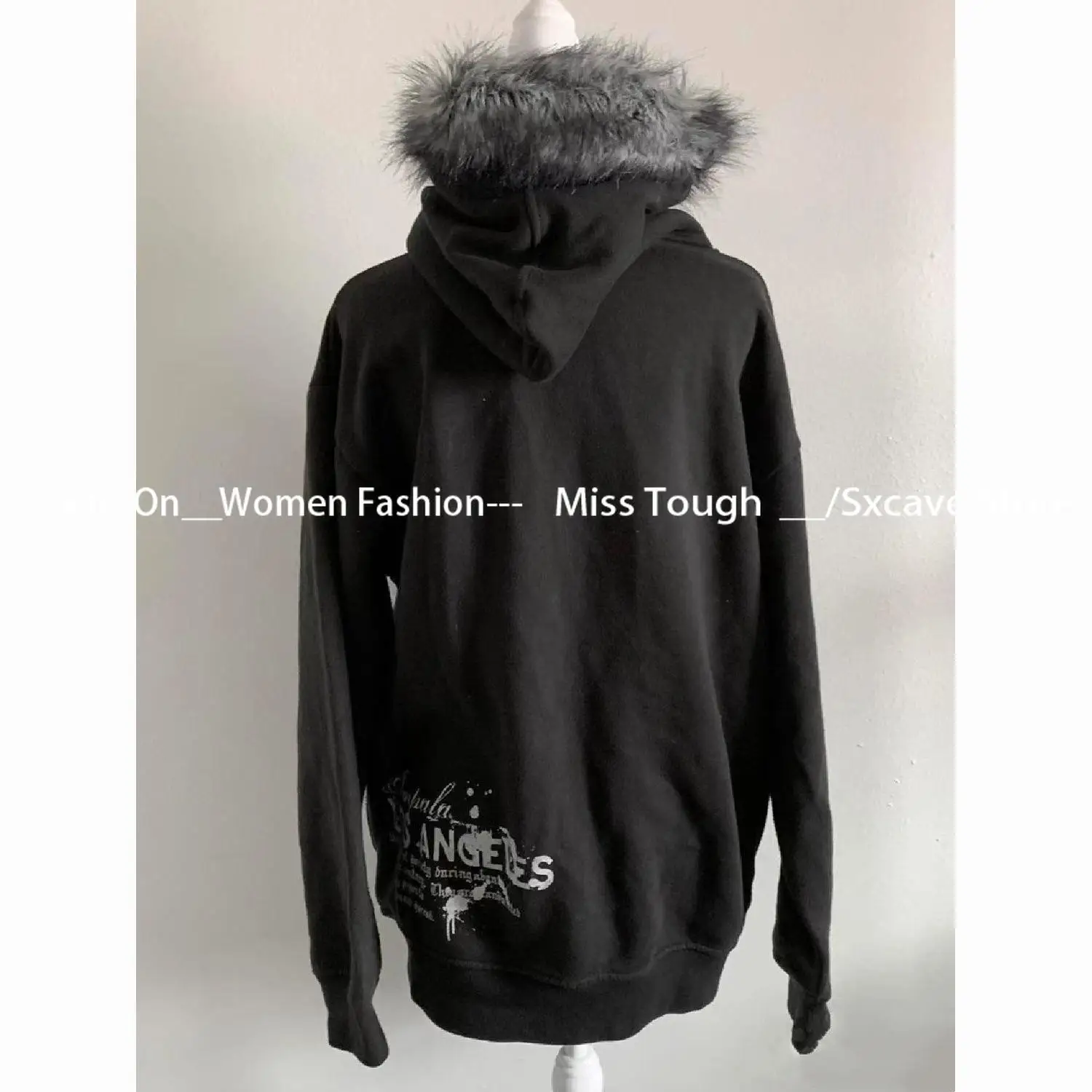 アメリカンヴィンテージ ブラックフェイクファー スウェットシャツ レディース レタープリント サブカルチャーコート フード付き レディース ゴシック 原宿ジャケット Y2K