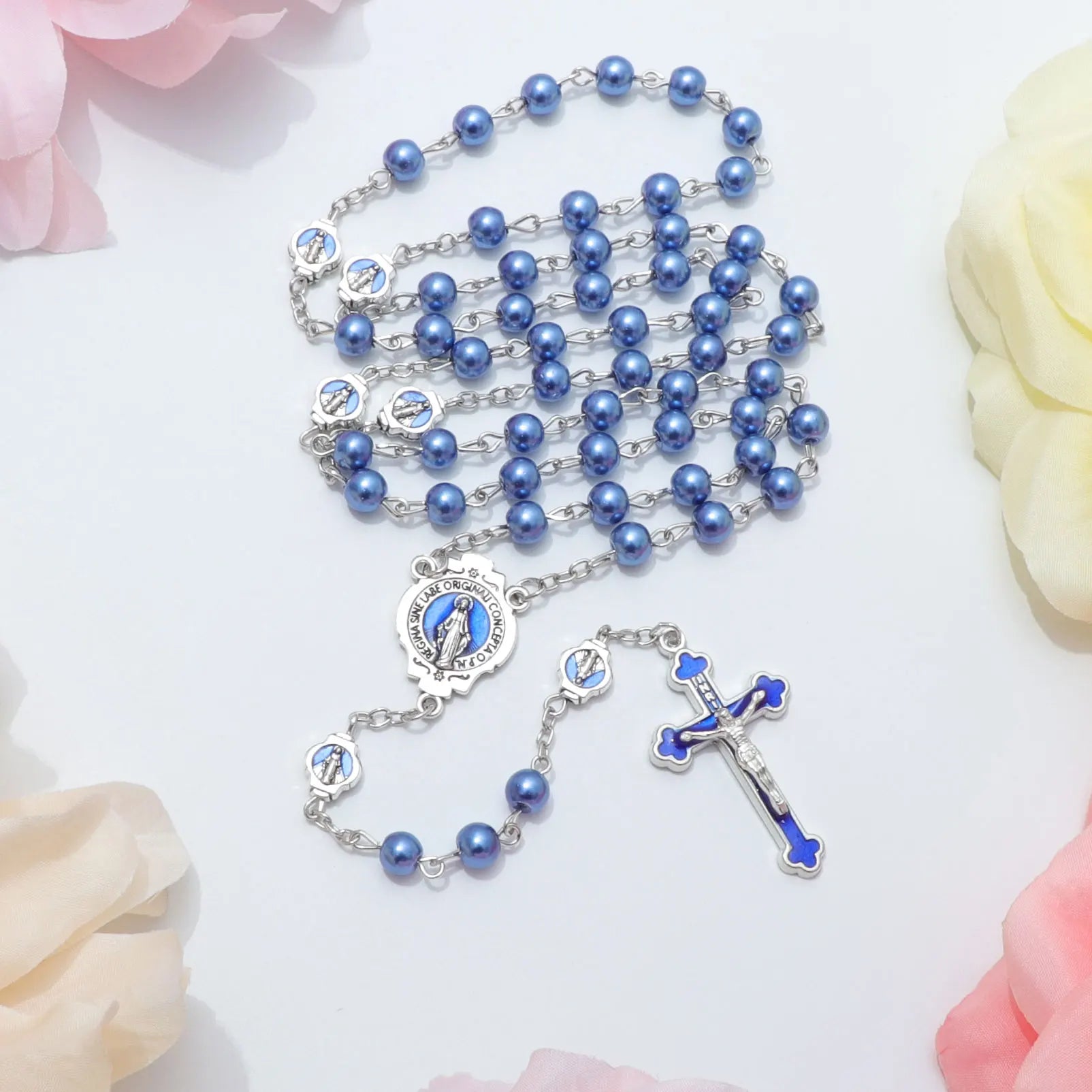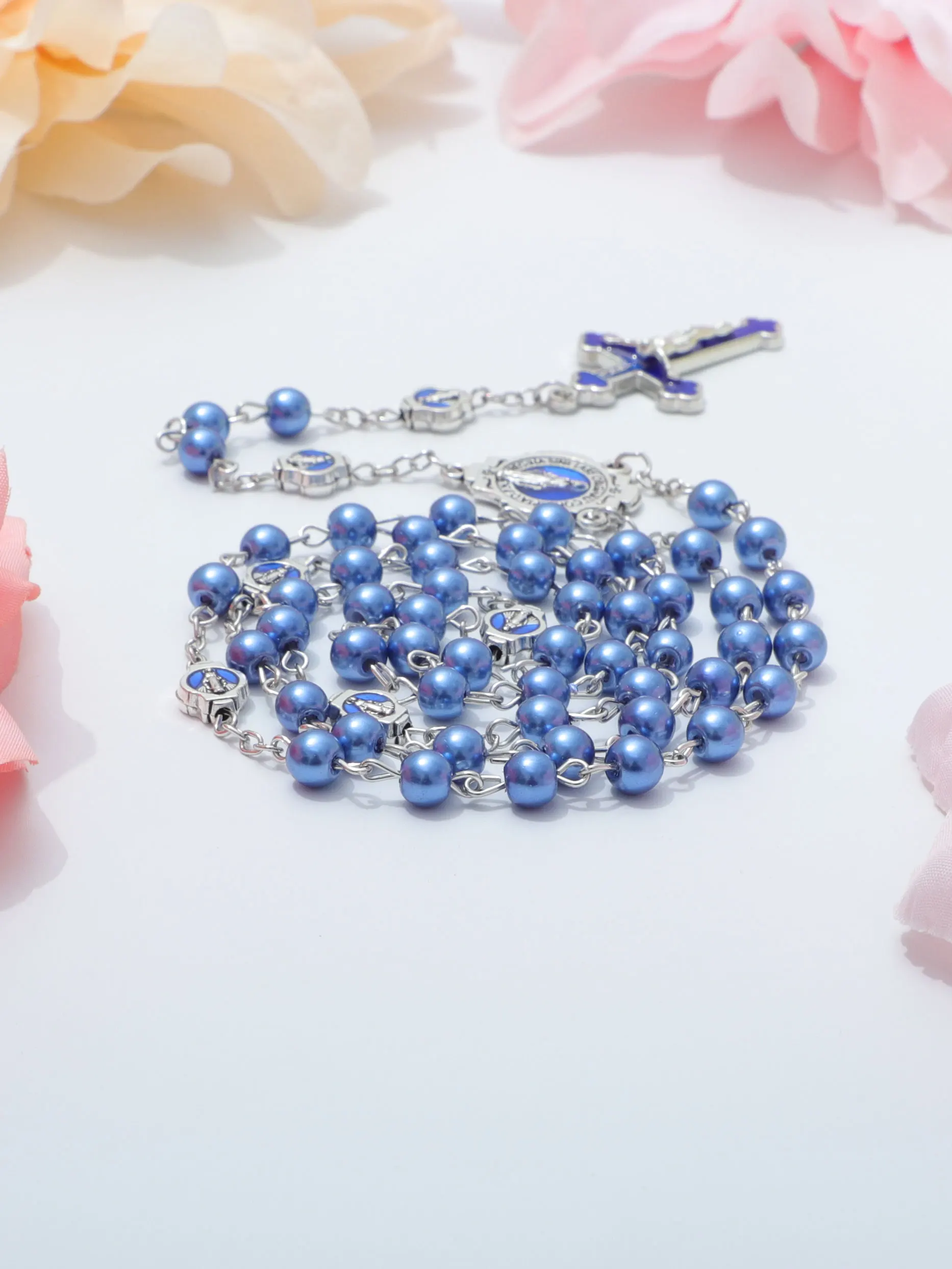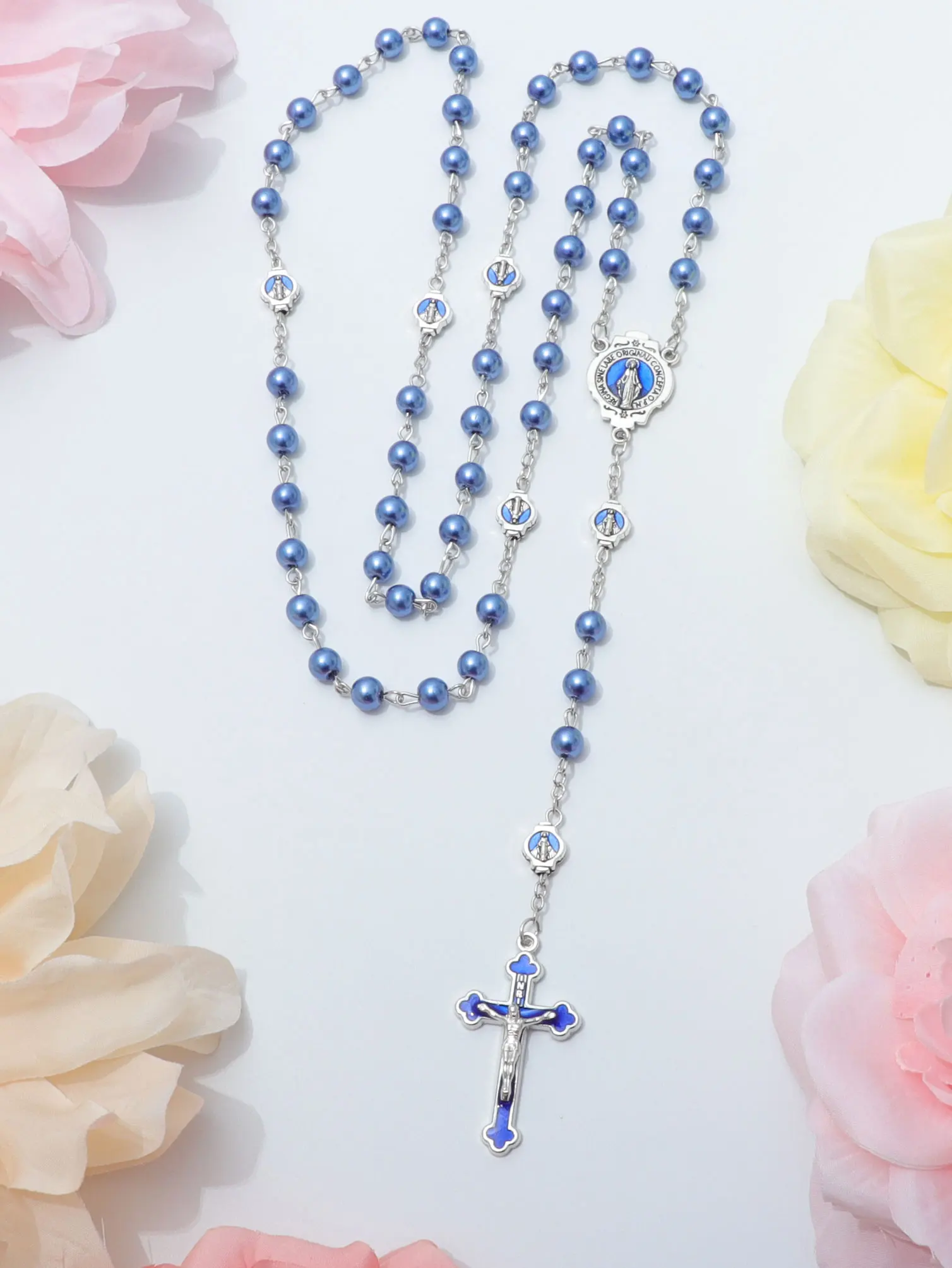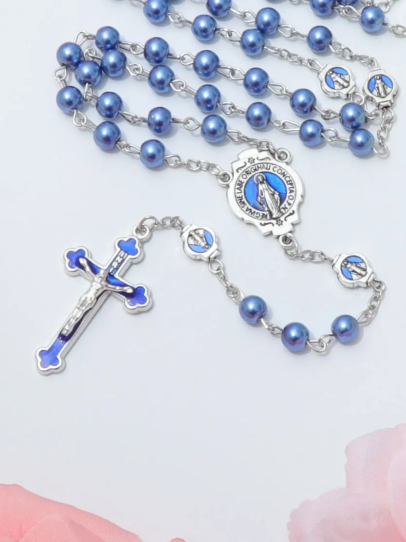 ブルーロザリオネックレス レディース メンズ 祈りビーズ ロングチェーン 宗教的 聖母マリア 十字架ペンダント メンズ パーティー ジュエリー ギフト
