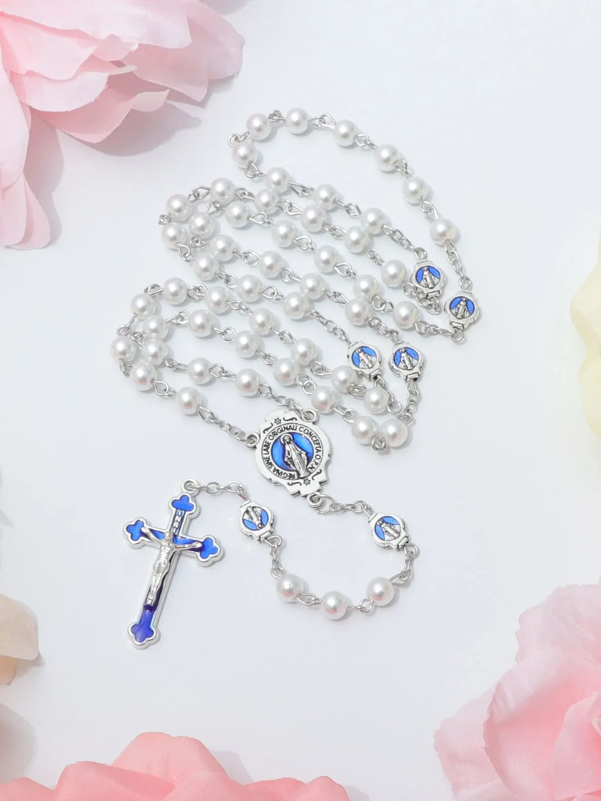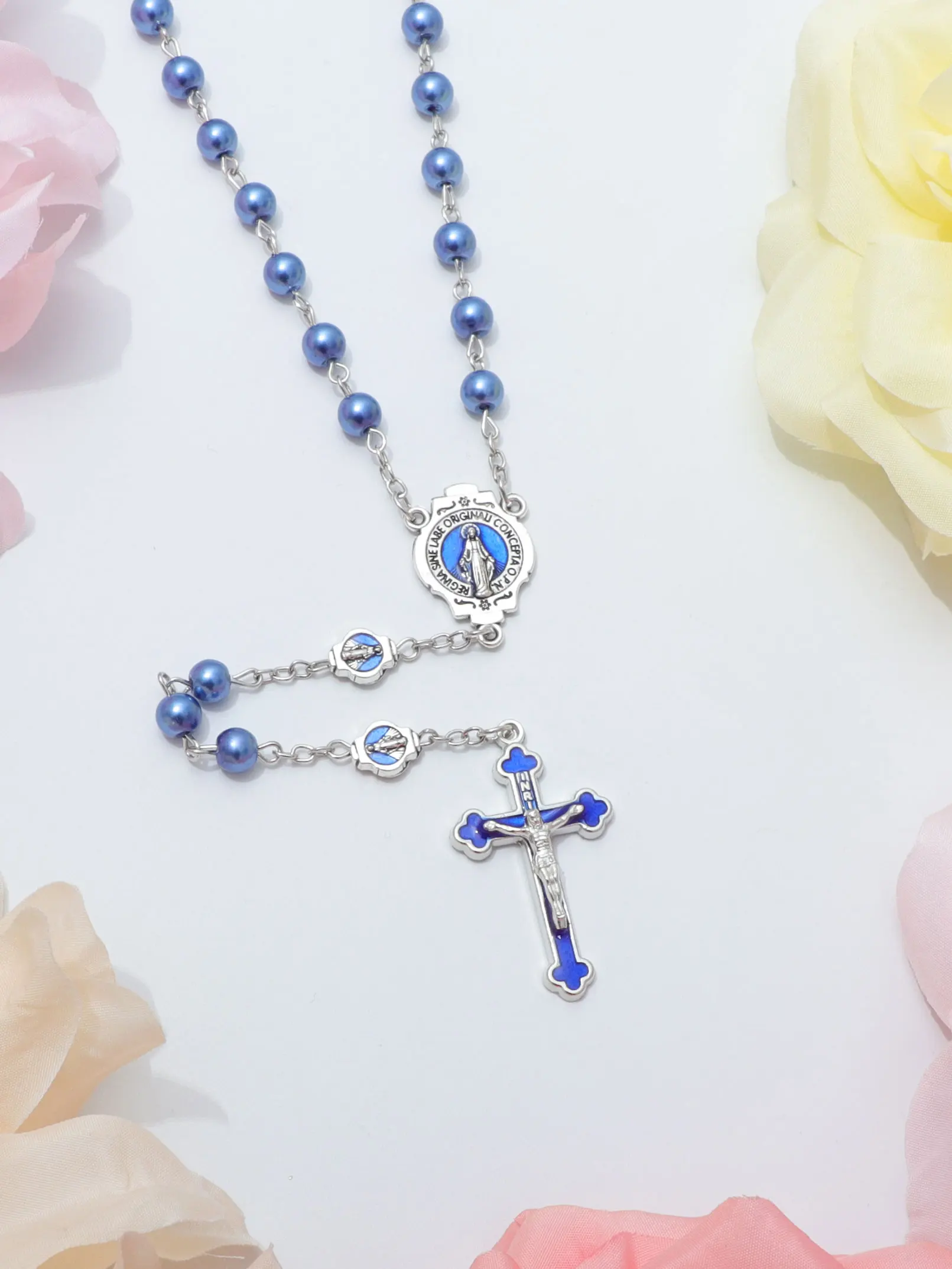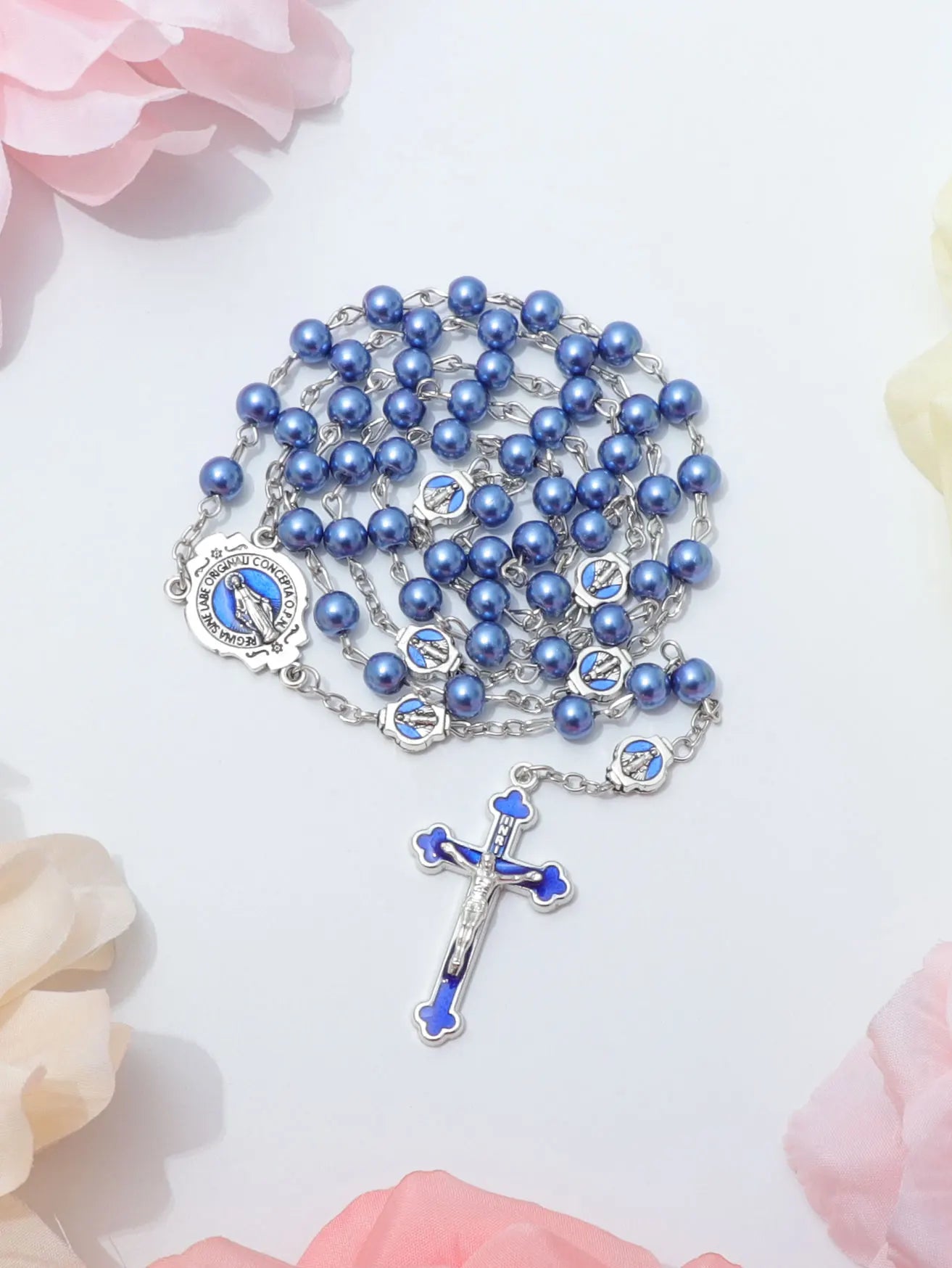 ブルーロザリオネックレス レディース メンズ 祈りビーズ ロングチェーン 宗教的 聖母マリア 十字架ペンダント メンズ パーティー ジュエリー ギフト