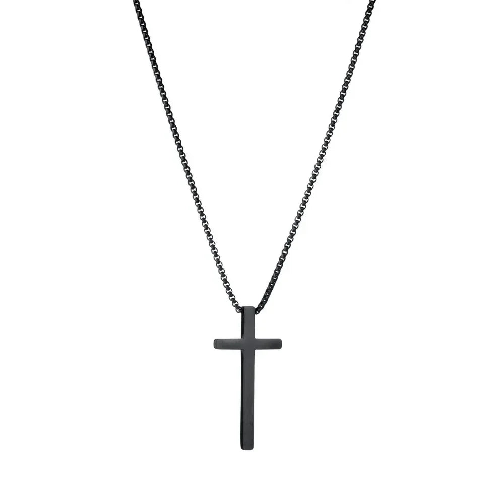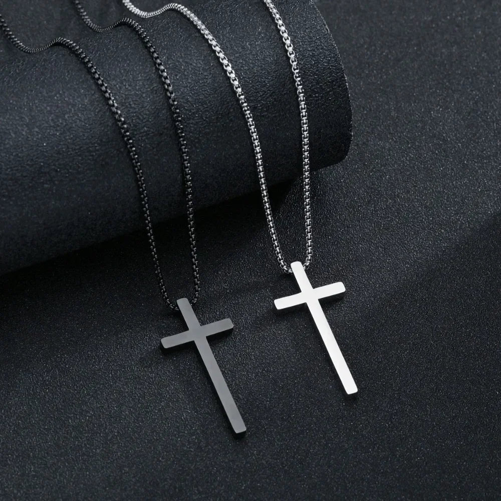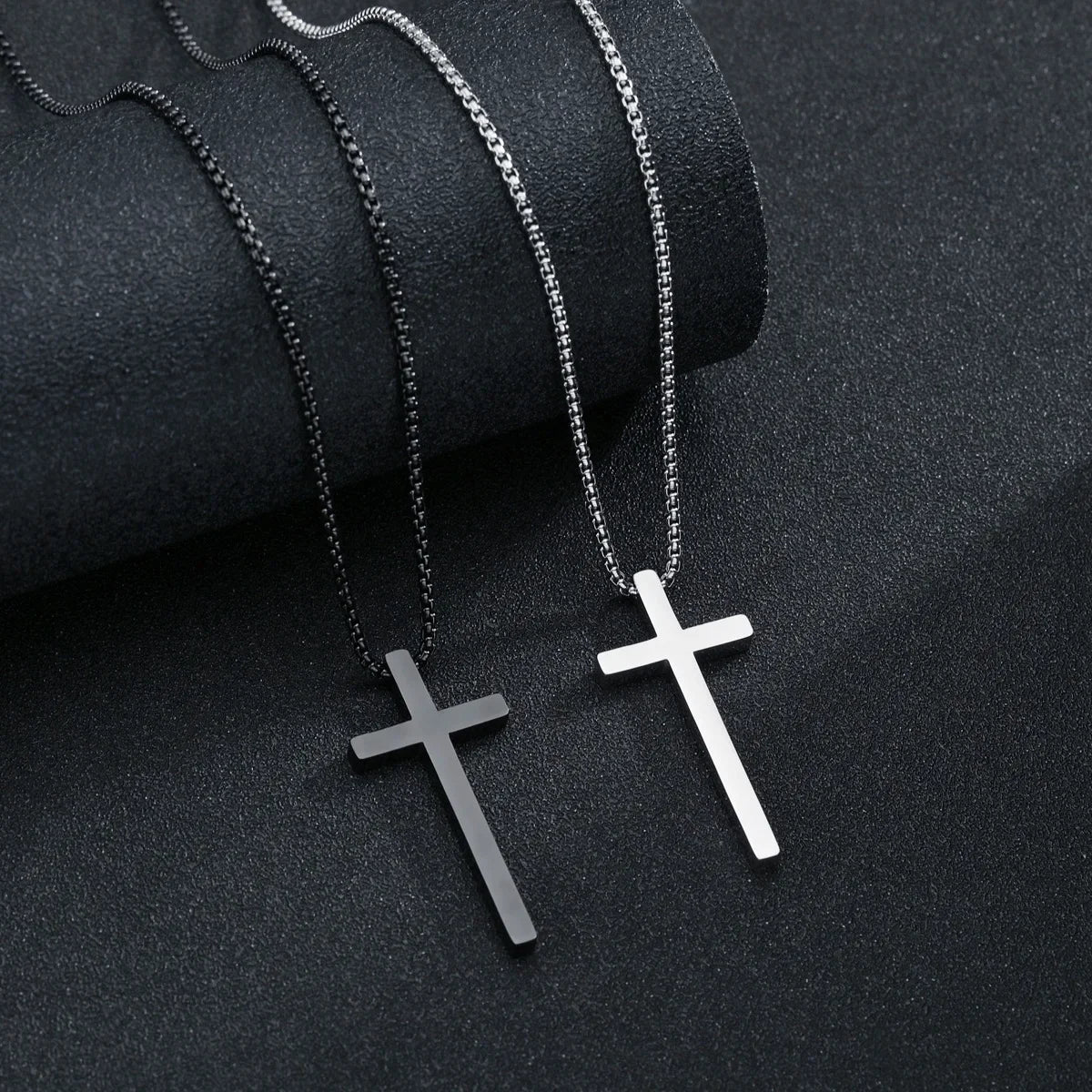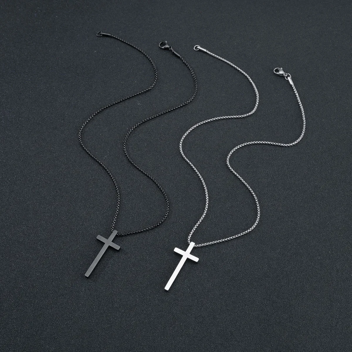 クラシックでシンプルなロングクロスペンダントネックレス。メンズ。個性的なトレンドのブラックステンレススチール製。ヒップホップロックジュエリー。色褪せにくいギフト。