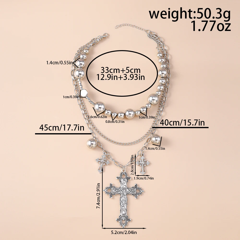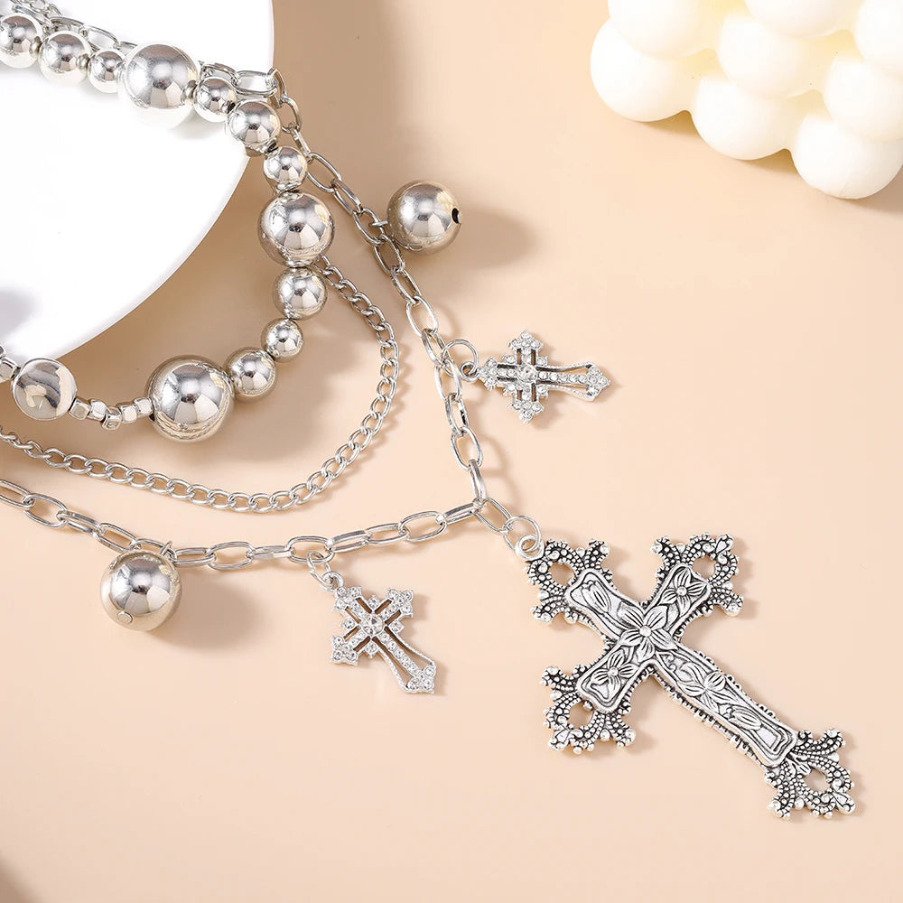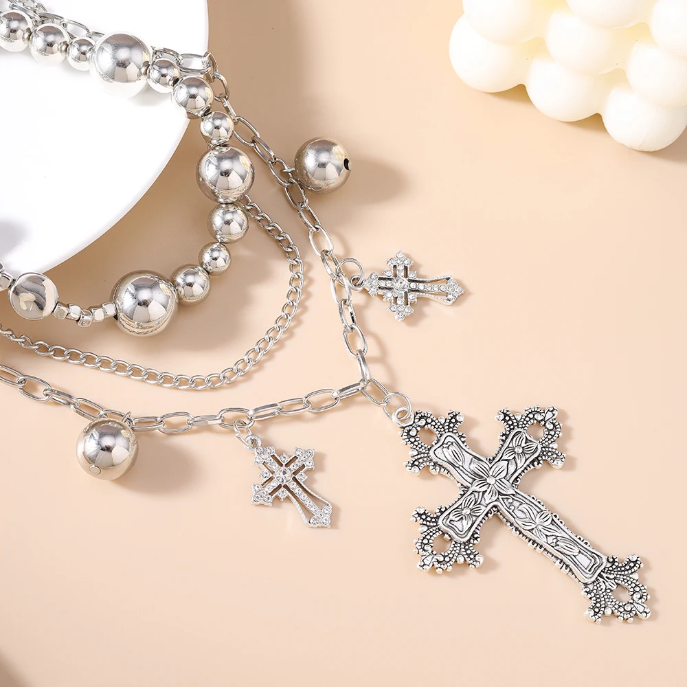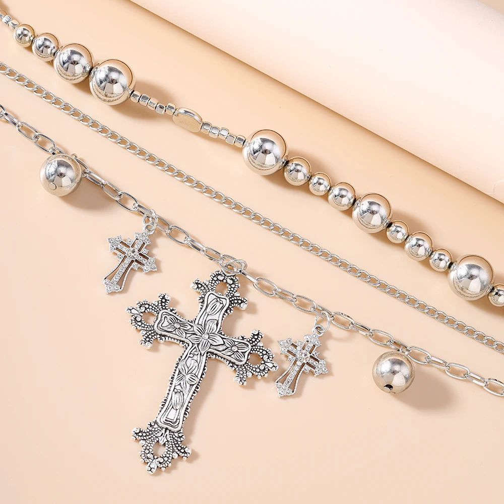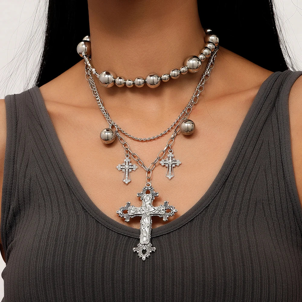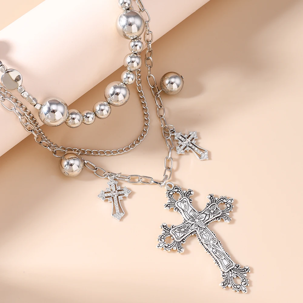 クールなゴシッククロスペンダントネックレス。レディース・メンズ用。多層ビーズチョーカーネックレス。ヒップホップ・パンクジュエリーギフト。