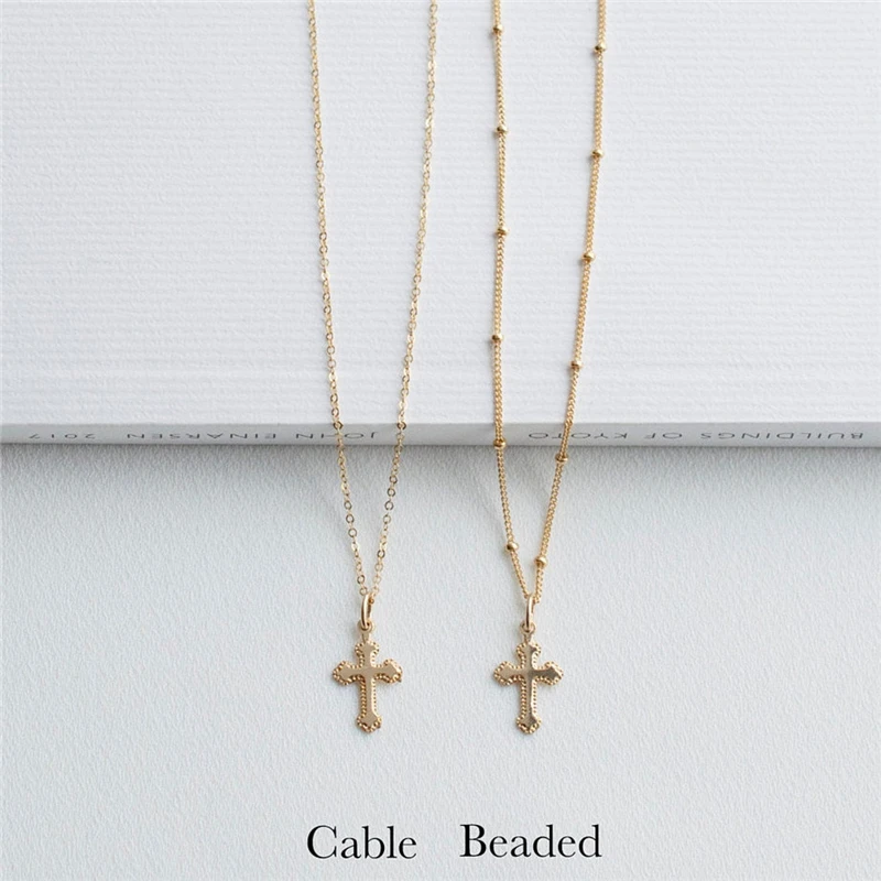 •この14Kゴールドフィルドの手作りネックレスは、円形のデザインがアクセントになったスリムなクロスペンダントが特徴です。