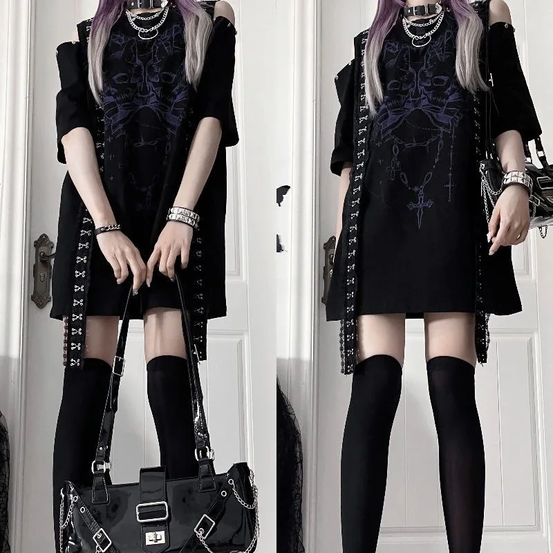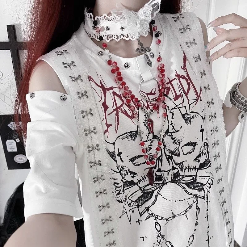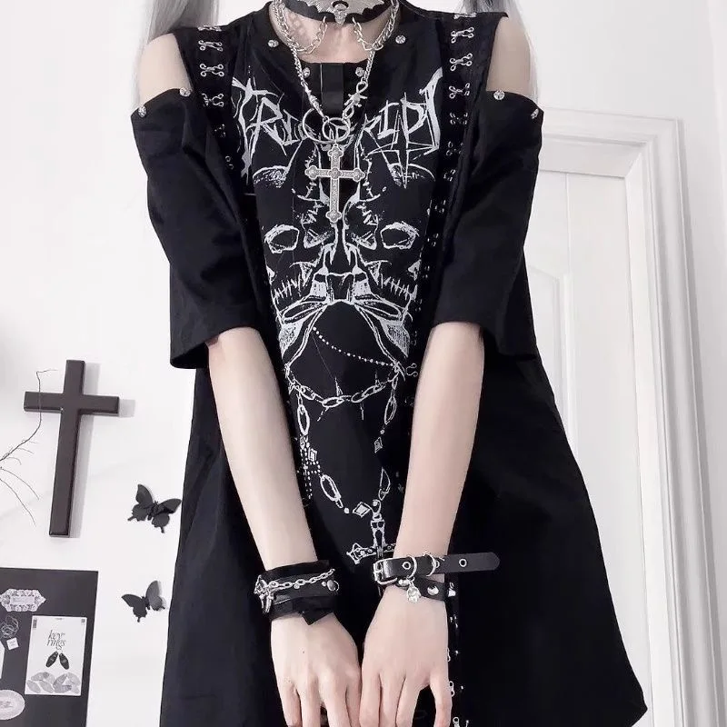 ダークリーシリーズ パンクプリント サブカルチャー ゴシック 半袖 オフショルダー Tシャツ デザインセンス ゆったり 甘辛 トップス 夏