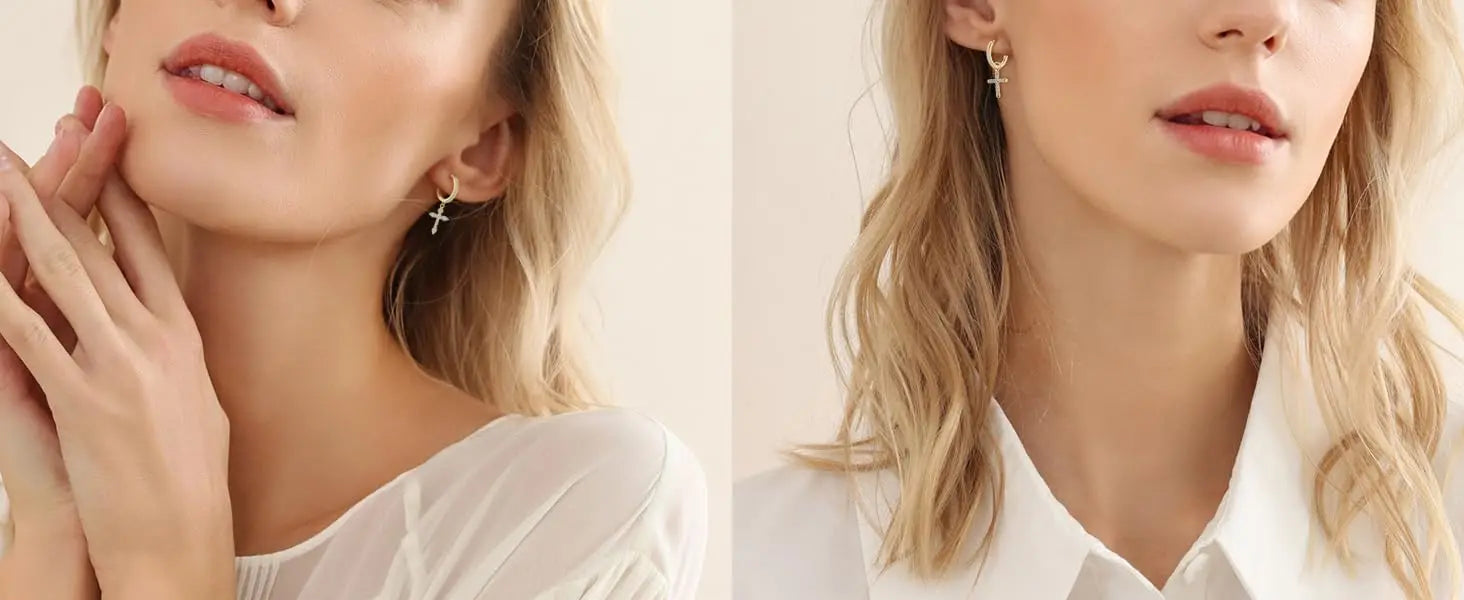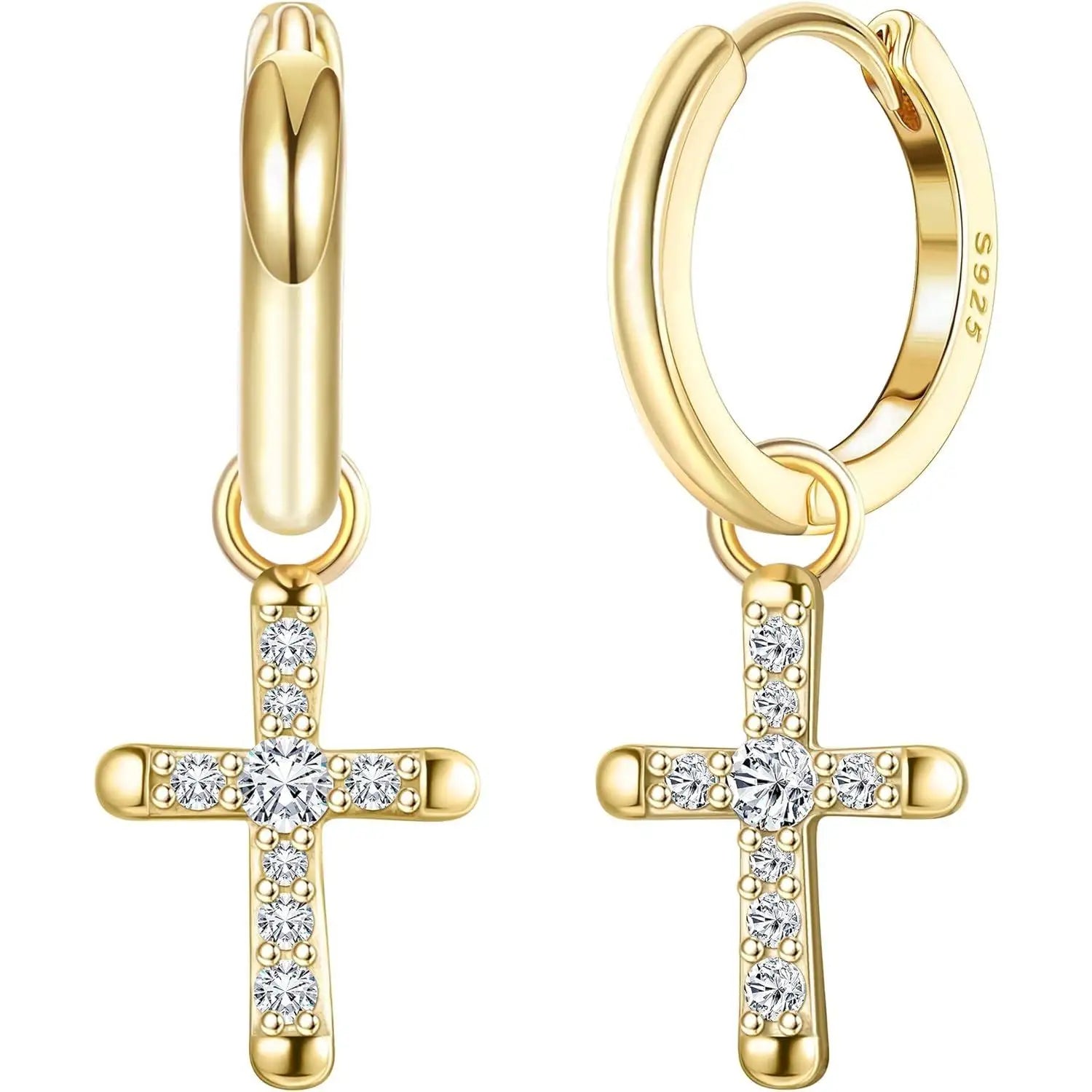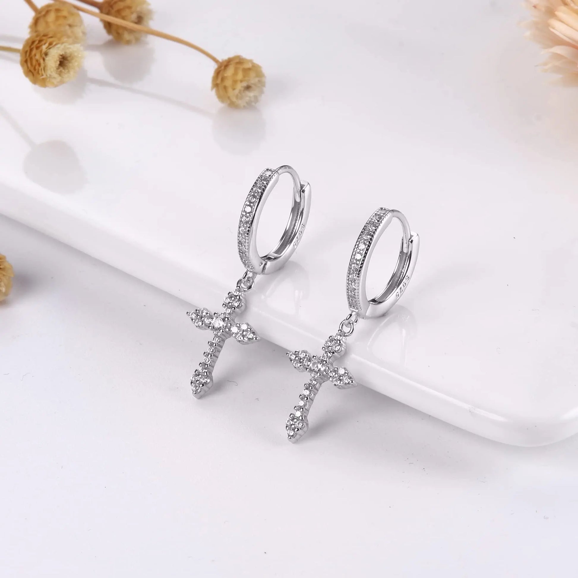 Fansilver 925スターリングシルバー クロスイヤリング レディース メンズ 華奢なCZハギーフープイヤリング アイスアウトクロスダングルイヤリング ボックス付き
