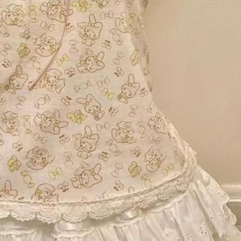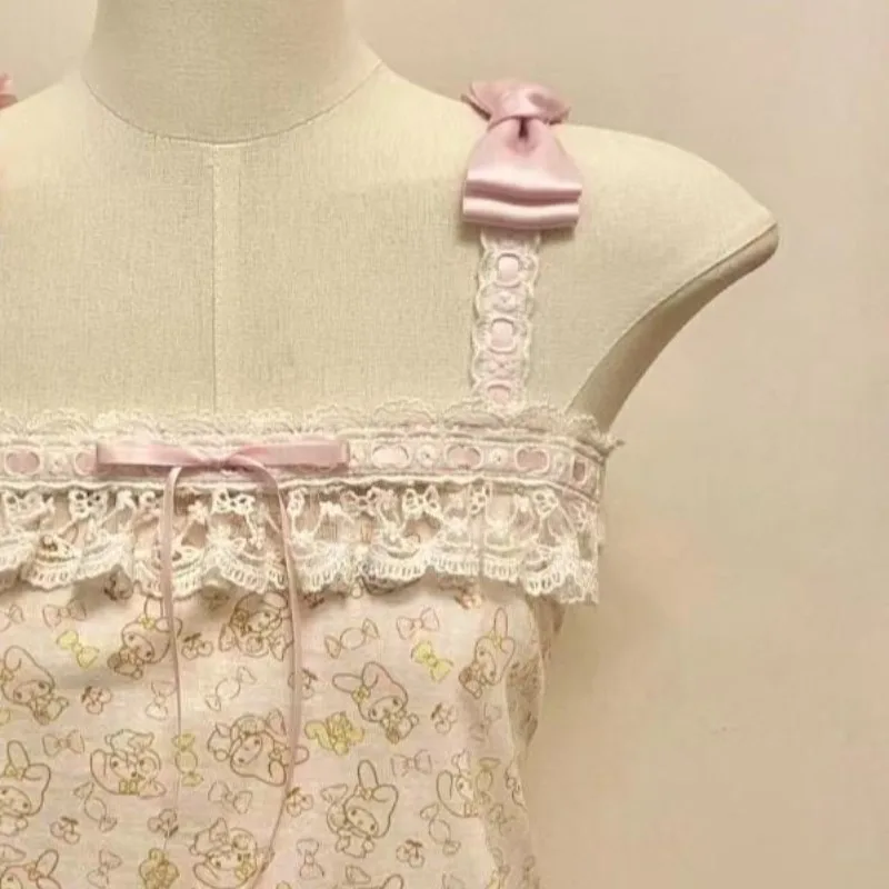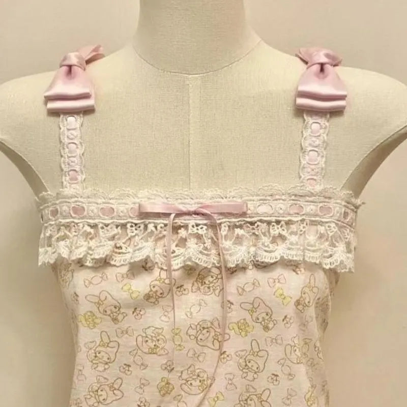 フレンチヴィンテージホットティーホルターベストサブカルチャーレースステッチタンクトップかわいいリボンデザイントップスレディースキュート漫画プリントキャミソール