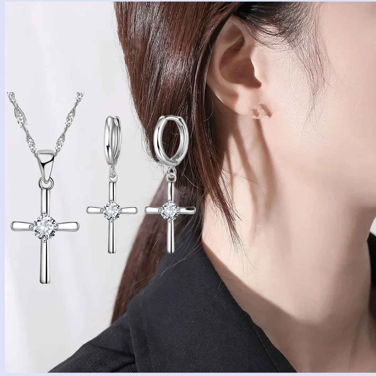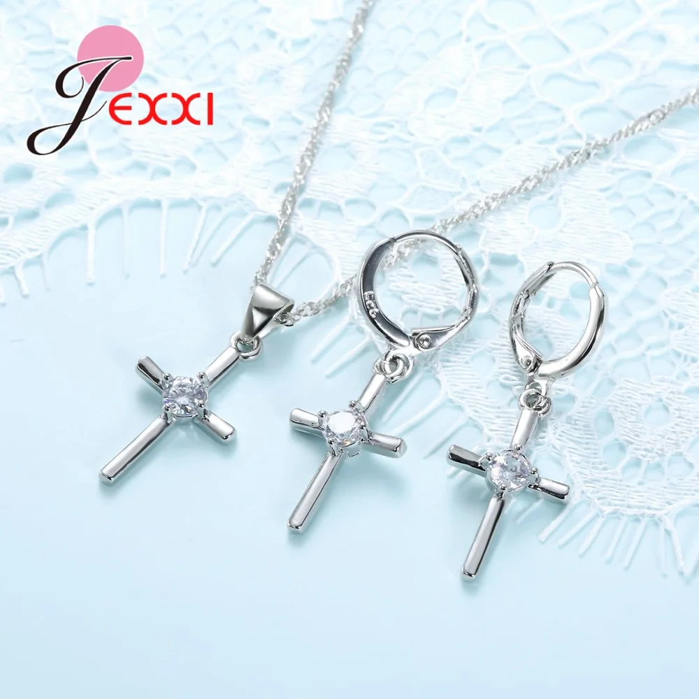 本物の925スターリングシルバークロスデザインキュービックジルコンペンダントネックレスイヤリングセットレディースガールズウェディングパーティージュエリーギフト