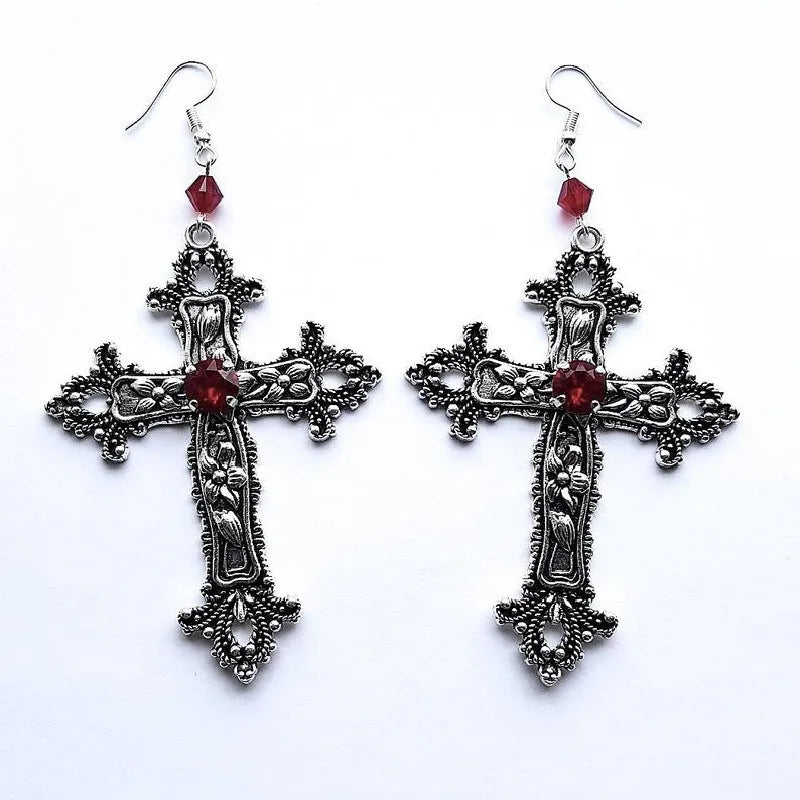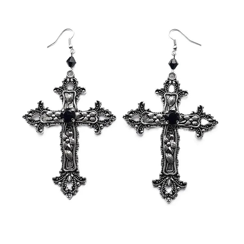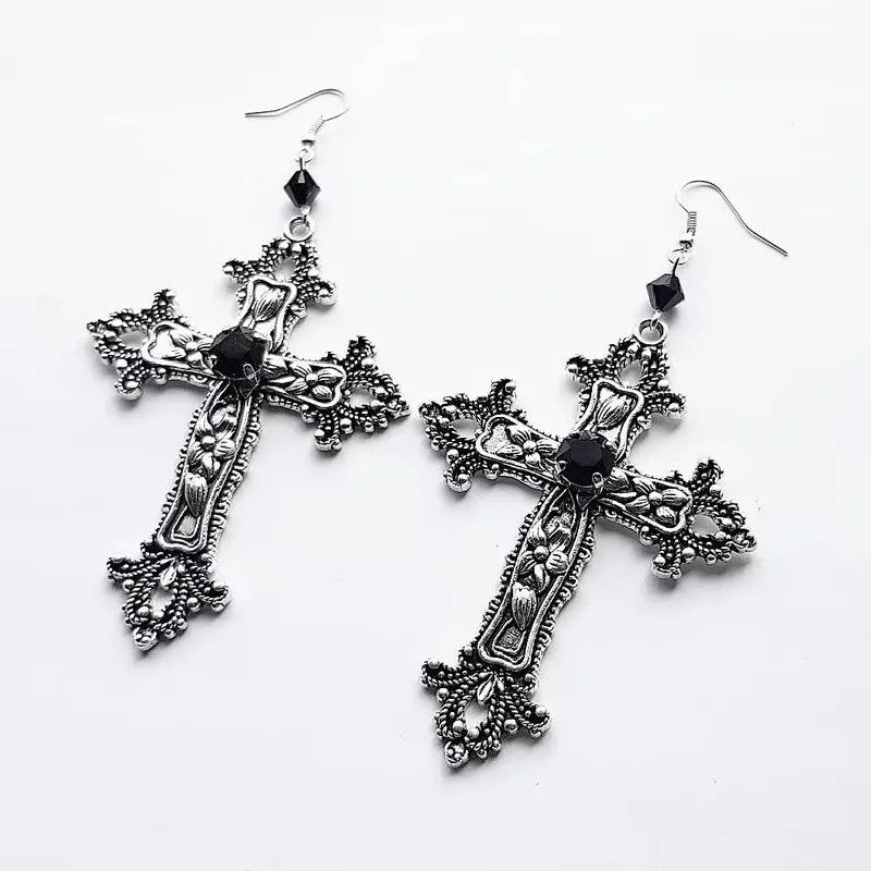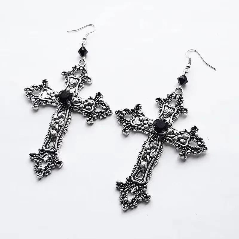 ゴス ラージディテールクロス ブラックドリル ジュエルイヤリング シルバーカラー ゴシックパンクジュエリー ファッション ゴージャス ステートメント レディース ギフト