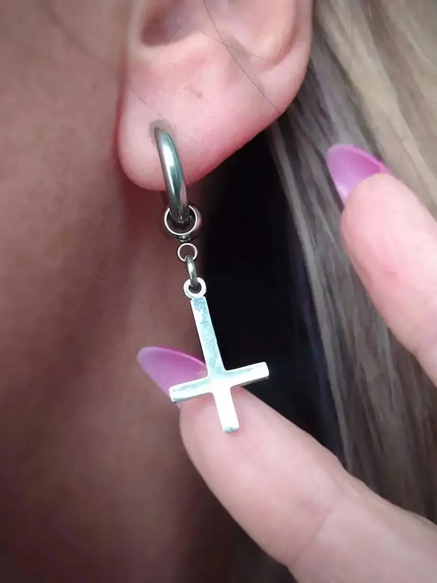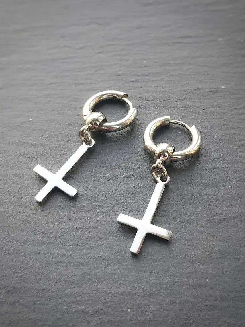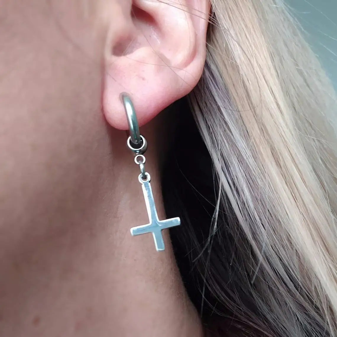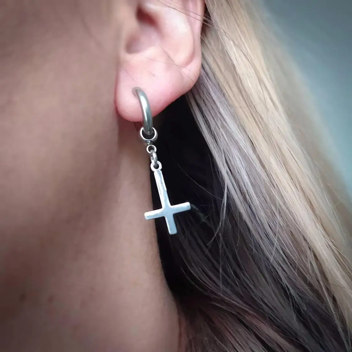 ゴシッククロスペンダントイヤリング レディース メンズ ファッション 韓国 パンク ジュエリー アクセサリー シルバー 逆十字 オルタナティブ イヤーフック