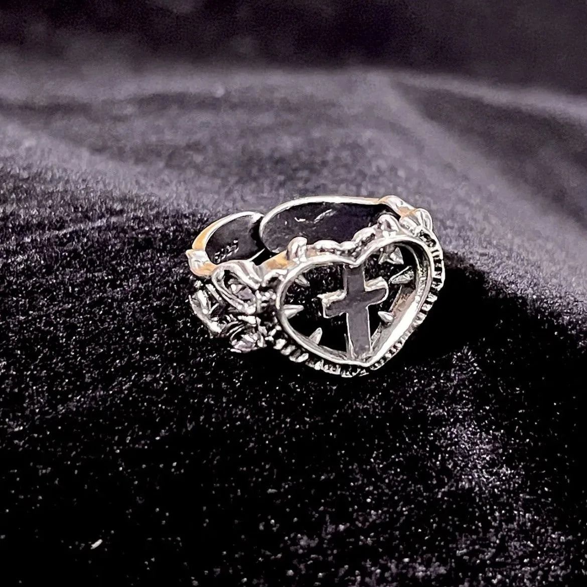 ゴシック デス クロス ハート リング レディース メンズ ファッション パンク パーティー ジュエリー アクセサリー ギフト ヴィンテージ 中空ハート 調節可能 リング 新品