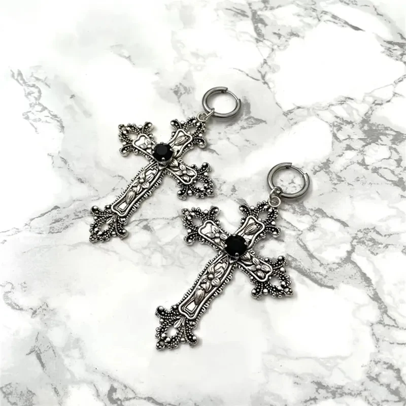 ゴシックなラージシルバーカラートーンのジュエルクロスイヤリング、ブラックパンクハロウィンジュエリー、ゴージャスなウェディングステートメントレディース