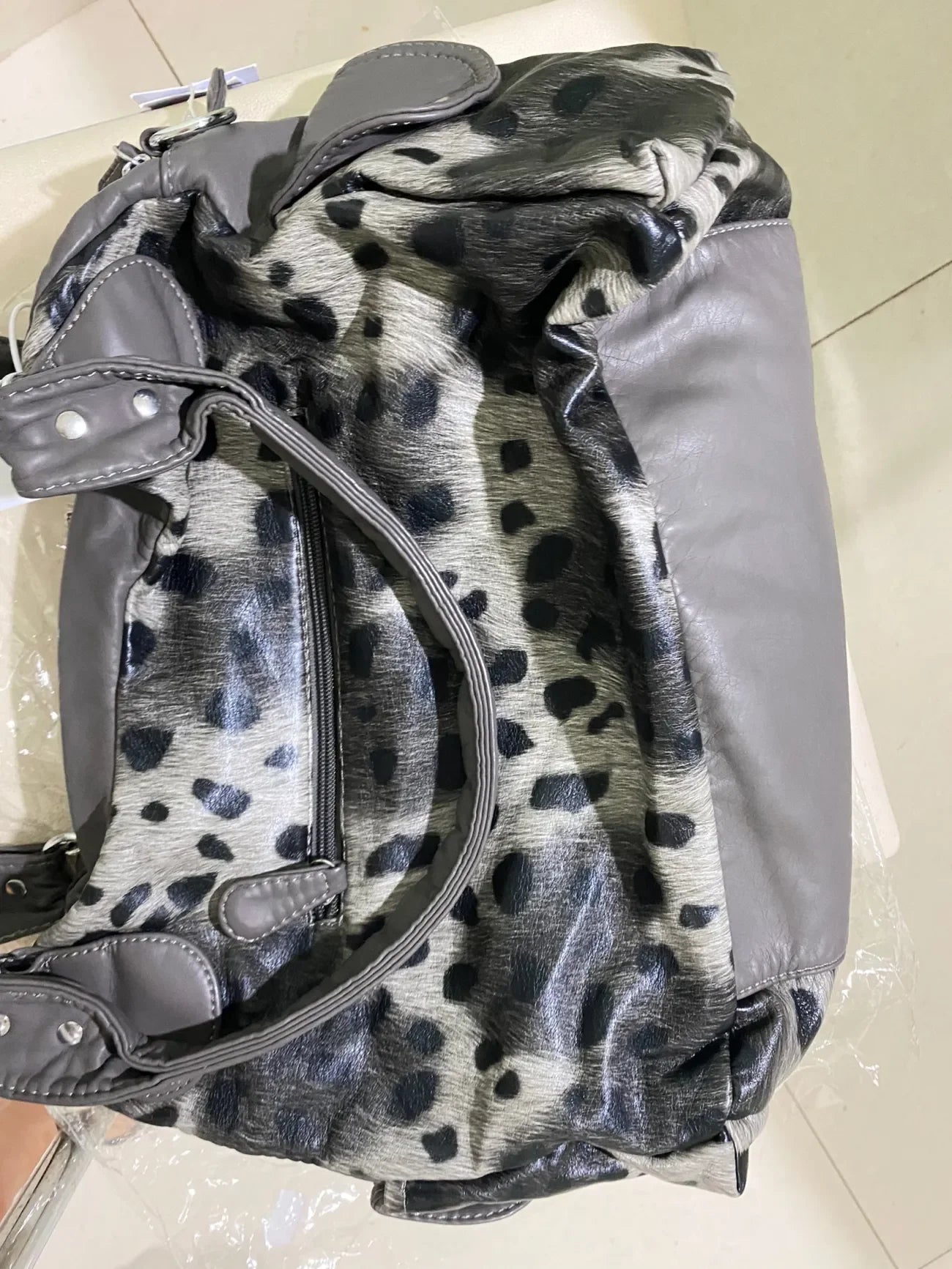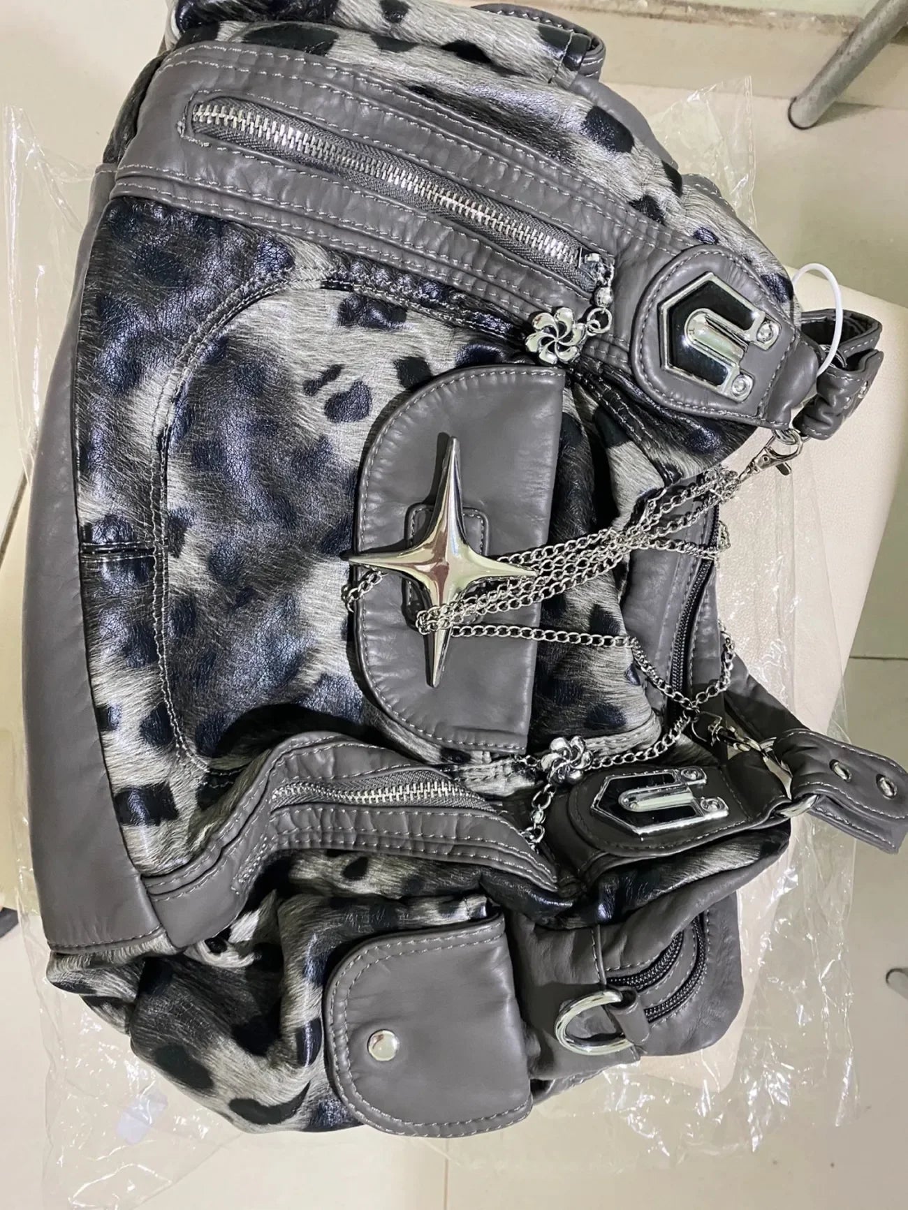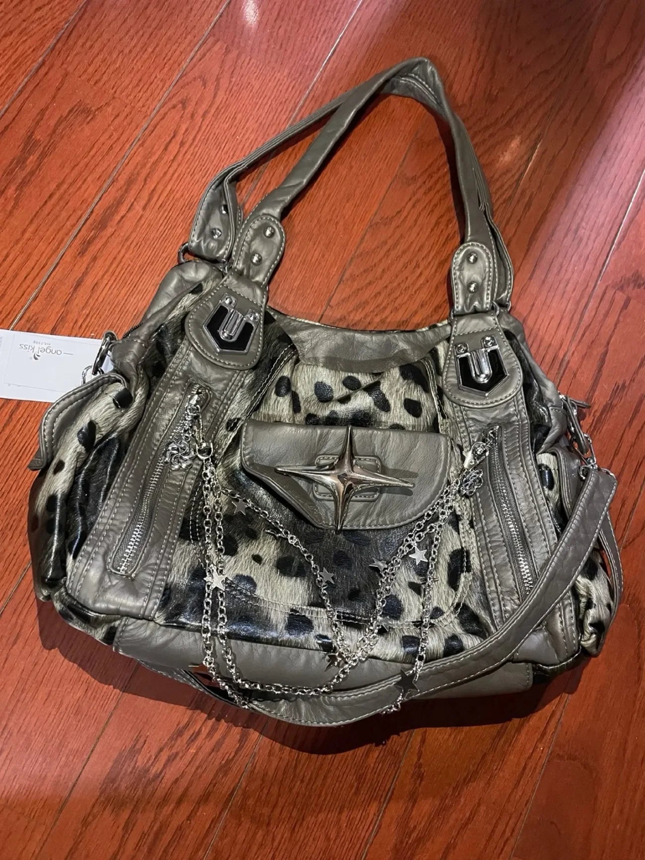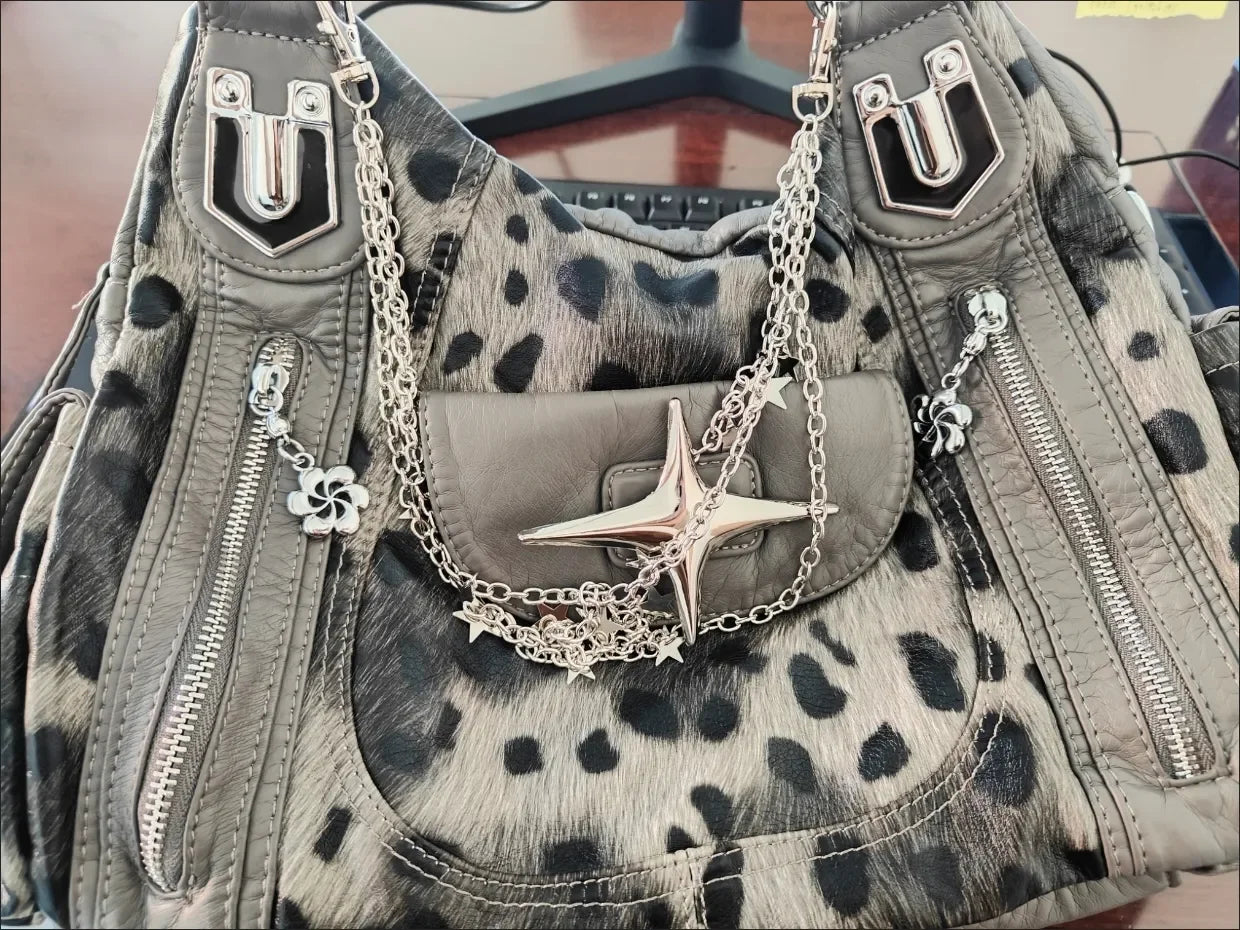 グレーのヒョウ柄ハンドバッグ クロススター サブカルチャー Y2K ショルダーバッグ ホットガール トートバッグ 大容量 ポータブルメッセンジャーバッグ 2024年新作