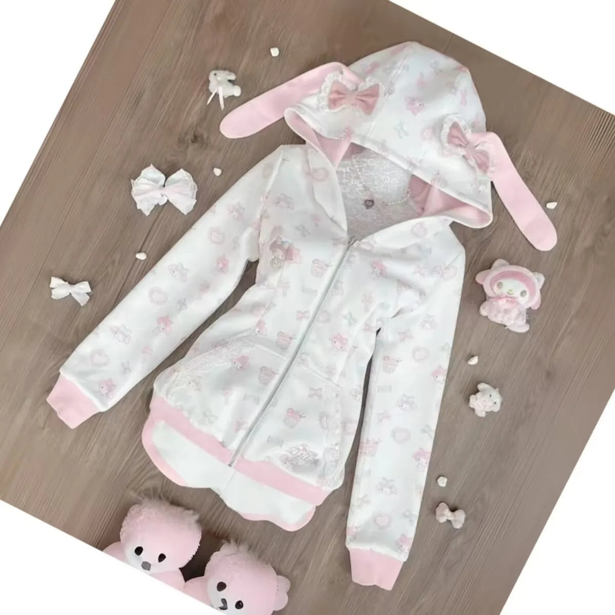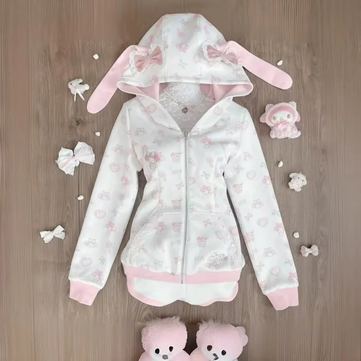原宿系 和風 かわいい スウェットシャツ 漫画 ウサギ プリント パーカー Y2K ピンク サブカルチャー リボン ジップアップ パーカー レディース スリム アニメ パーカー