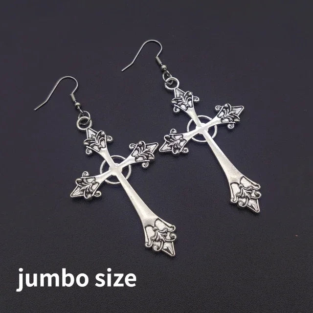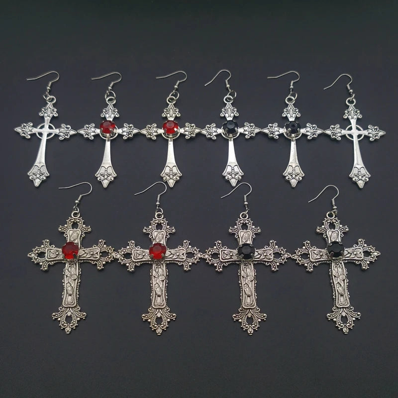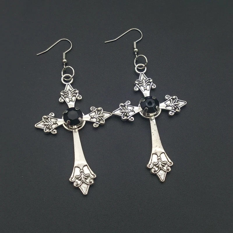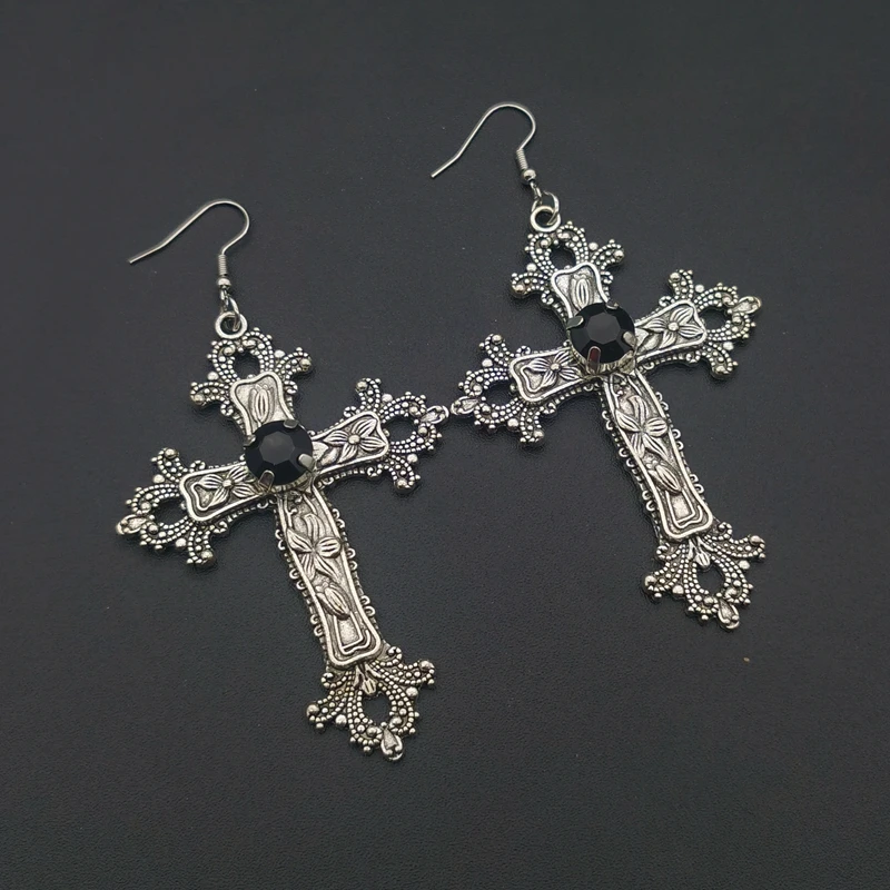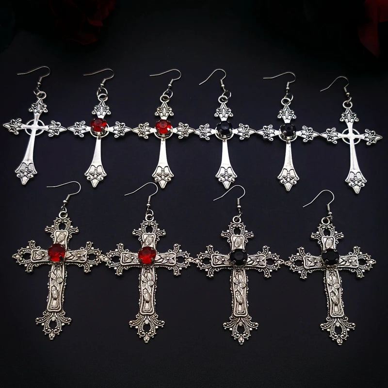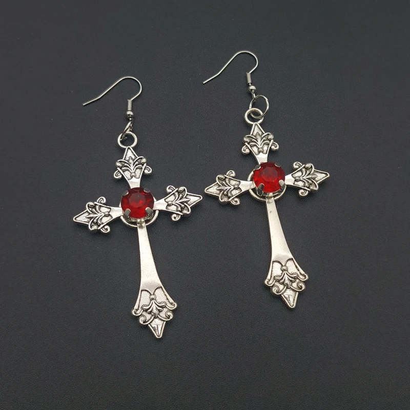 大きなディテールの赤い十字ドリルペンダントジュエルイヤリングシルバーカラートーンゴシックパンクジュエリーファッションチャームステートメント女性ギフト