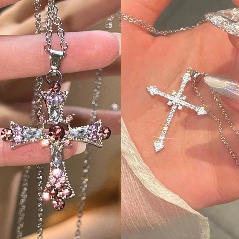 軽くて高級なレディースネックレス。クロスペンダント、フランス製ジルコン、ヨーロッパとアメリカのデザイン。