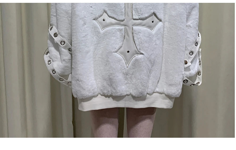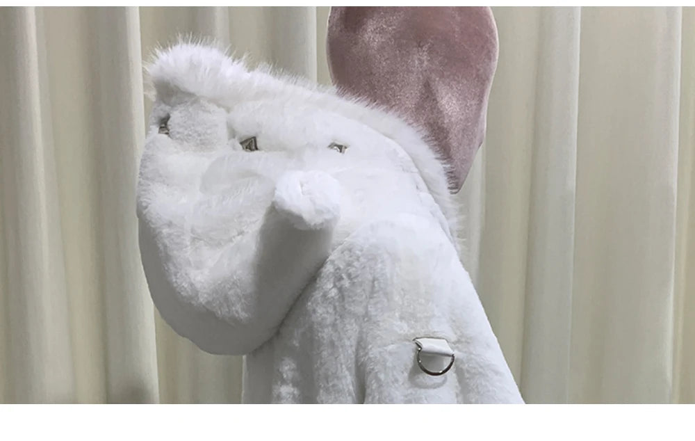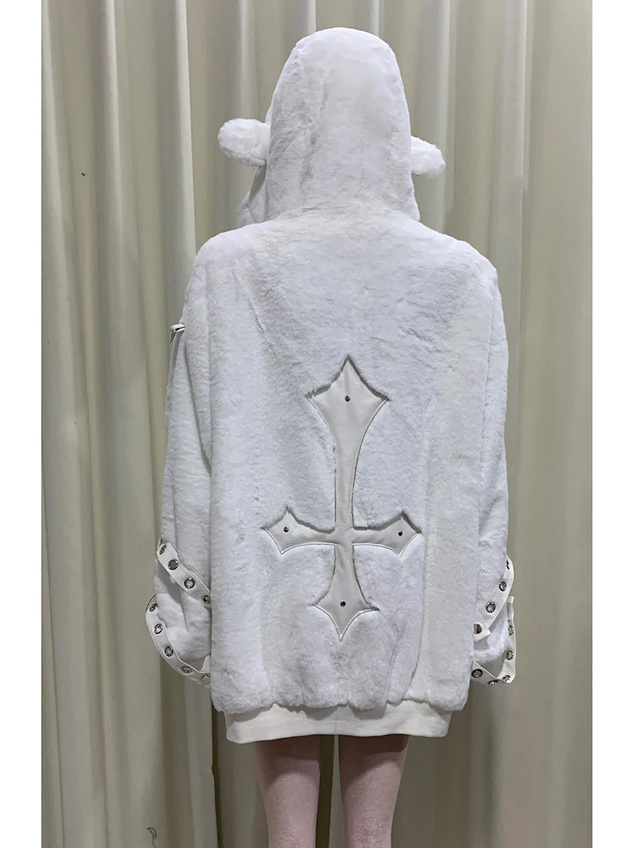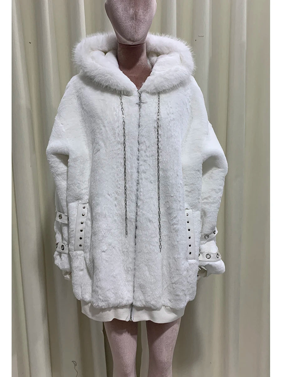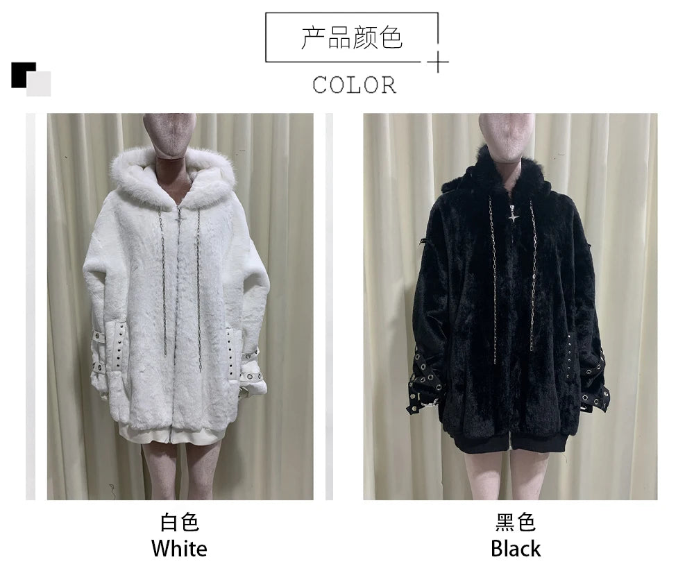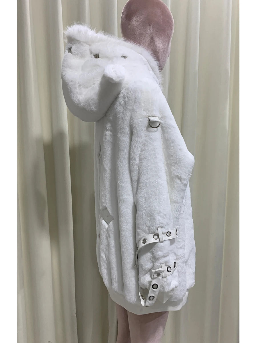 マウロイカルディ 秋冬 オーバーサイズ 暖かい ソフト ホワイト フェイクファーコート レディース フード付き 原宿系 ファッション ふわふわ ジャケット ストリートウェア 2025