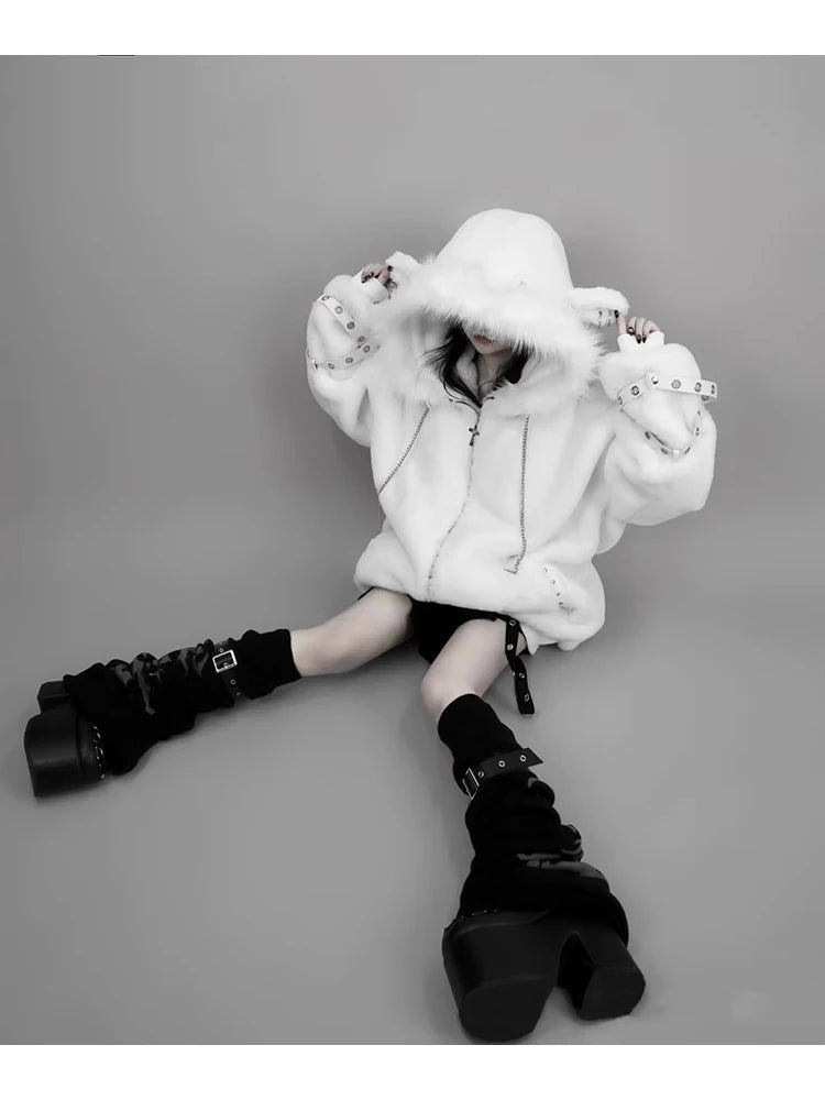 マウロイカルディ 秋冬 オーバーサイズ 暖かい ソフト ホワイト フェイクファーコート レディース フード付き 原宿系 ファッション ふわふわ ジャケット ストリートウェア 2025