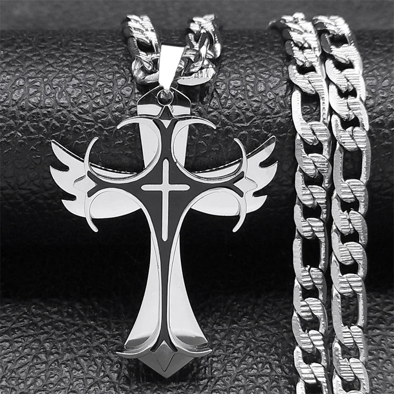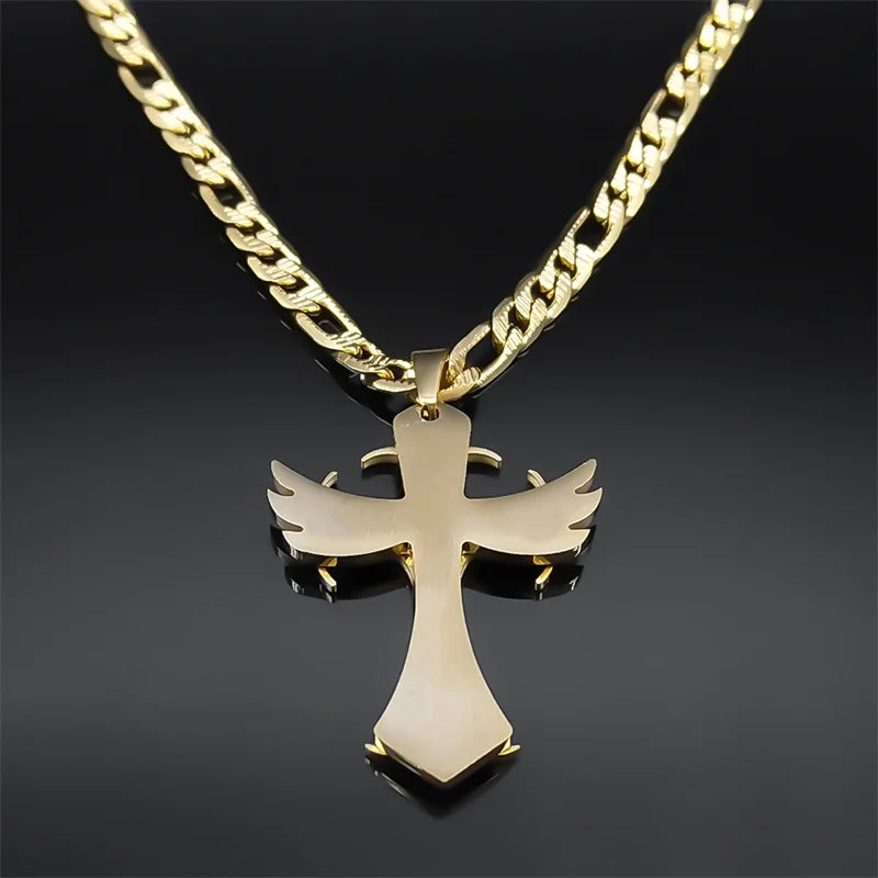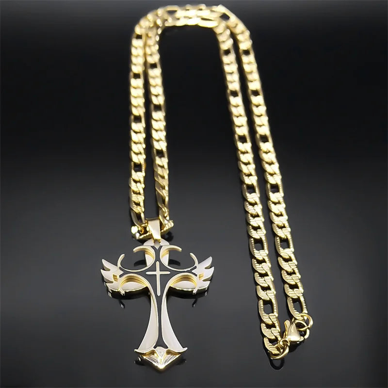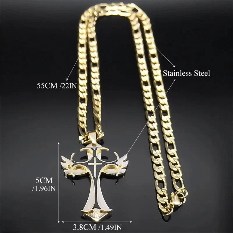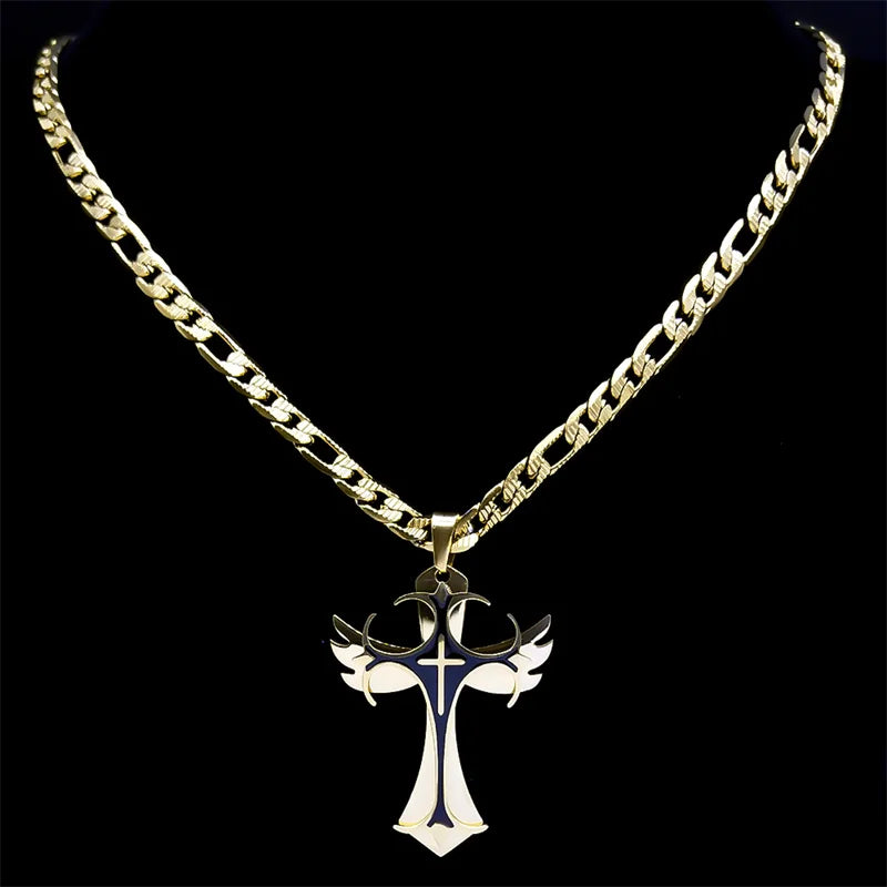 - 多層クリスチャンクロスペンダントネックレス メンズ ヒップホップ ステンレススチール ゴールドカラー 十字架ネックレス 男性用ジュエリーギフト