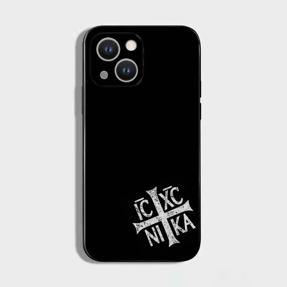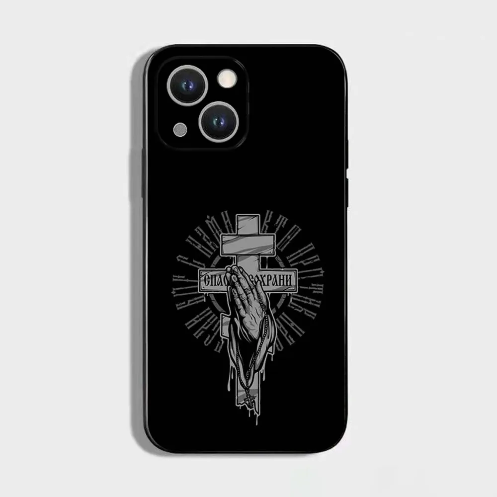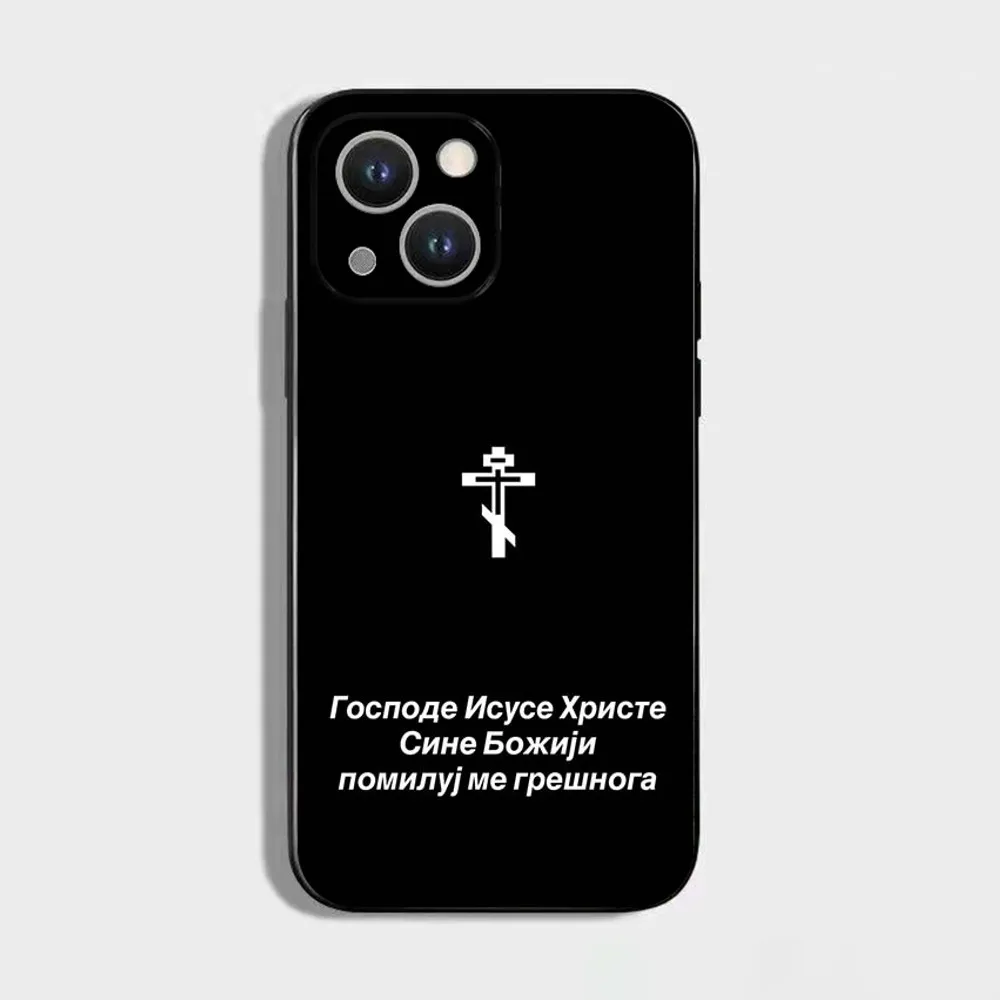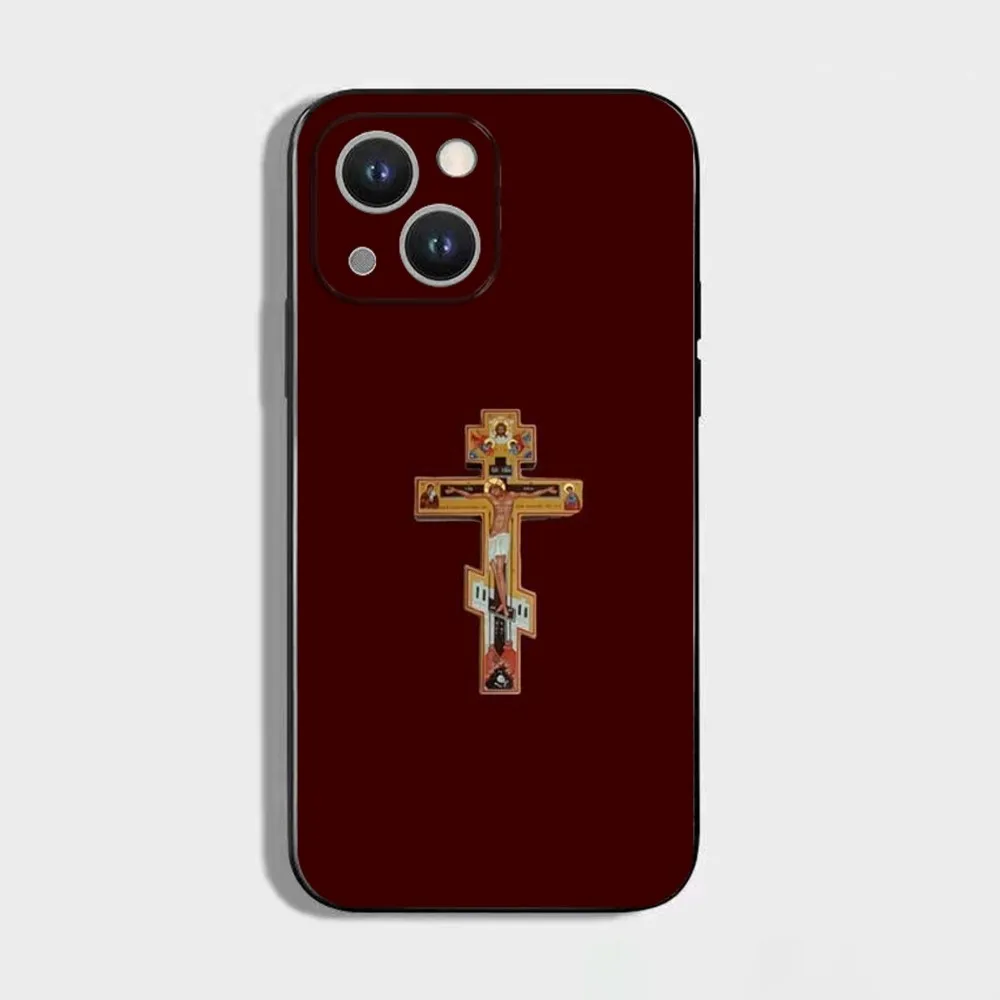 正教会の十字架アイコンの携帯電話ケース、iPhone 16、15、14、13、12、11 Plus、Pro Max、XS、X、XR、SE、Mini、8、7用、ソフトシリコンブラックカバー
