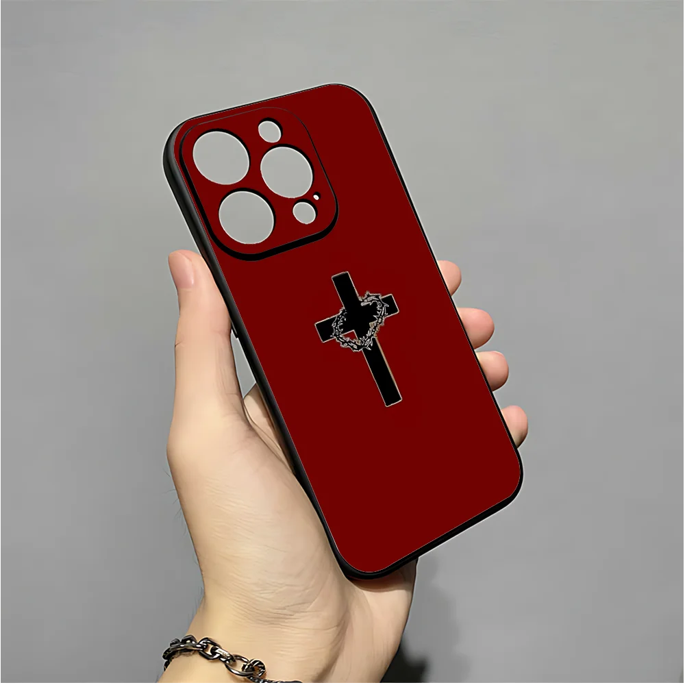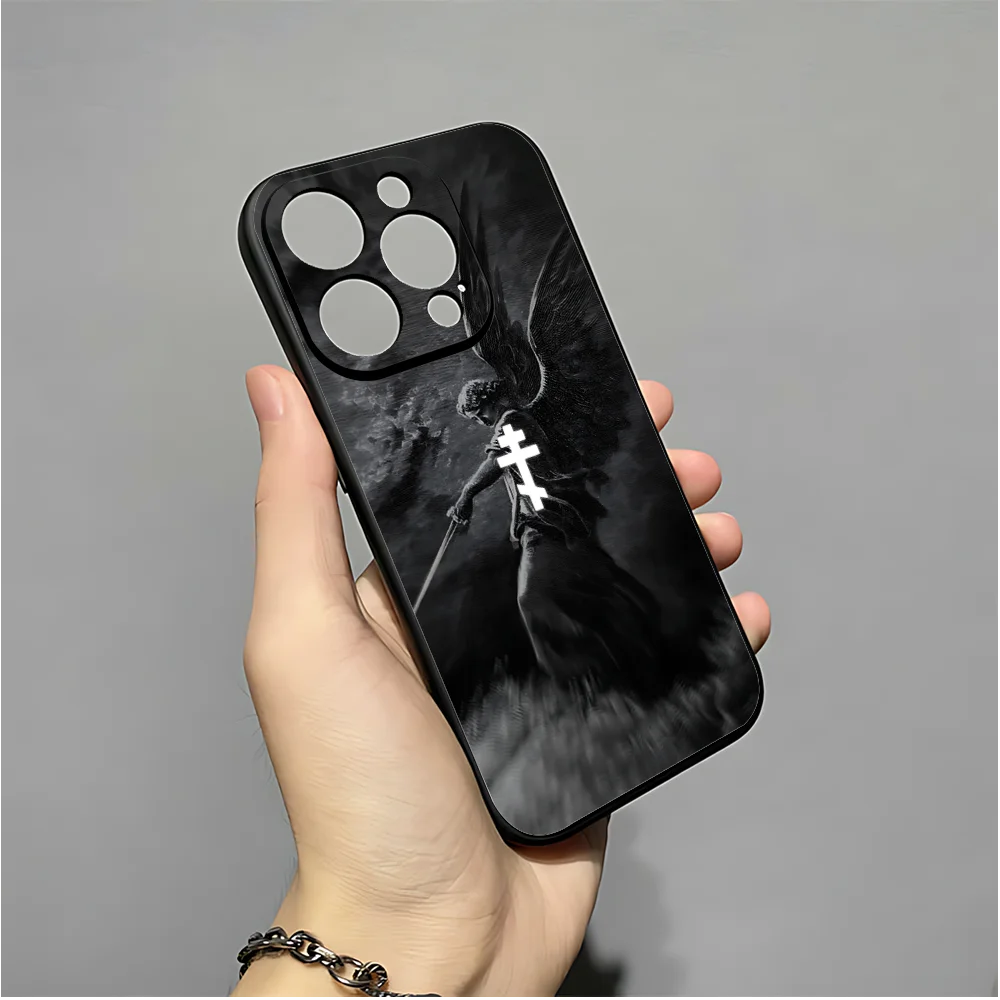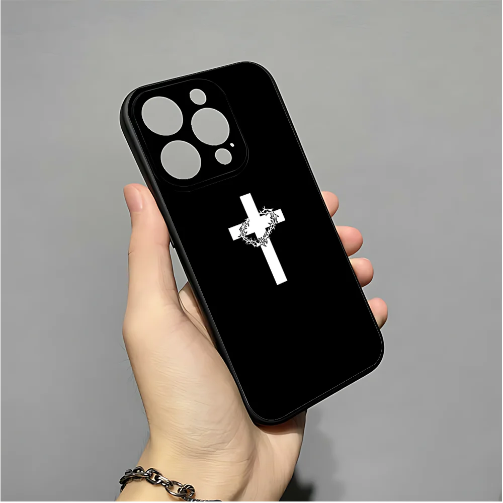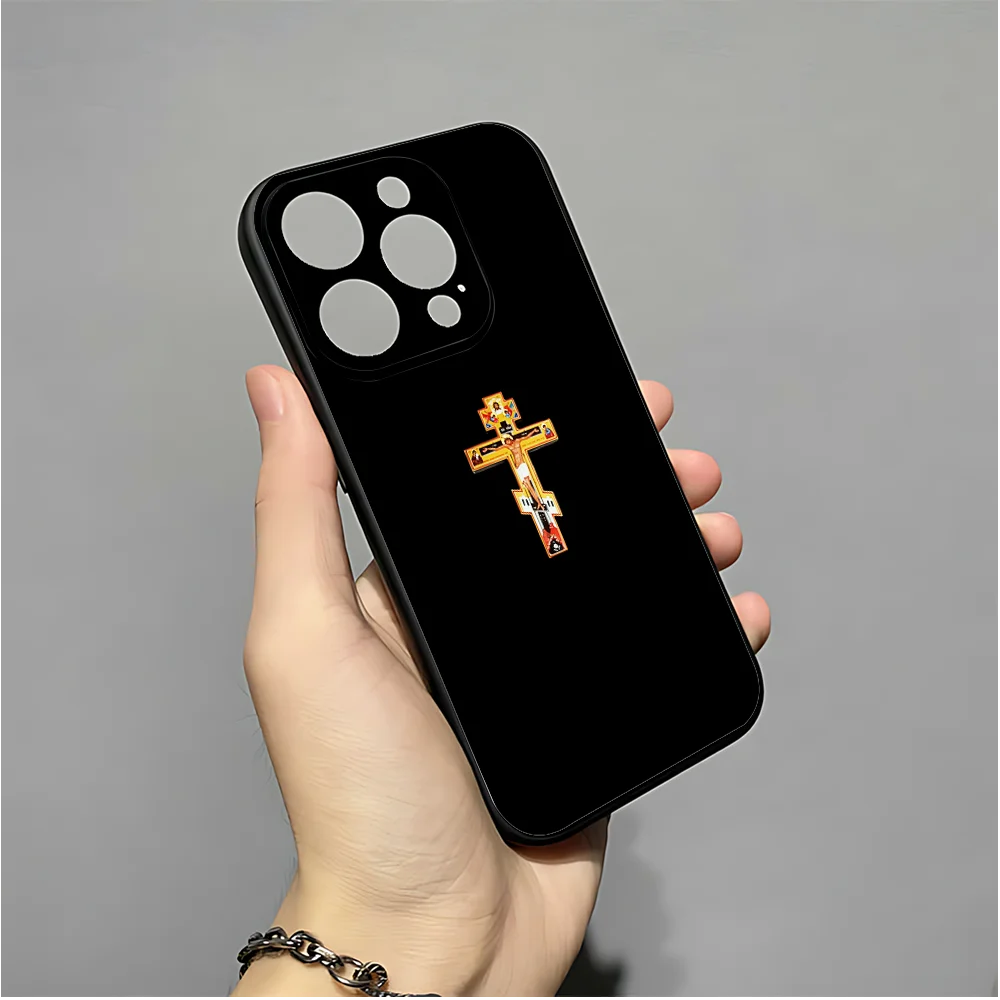 正教会の十字架の携帯電話ケース iPhone 16、15、14、13、12、11、XS、XR、X、8、7、Pro、Max、Plus、mini 用 シリコン ブラック カバー