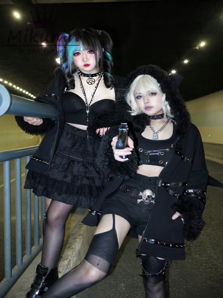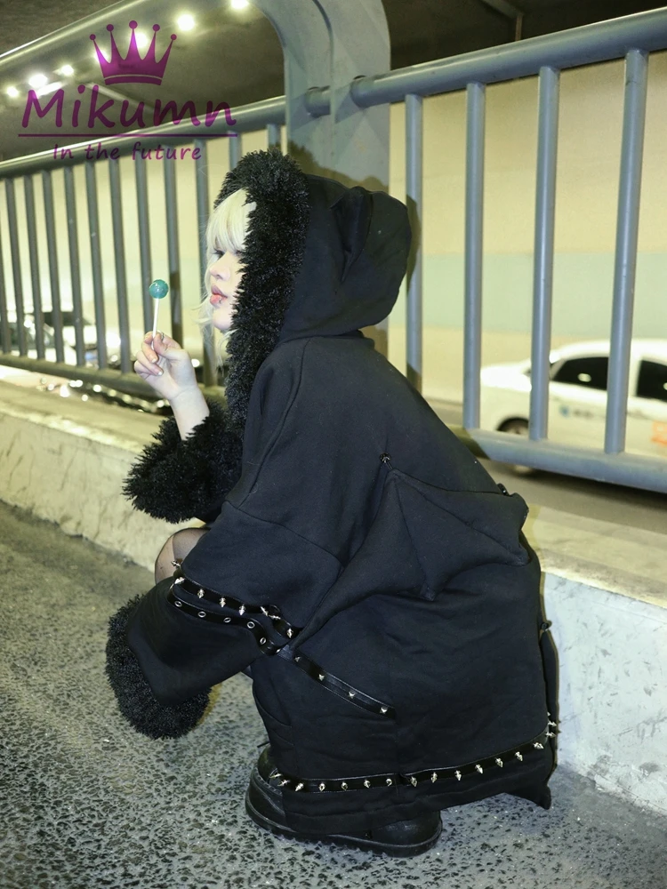 パンクゴシックブラックバットデビルウィングリベットプラッシュ厚手暖かいコート原宿ストリートウェア冬レディースジャケットフード付きジッパーアウターウェア