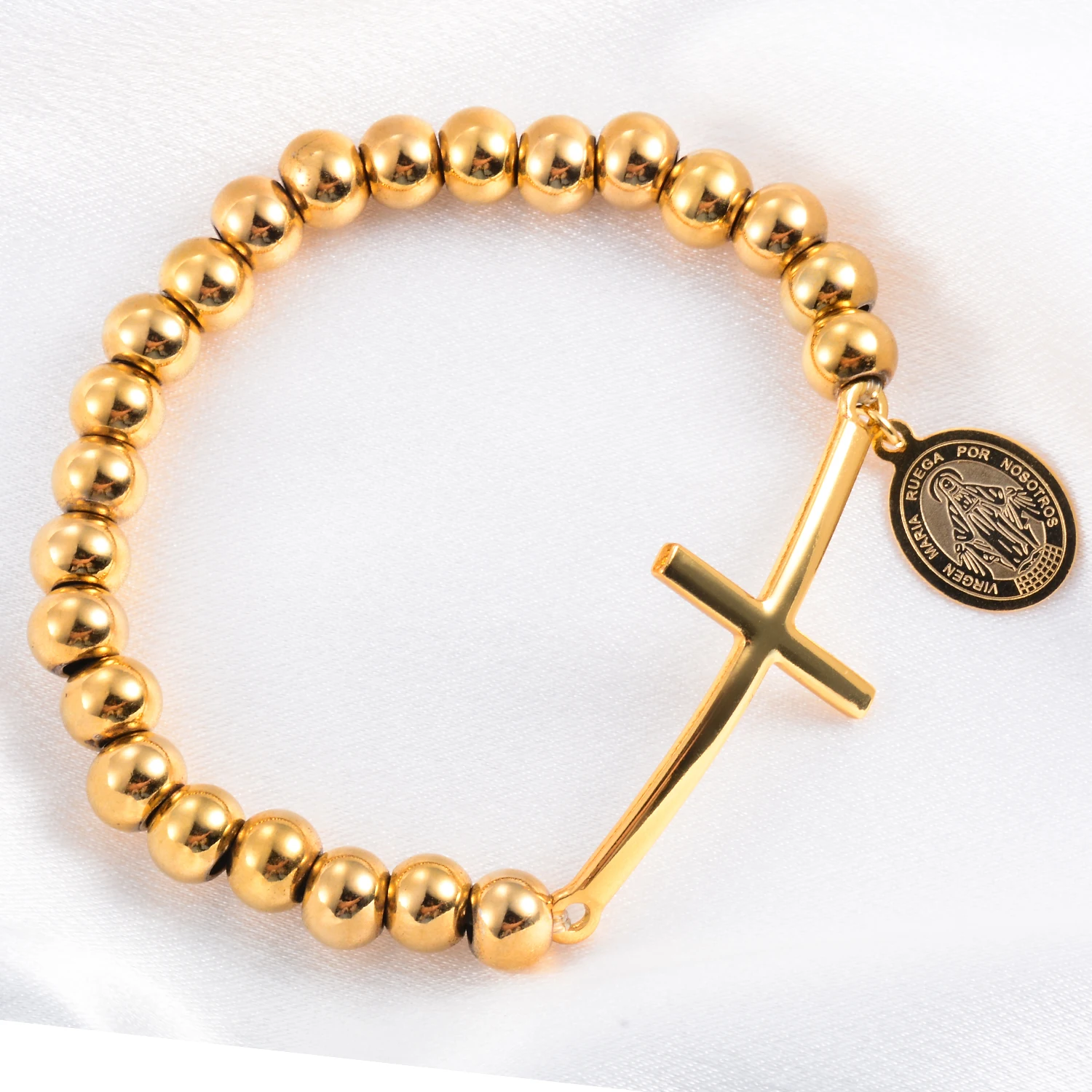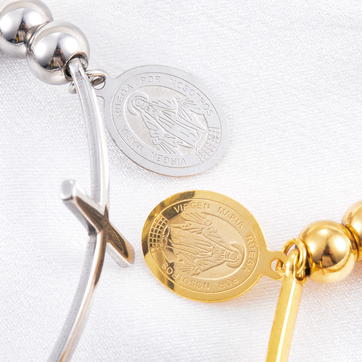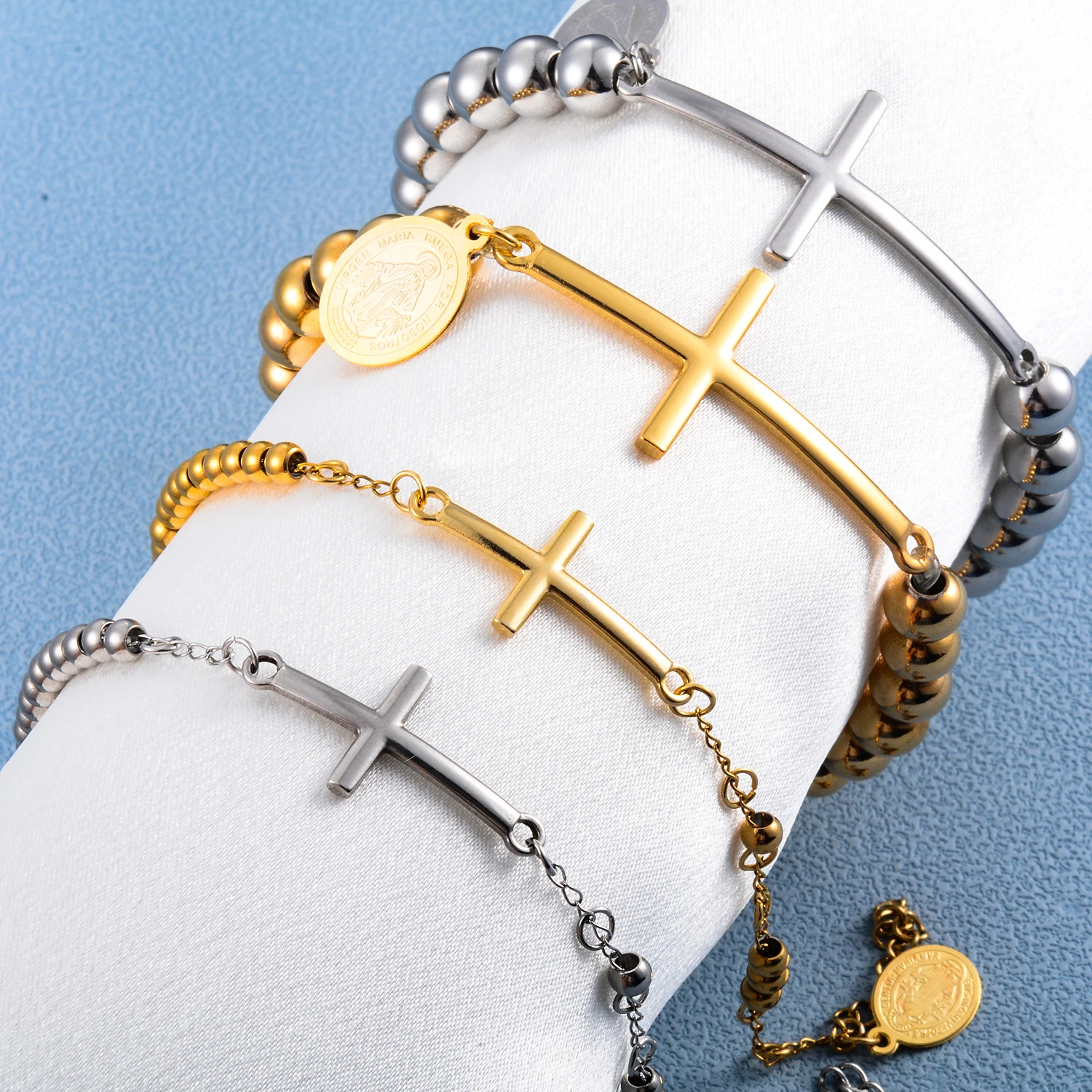 シルバーとゴールドカラーのステンレススチール製イエスの宗教的十字架ペンダントビーズチェーンブレスレット、女性と男性用ファッションジュエリー