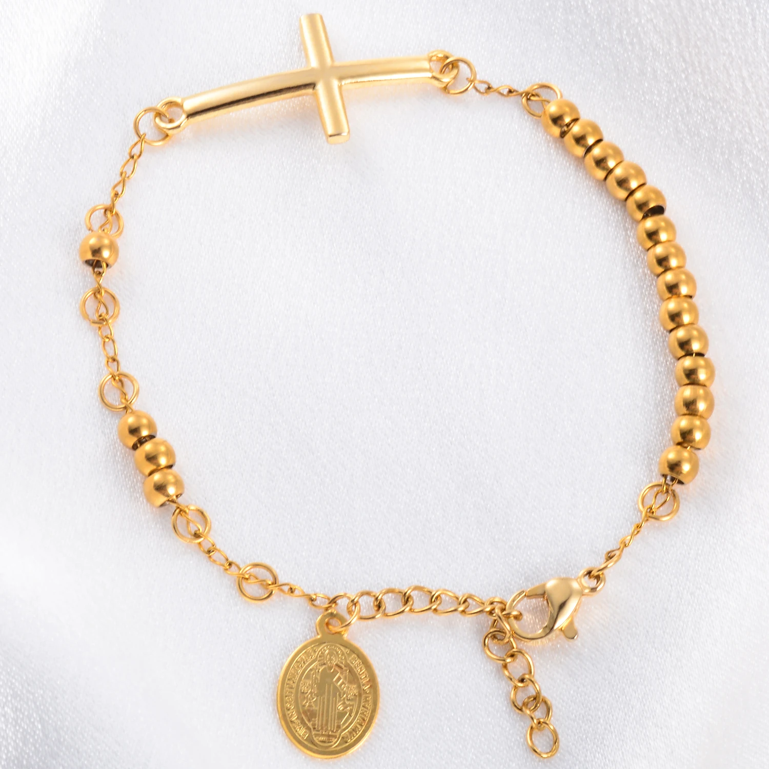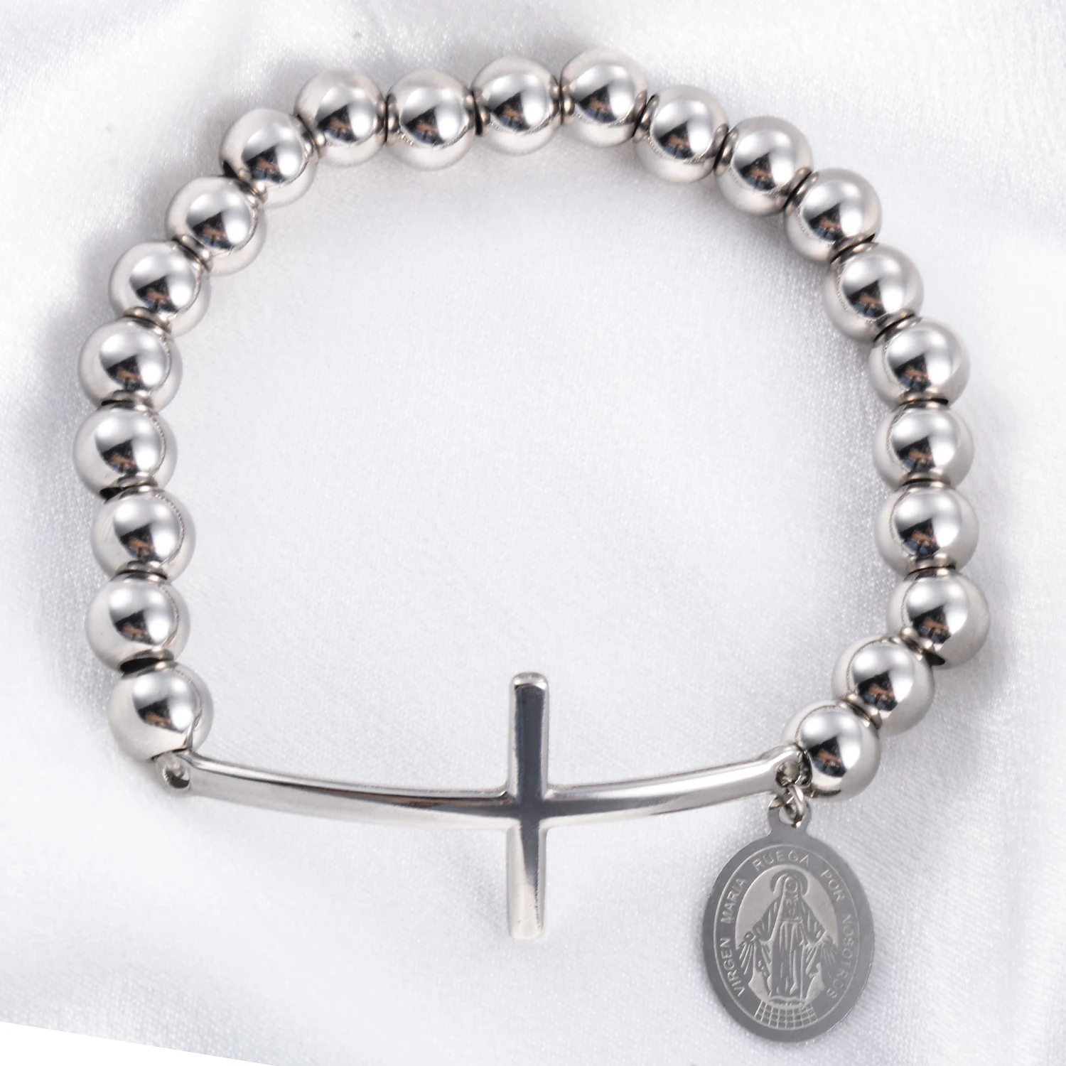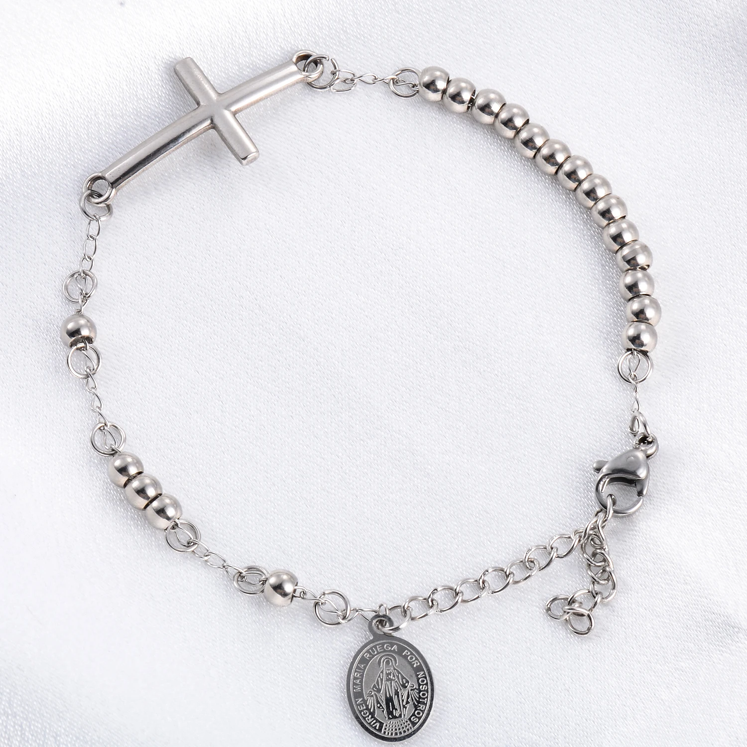 シルバーとゴールドカラーのステンレススチール製イエスの宗教的十字架ペンダントビーズチェーンブレスレット、女性と男性用ファッションジュエリー