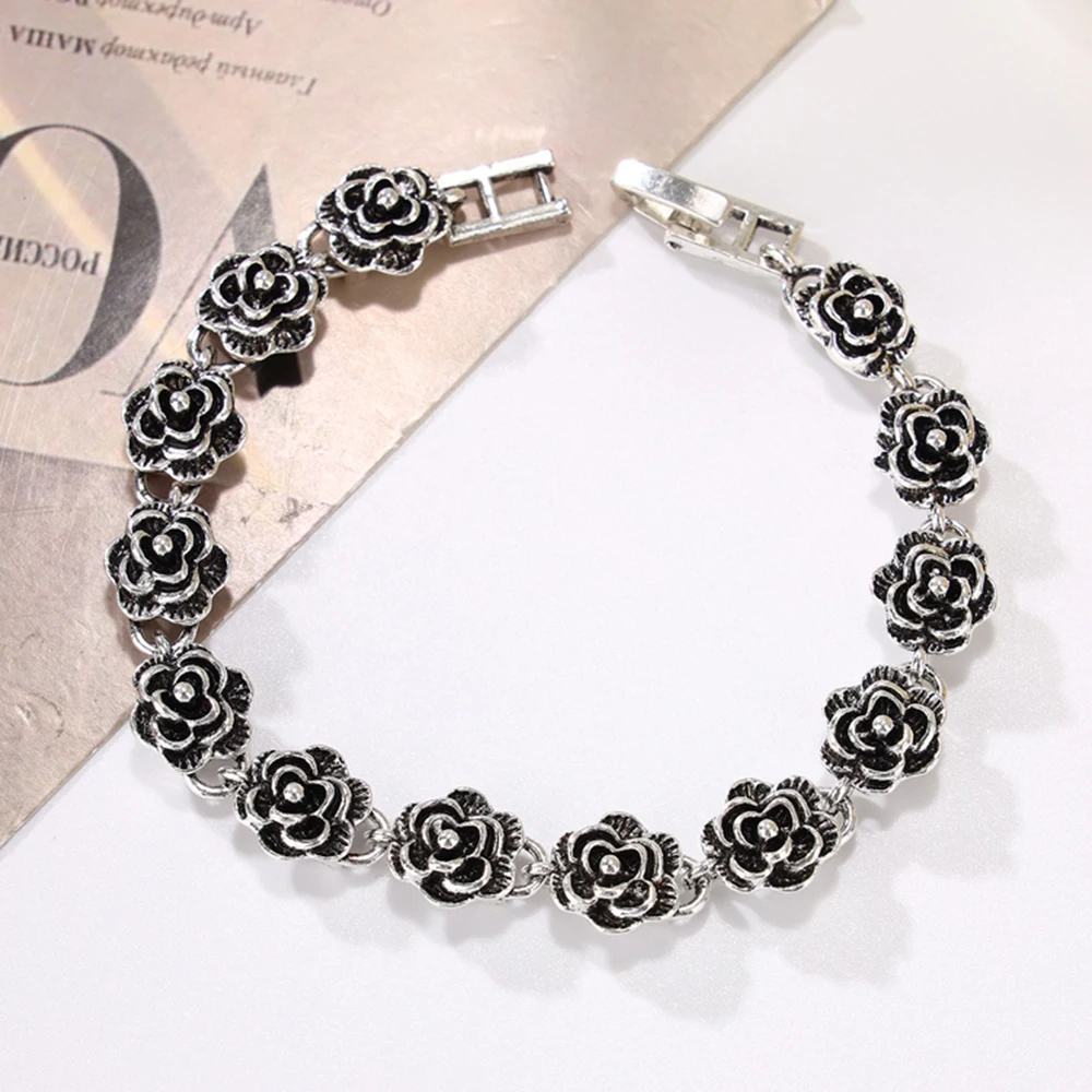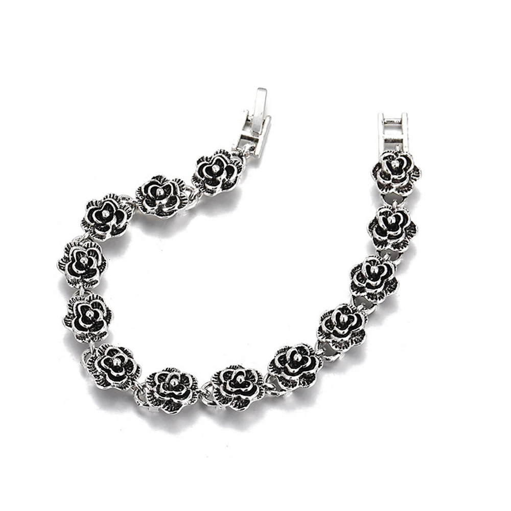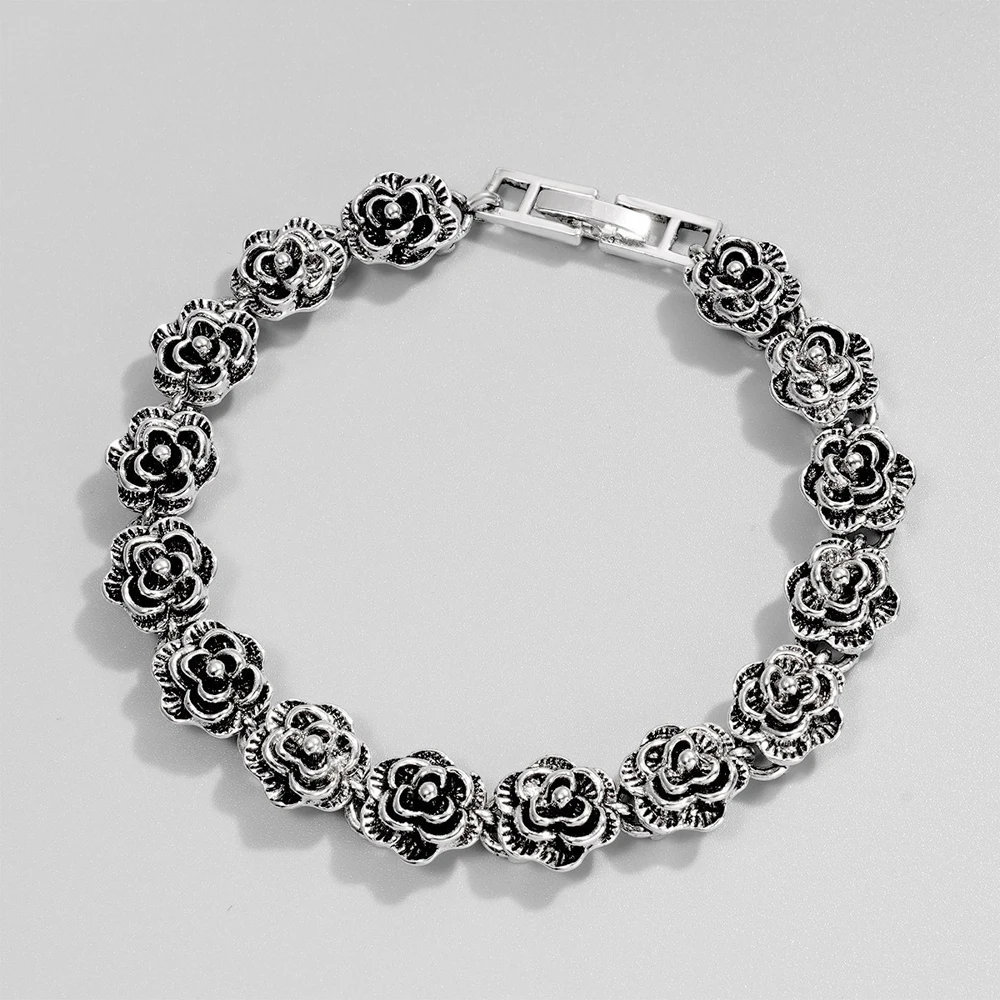 シルバーカラー合金ローズフラワーブレスレット レディース ヨーロッパ アメリカン レトロ 3Dフラワーチャームブレスレット レディース ジュエリー アクセサリー