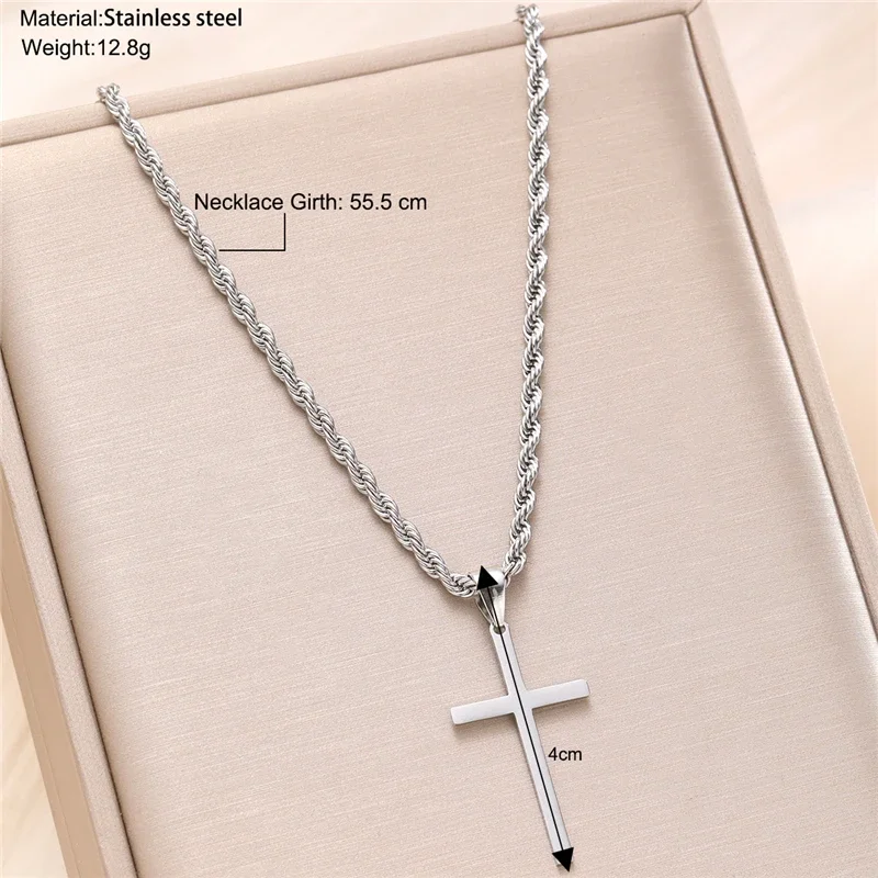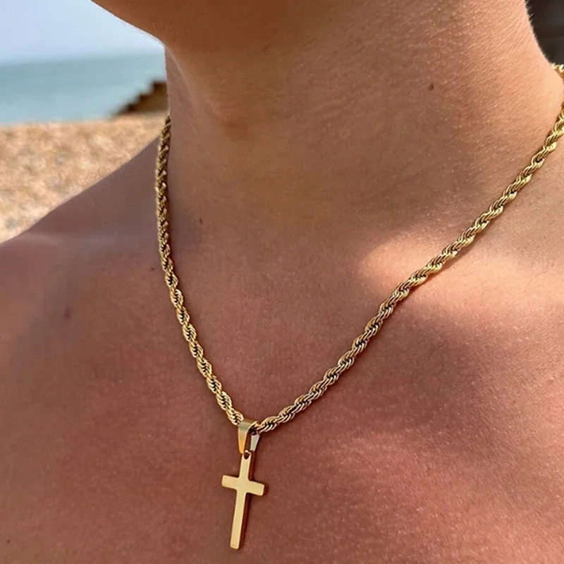 ステンレススチール製クロスペンダントネックレス メンズ ボーイズ 18Kゴールドメッキ シルバー シンプルツイストチェーン ファッショナブルジュエリー ビーチパーティー