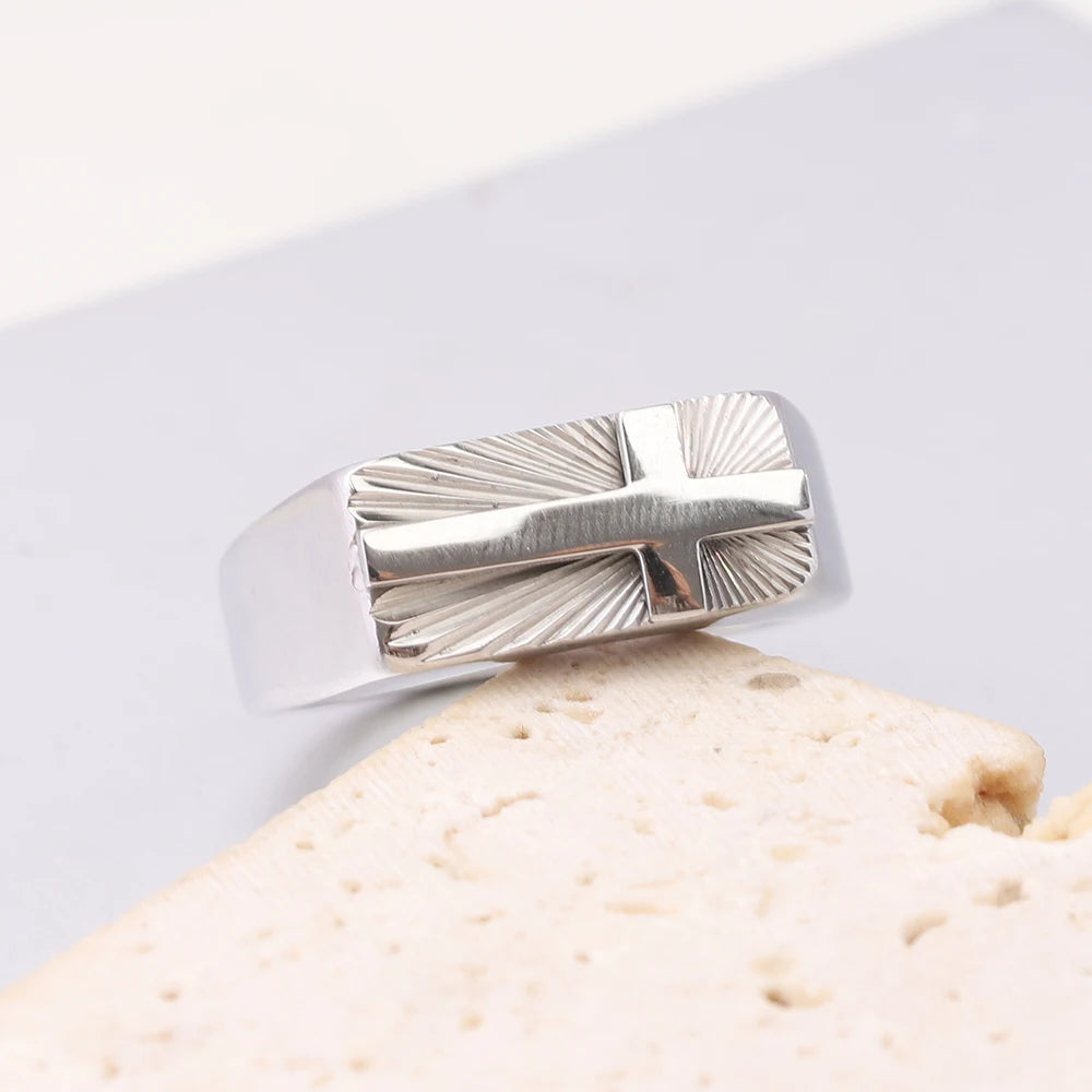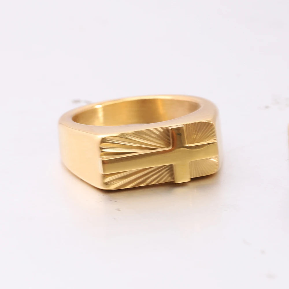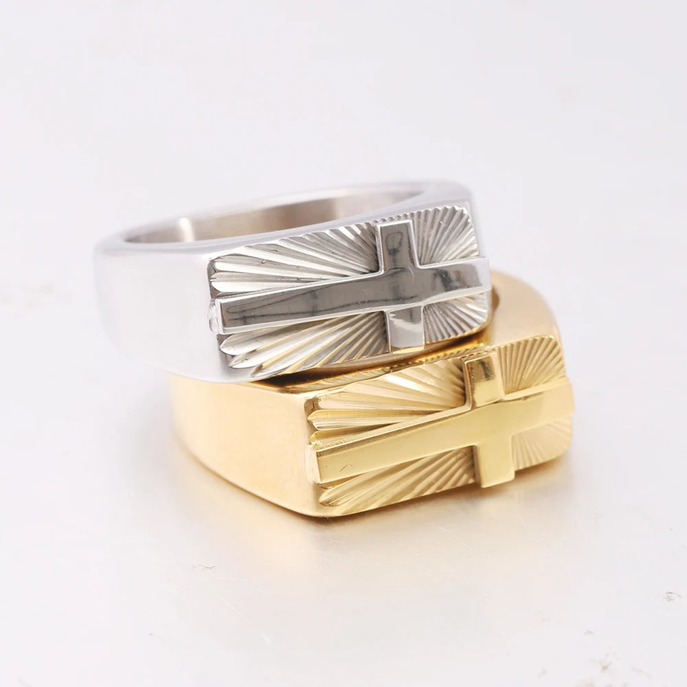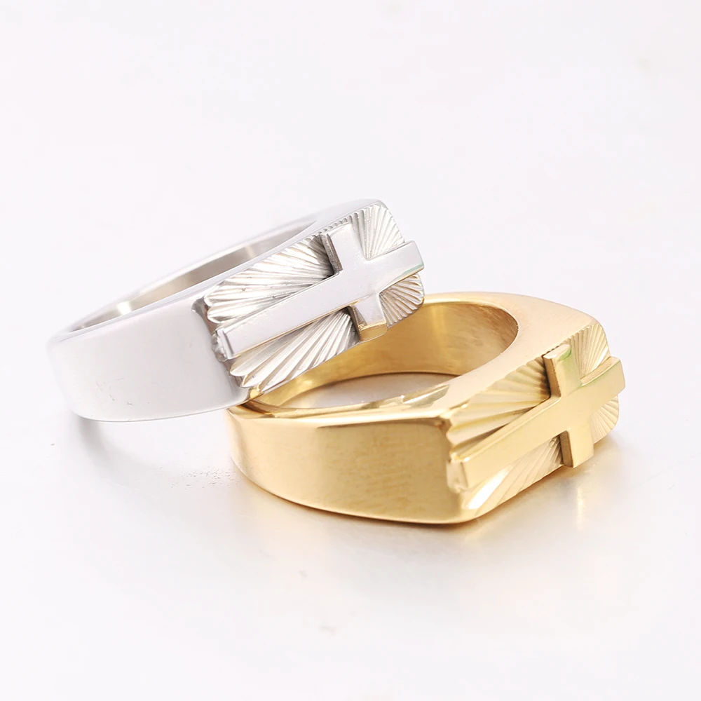 男性用ステンレススチール製クロスリング。シルバーとゴールドトーン、美しいサンバーストパターン。