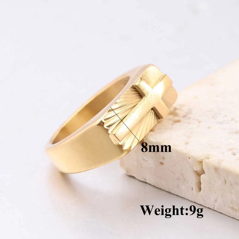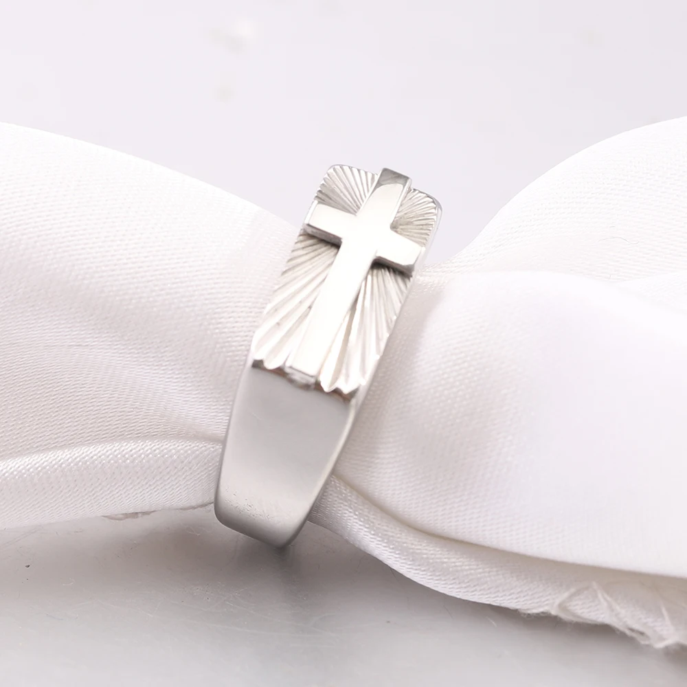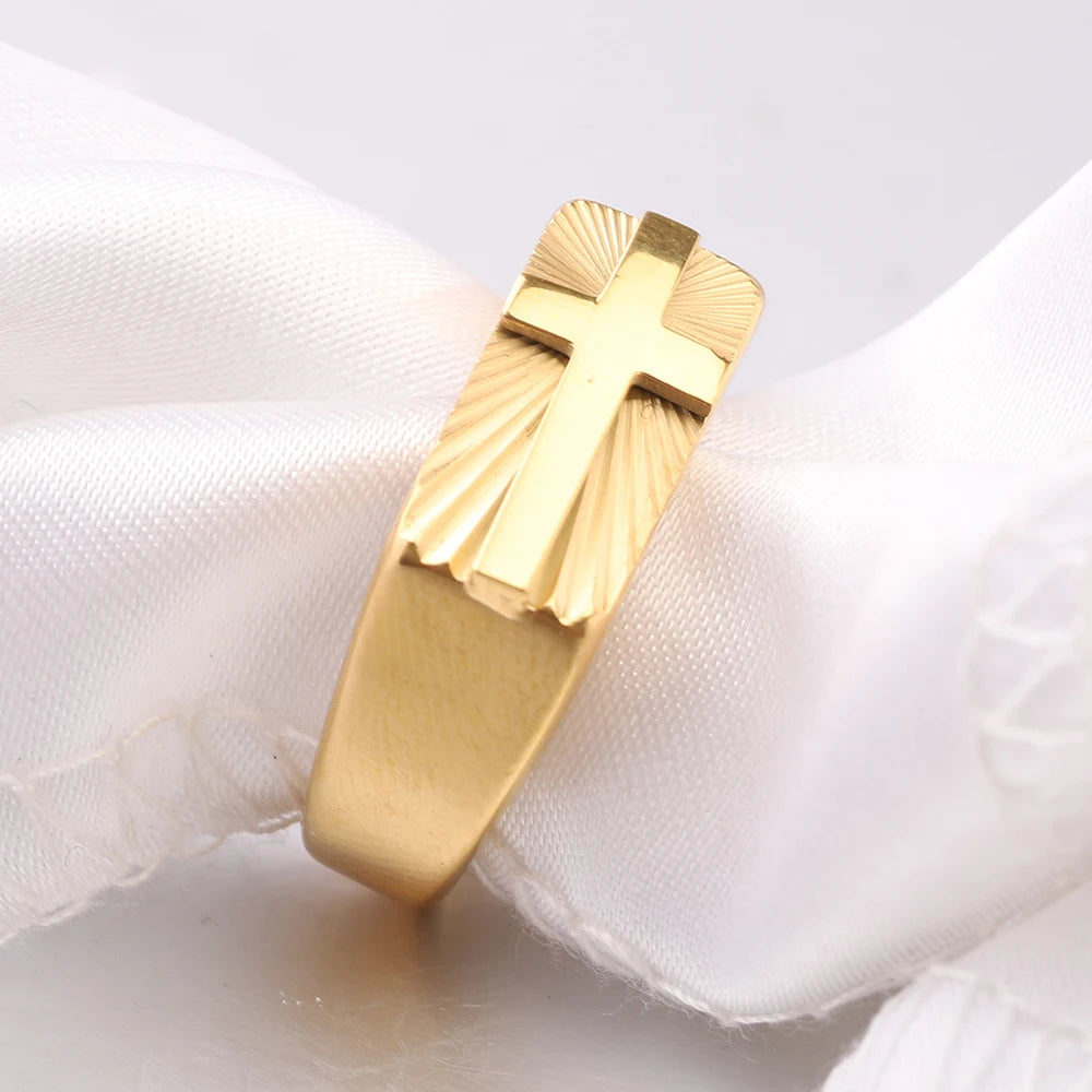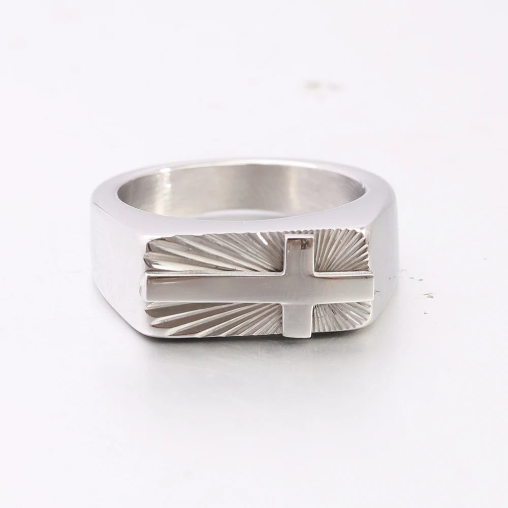 男性用ステンレススチール製クロスリング。シルバーとゴールドトーン、美しいサンバーストパターン。