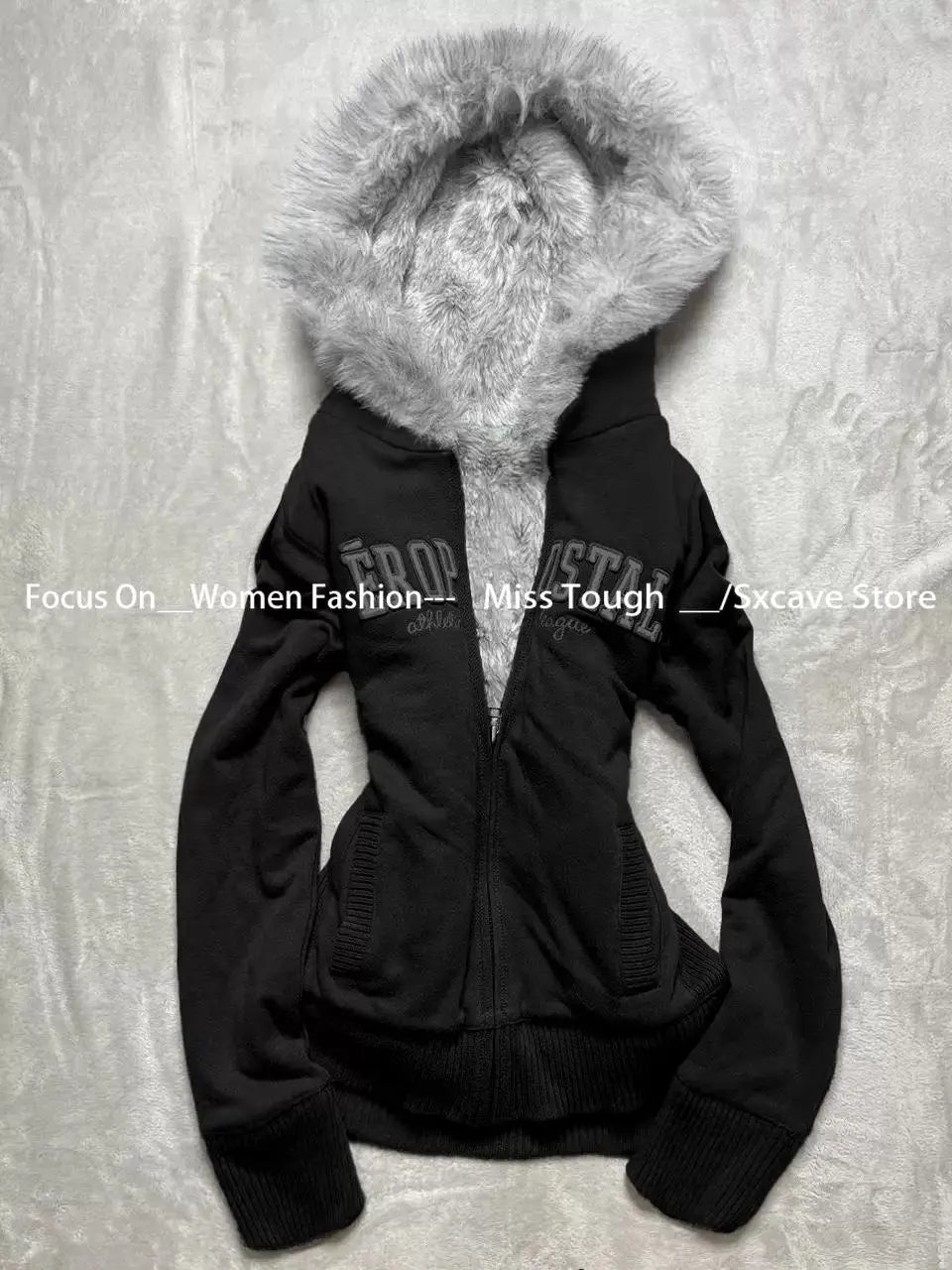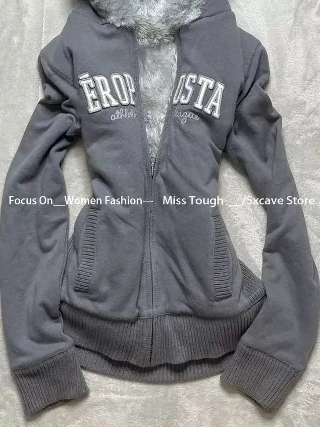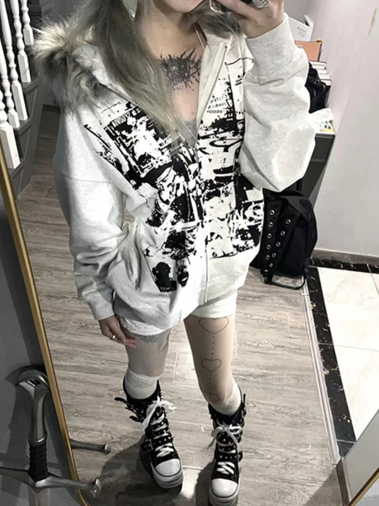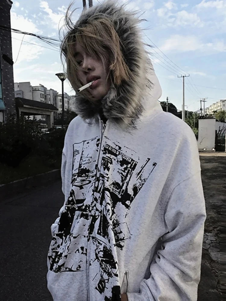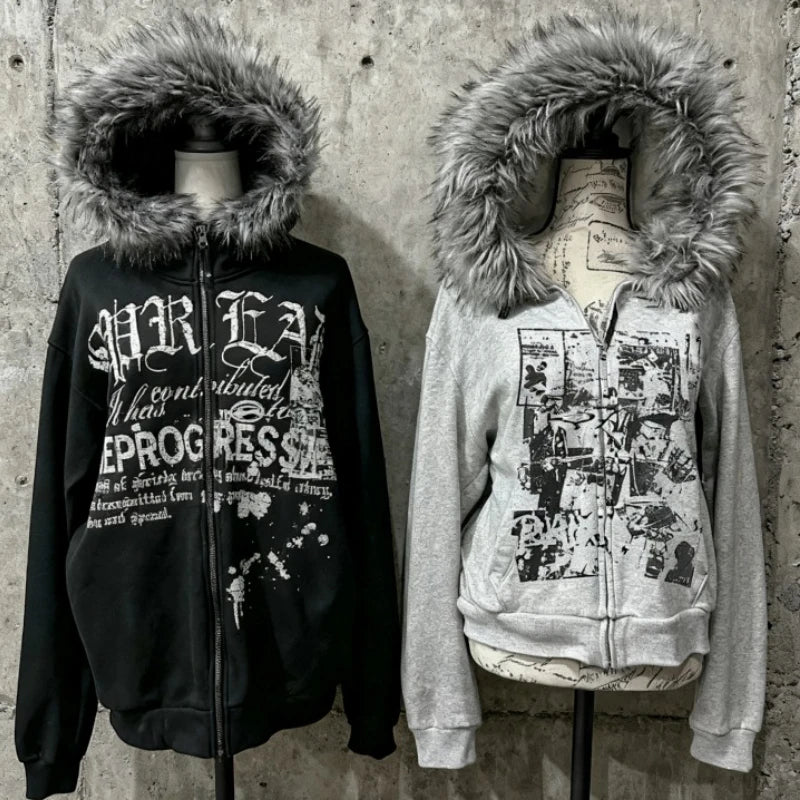 サブカルチャーフェイクコート レディース グラフィックジャケット フード付きフリースファーフーディー エッジの効いたアメリカンレトロストリートスタイルとY2Kファッショントップス