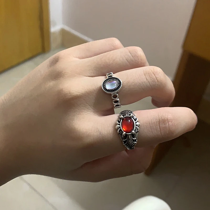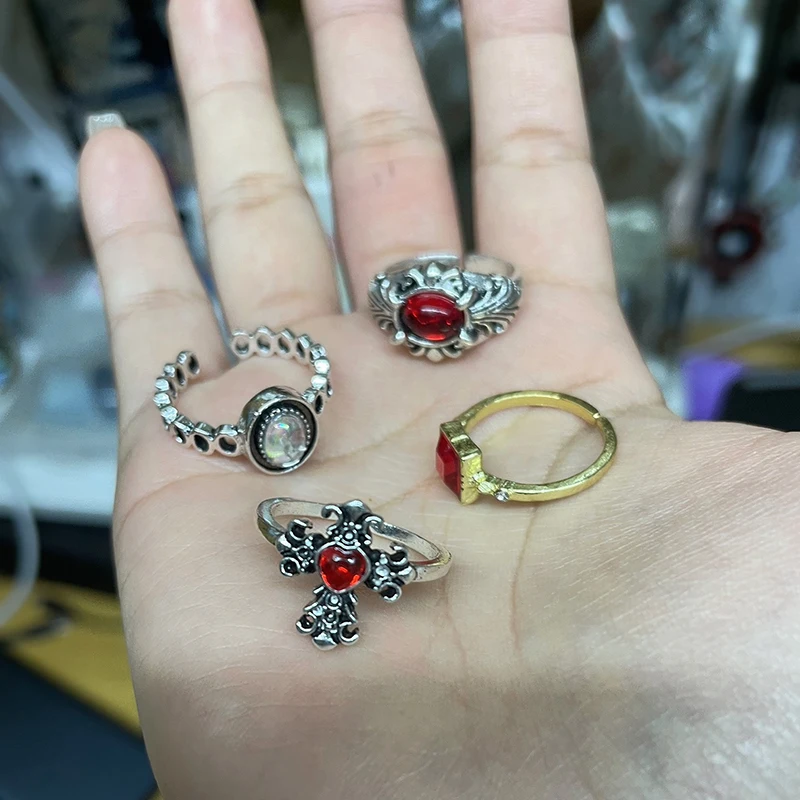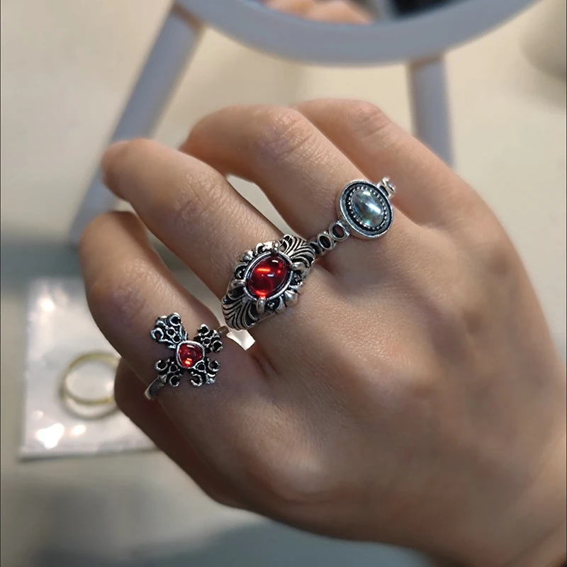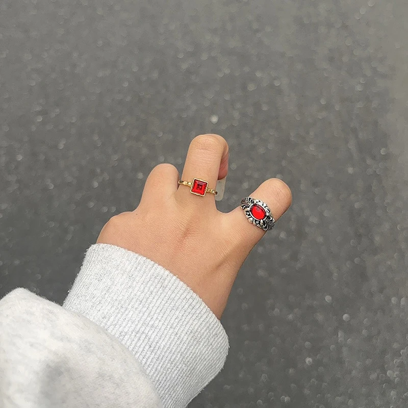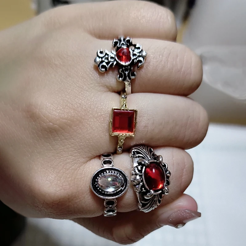 ヴィンテージゴシック調レッドクリスタルクロスジオメトリック美的オープンリングレディースガールパンクグランジジュエリーメンズリング