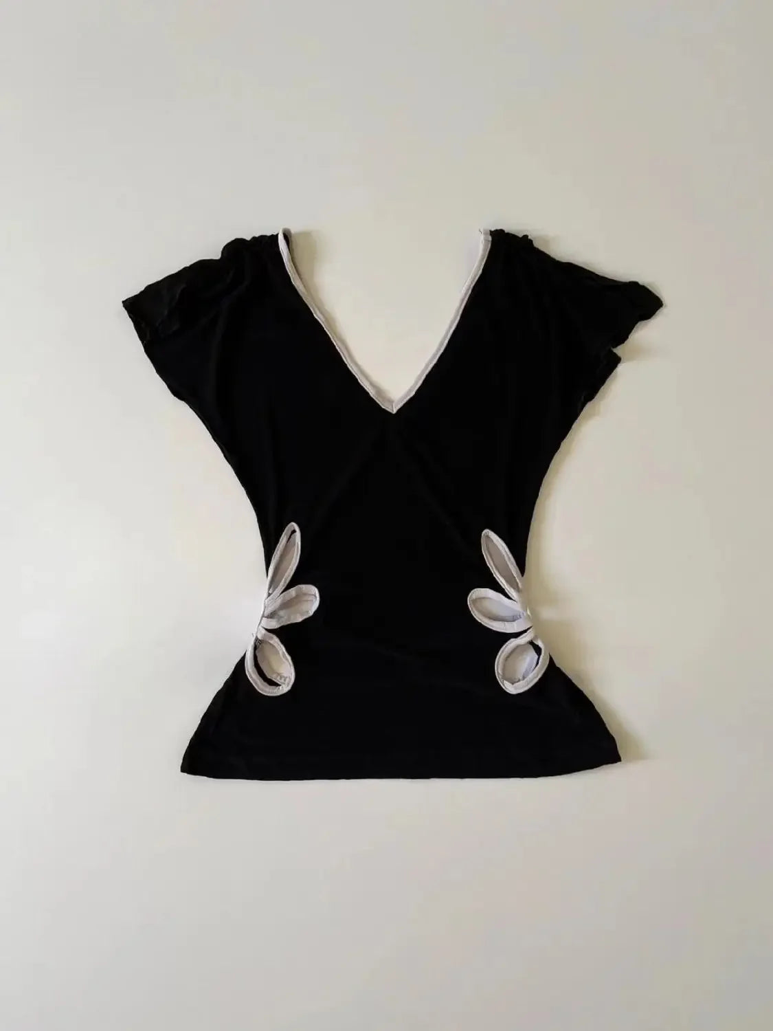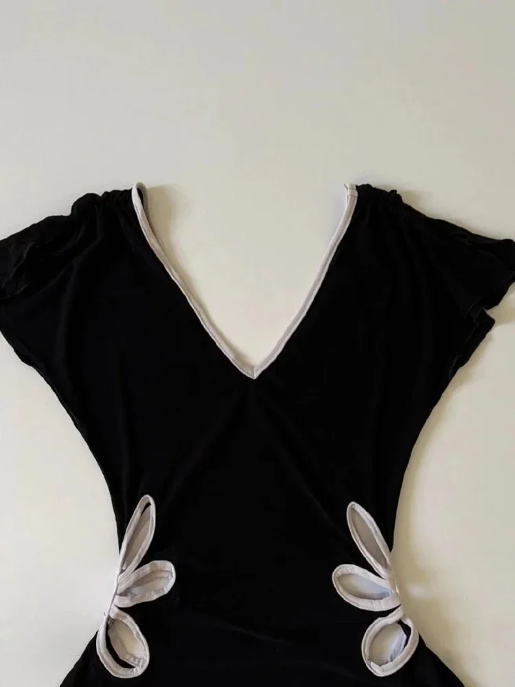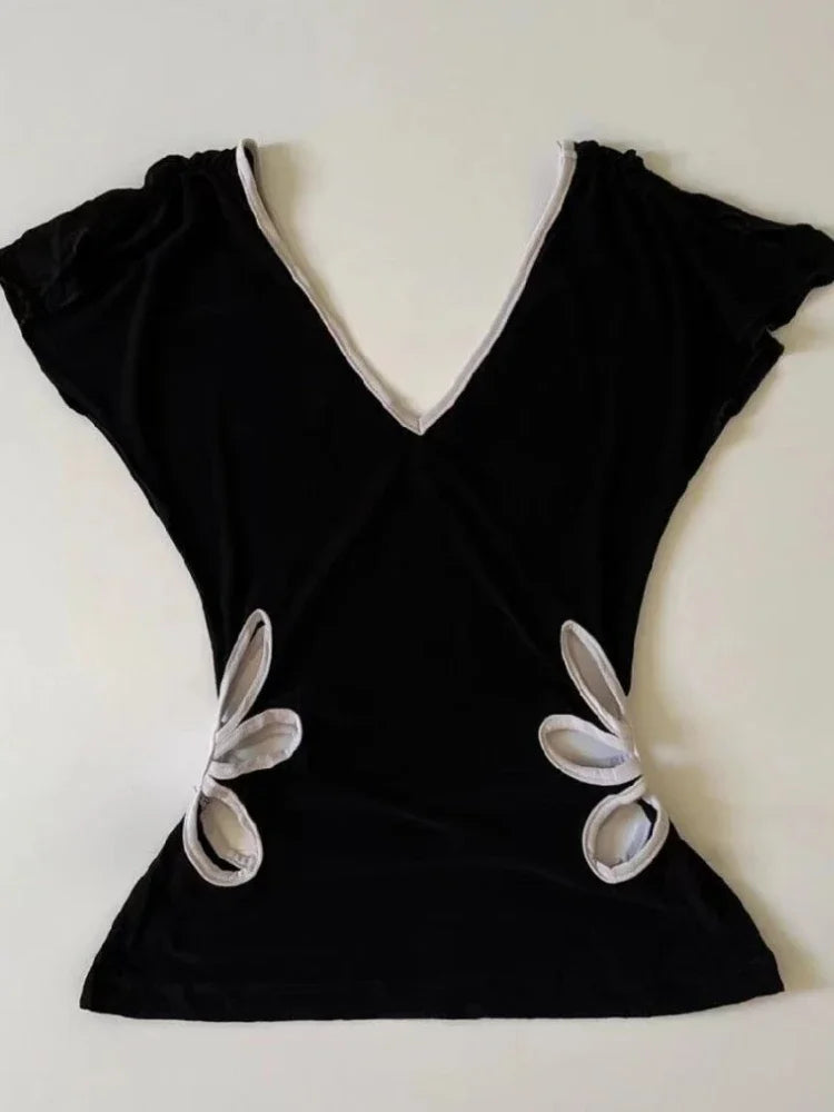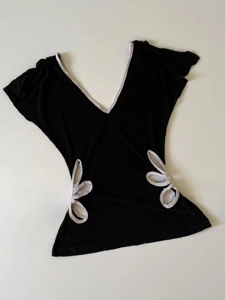 ヴィンテージ 原宿 Vネック バックレス Tシャツ レディース サマー グランジ カジュアル 女性用 Tシャツ パッチワーク Y2K クロップトップ サブカルチャー Tシャツ シック