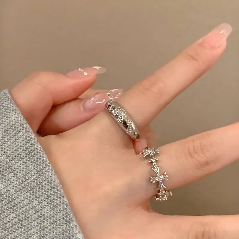 WANZHI 1/2PCS ゴシック ブラック クロス オープンリング レディース メンズ 絶妙なインビュー ダイヤモンドリング ファッション ジュエリー アクセサリー ギフト