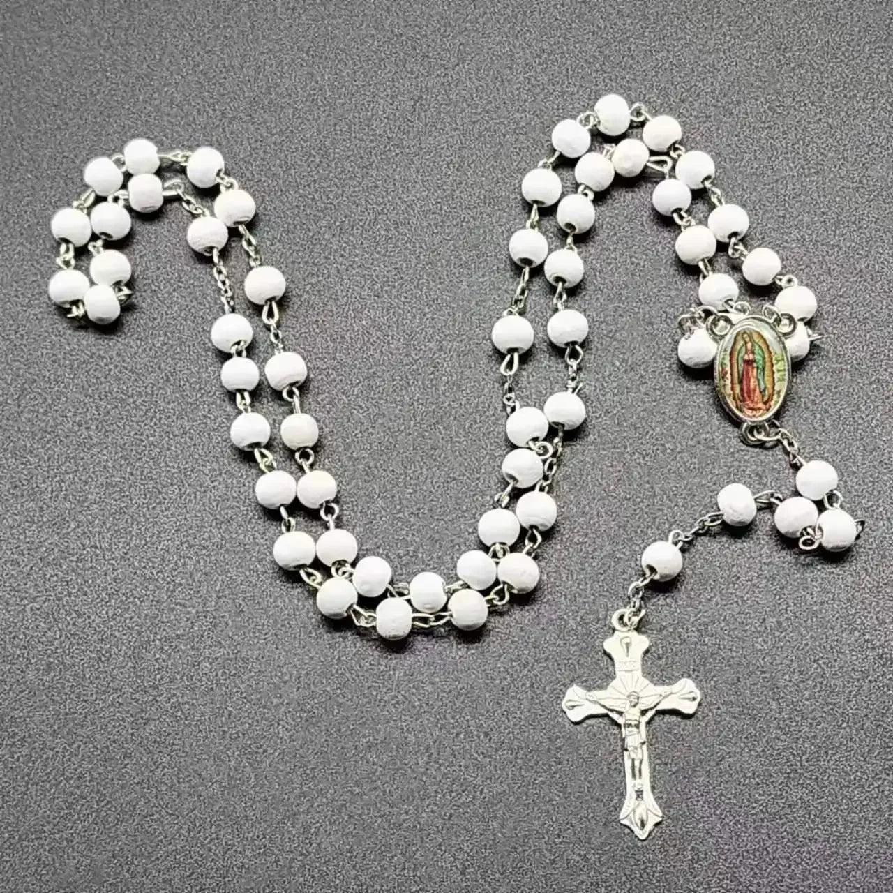 ホワイト木製ロザリオネックレス(女性用、十字架ペンダント、ロングチェーンネックレス、男性用、宗教的カトリックの祈りジュエリー)