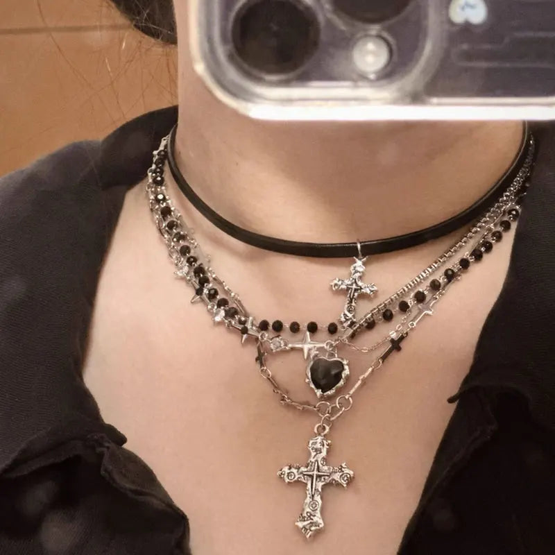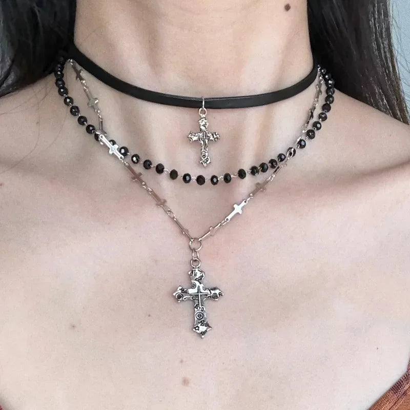 女性・男性・恋人向けヴィンテージ マルチレイヤービーズネックレス ゴシックパンク Y2K メタルクロスペンダントネックレス 90年代 EMO チャームジュエリーギフト